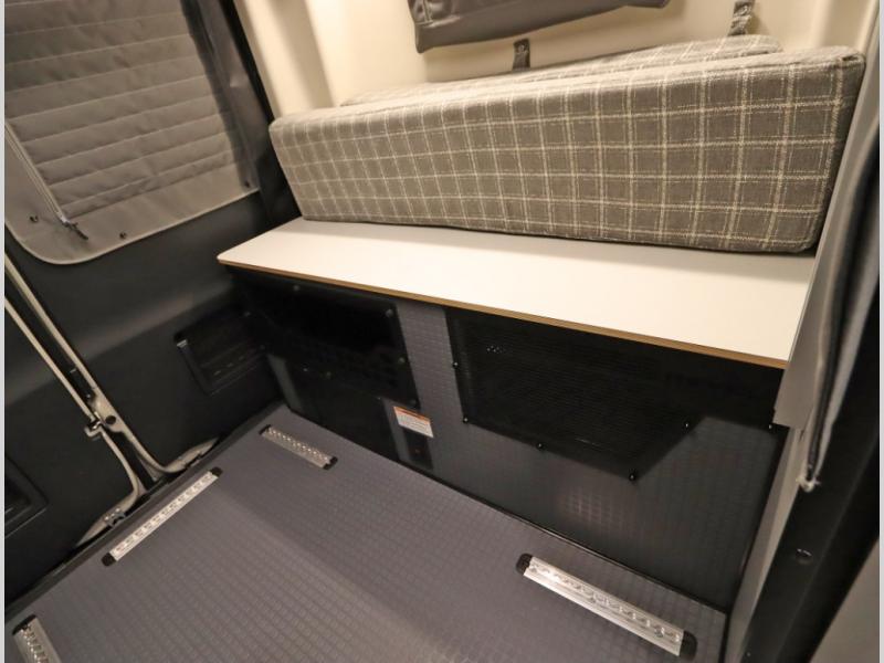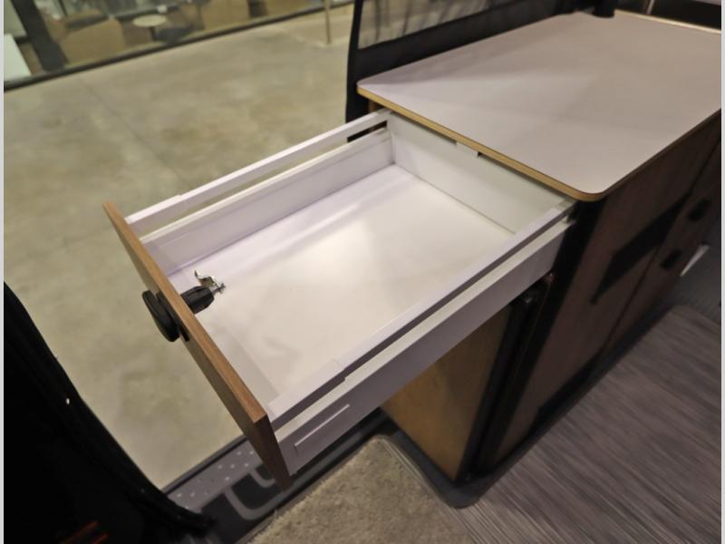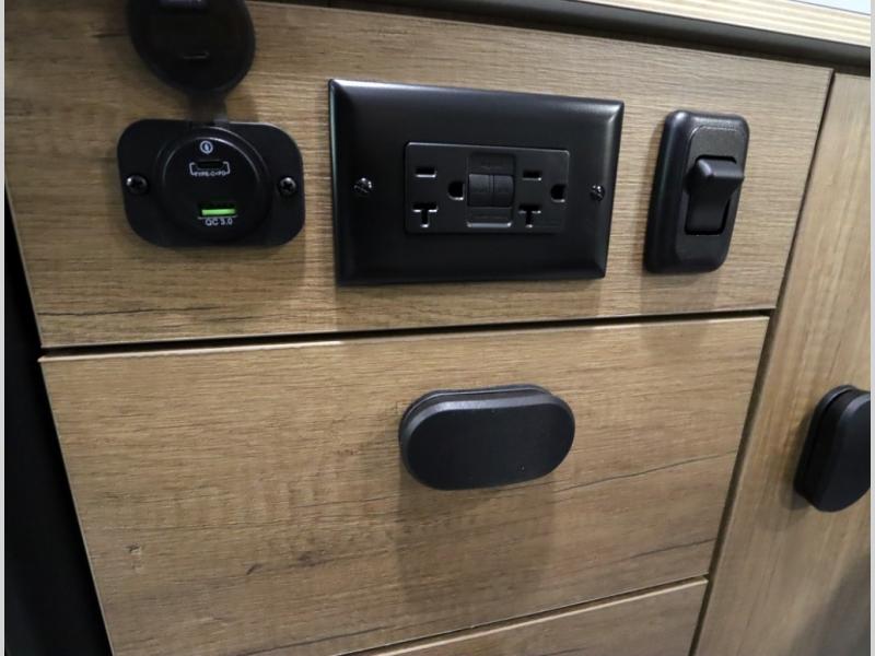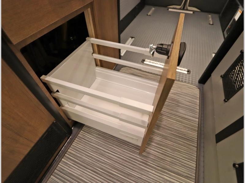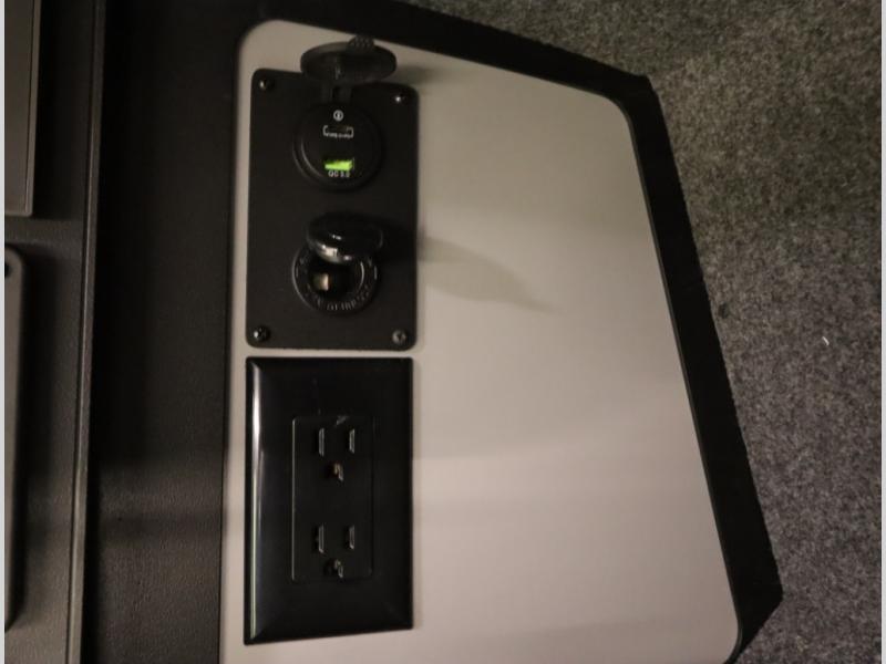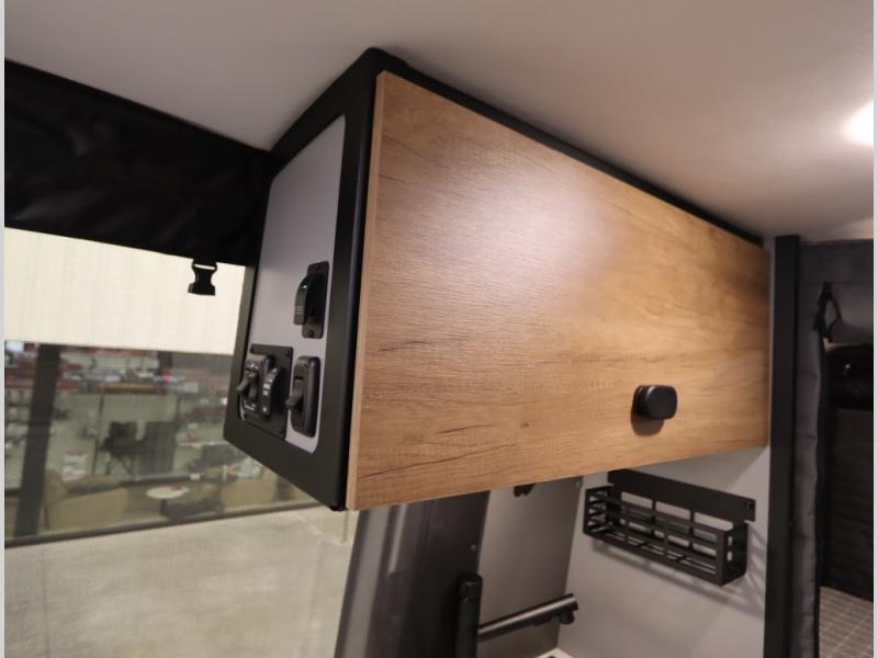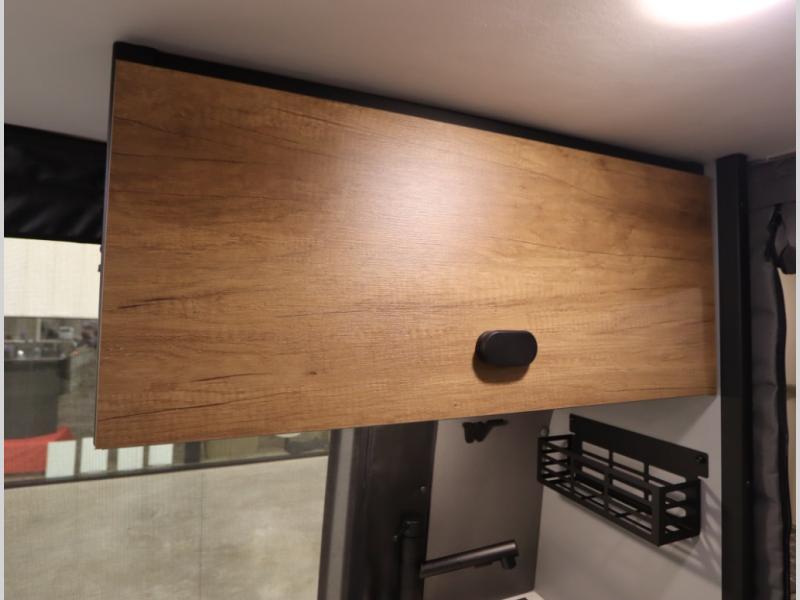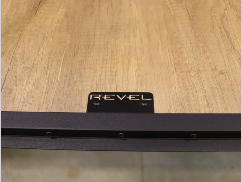 Storage and living space are maximized by the flared body and Power Lift Bed that converts to a sleeping surface. Welded aluminum cabinet face frames, dual pane windows with insulated shades, and an available quieter Mach 10 NDQ AC system all contribute to the Revel's off the grid livability.