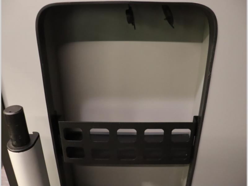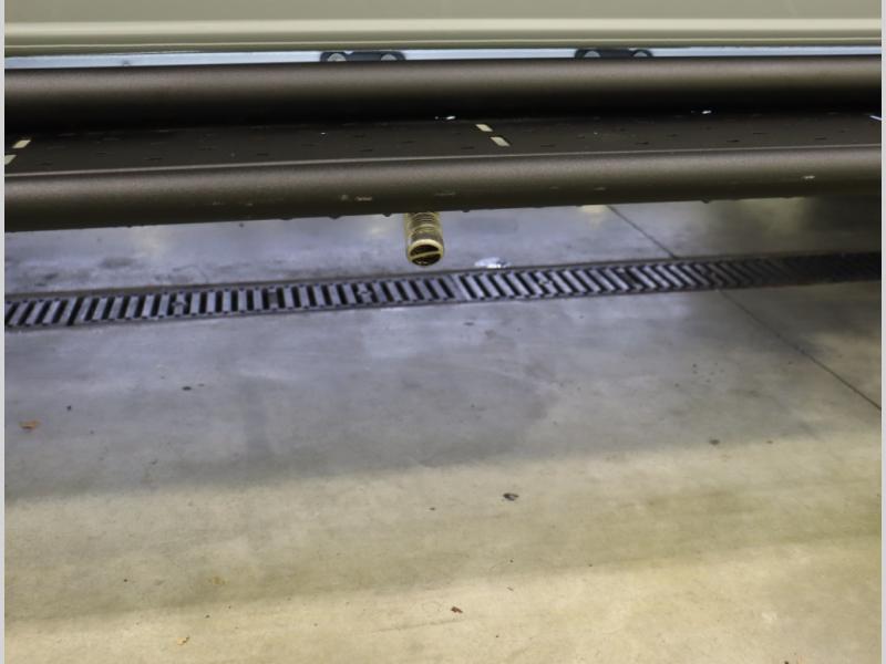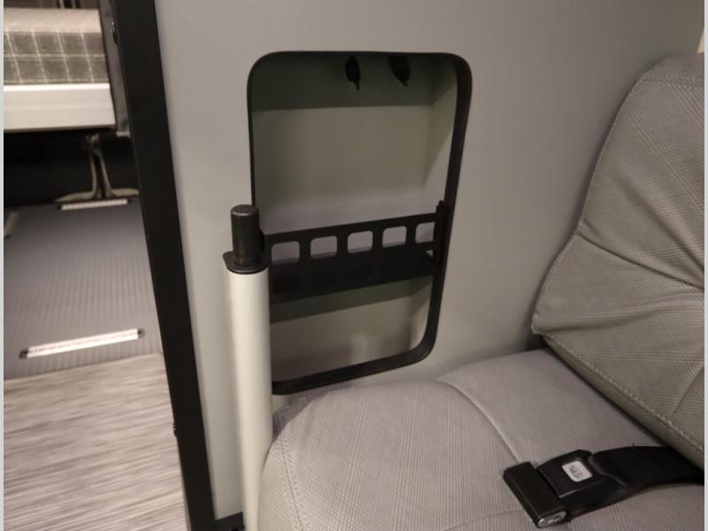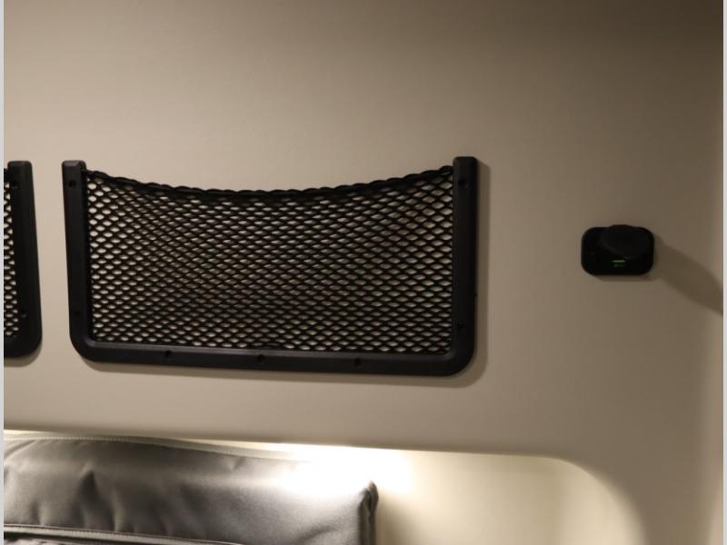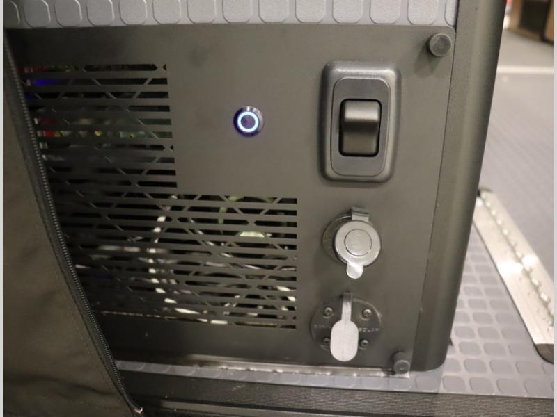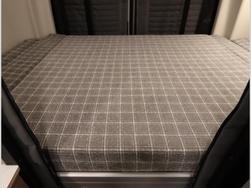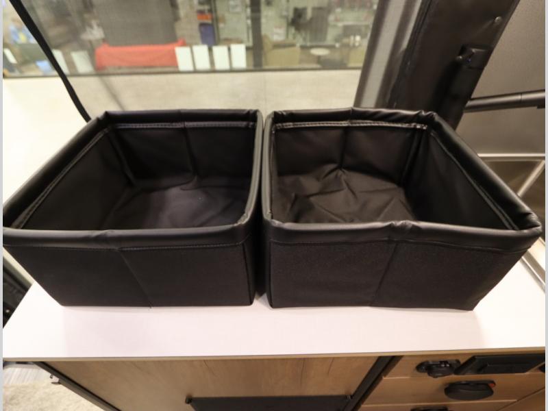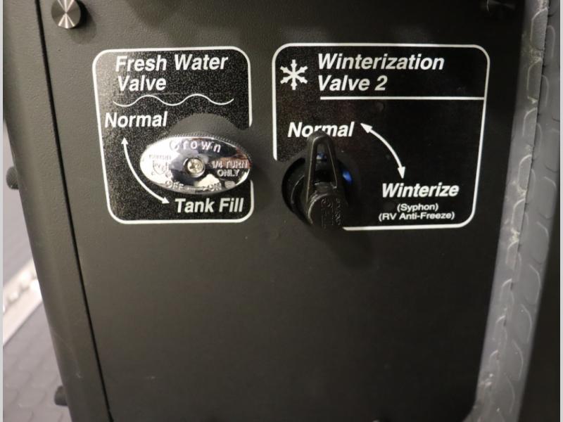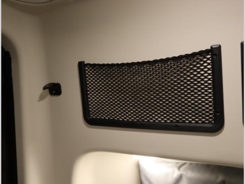 Storage and living space are maximized by the flared body and Power Lift Bed that converts to a sleeping surface. Welded aluminum cabinet face frames, dual pane windows with insulated shades, and an available quieter Mach 10 NDQ AC system all contribute to the Revel's off the grid livability.