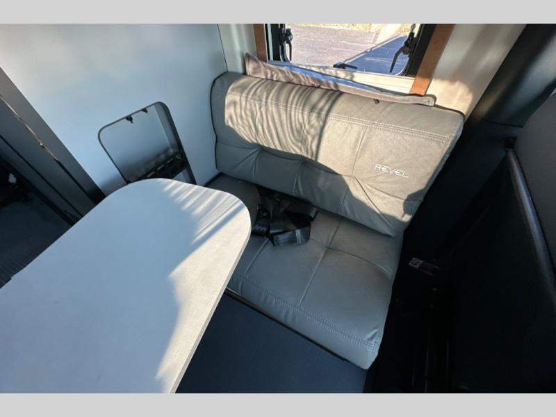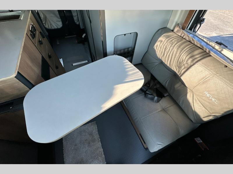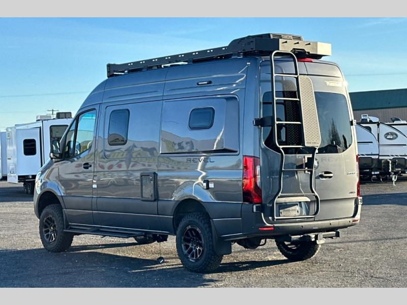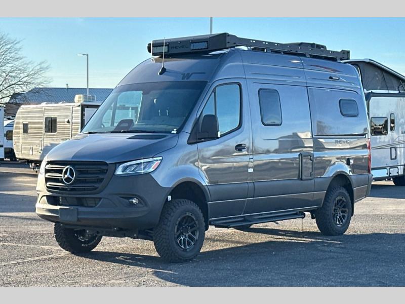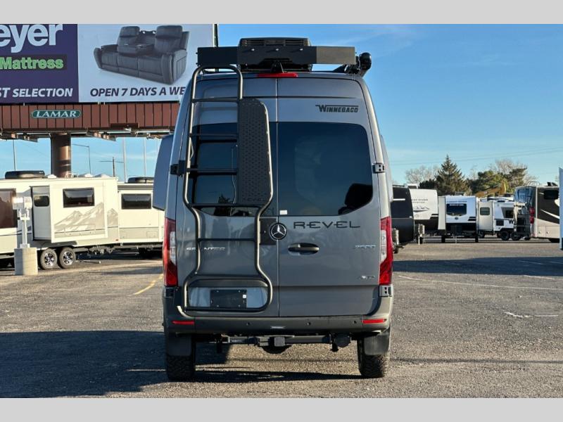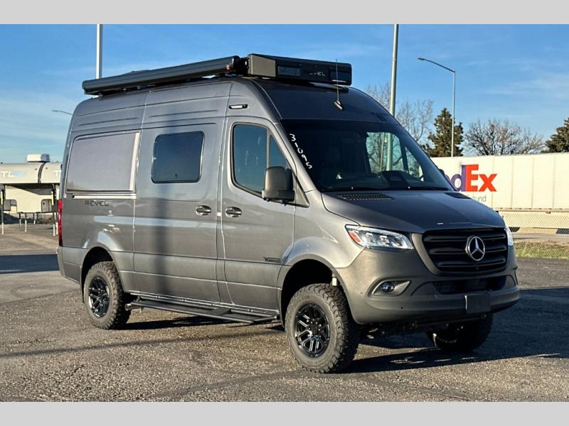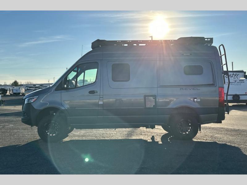 The Revel Class B diesel motorhome allows you to venture off-road thanks to the AWD Sprinter chassis with 2.0L high-output turbo-diesel 4-cylinder under the hood. The Winnebago Power MAX system (8.4kWh Lithionics lithium-ion battery with dual alternator charging capability) and Power Hub Pro which is an exclusive 5-in1 system that delivers off-grid power like nothing before allowing you to stay off-grid for up to 7 days. The interior provides a comfortable and relaxing space featuring modern decor including an updated galley with compression-latch cabinets, a new wall-mounted table, an innovative wet bath, plus a power lift bed with WinnSleep® mattress technology, and the gear garage below the bed features L-track bases for secure and flexible storage, plus cabinet storage and more.