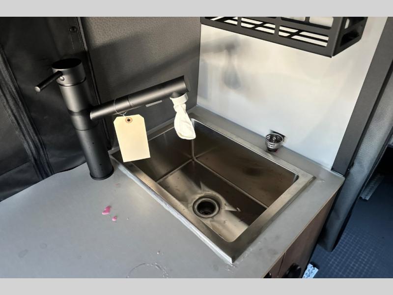 Looking for adventure yet not sure which road you'll take? This camper van offers the outdoor enthusiast a way to venture the unknown. Once at your destination, you can easily set up the interior including a power lift bed in the rear. The cab seats swivel around and there is a bench seat with adjustable table for easy dining opposite. There is even a fold-down outside table to dine outdoors if you want. You will find storage throughout including in the gear garage below the bed where you can store your hiking sticks and backpacks. The cook will have a portable single induction range top, a stainless-steel sink, and a counter extension for more prep space plus a refrigerator below the counter. There is also a wet bath to stay clean and refreshed!