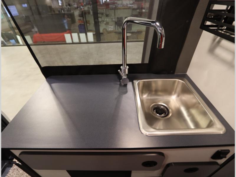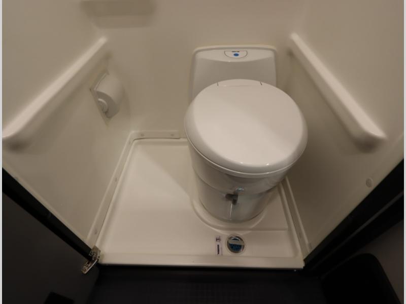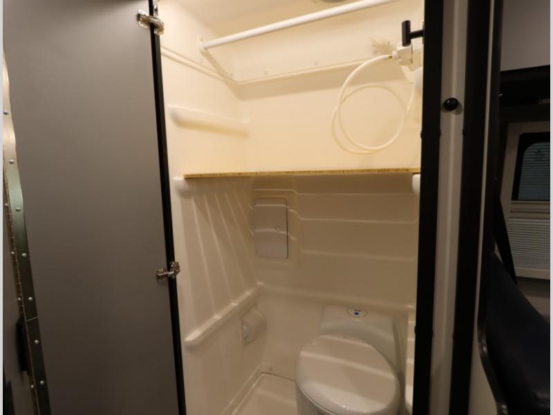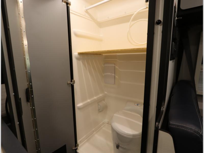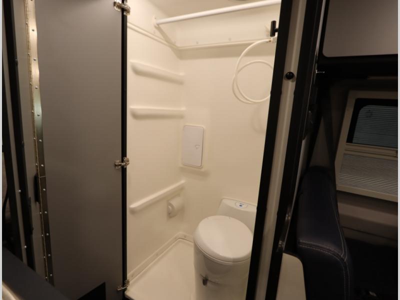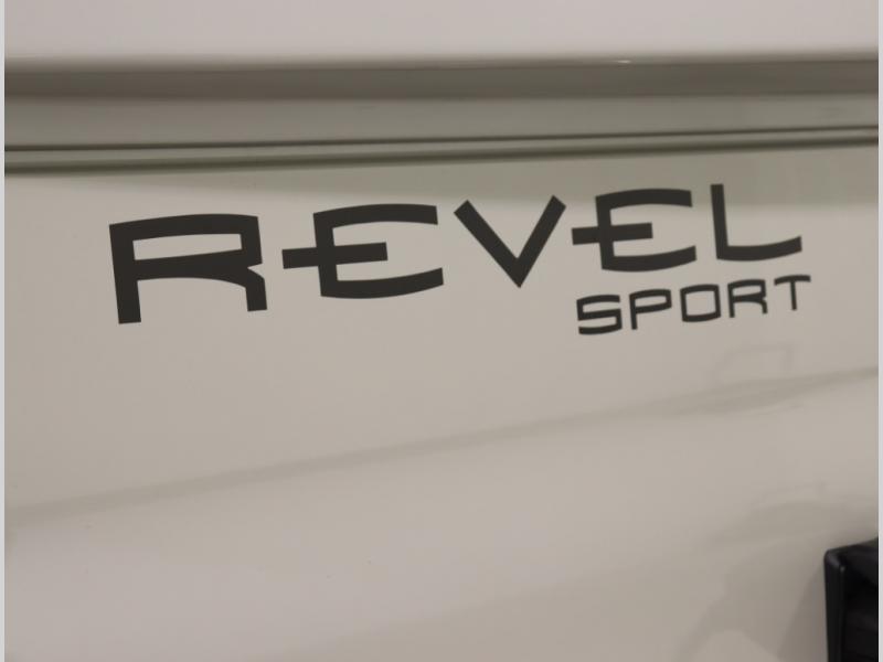 Inside, the Revel’s unique features start with a floorplan designed around a Power Lift Bed with gear garage below. This allows for a 49 x 79 inch cross coach sleeping area. A full galley, including a larger refrigerator, makes meal prep a breeze, while the all in one bath and gear closet boasts a cassette style toilet that eliminates the need for a separate black water holding tank.