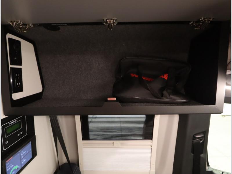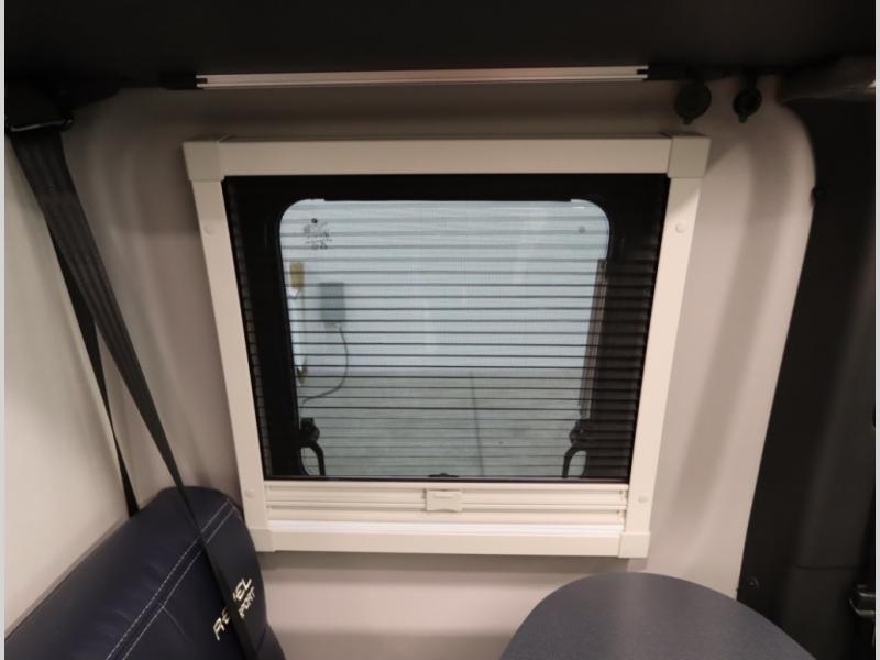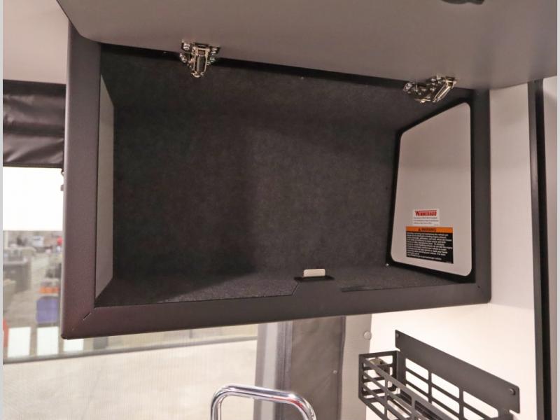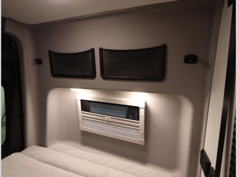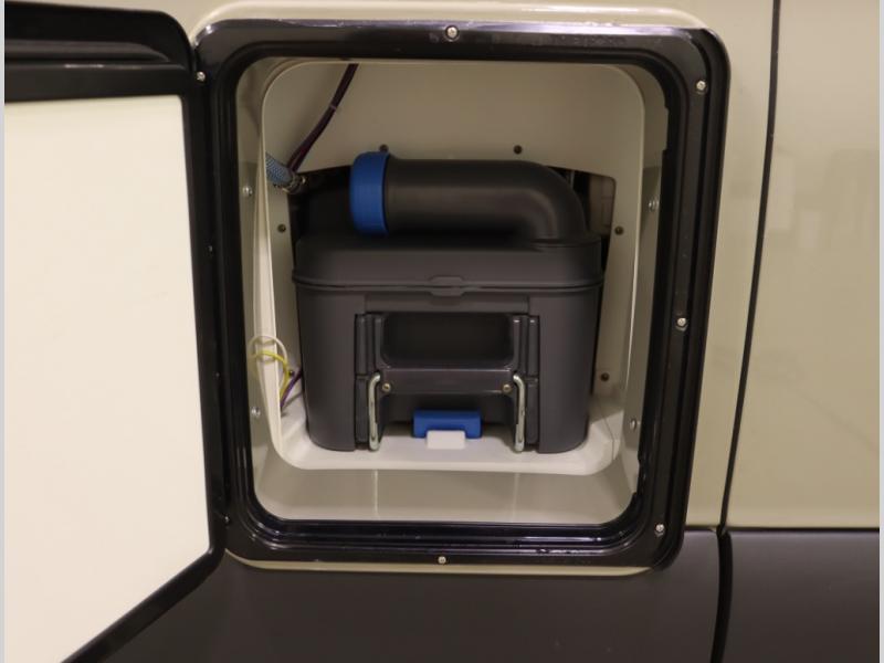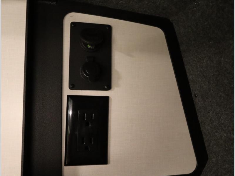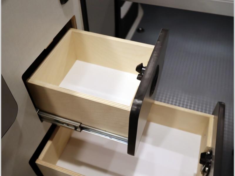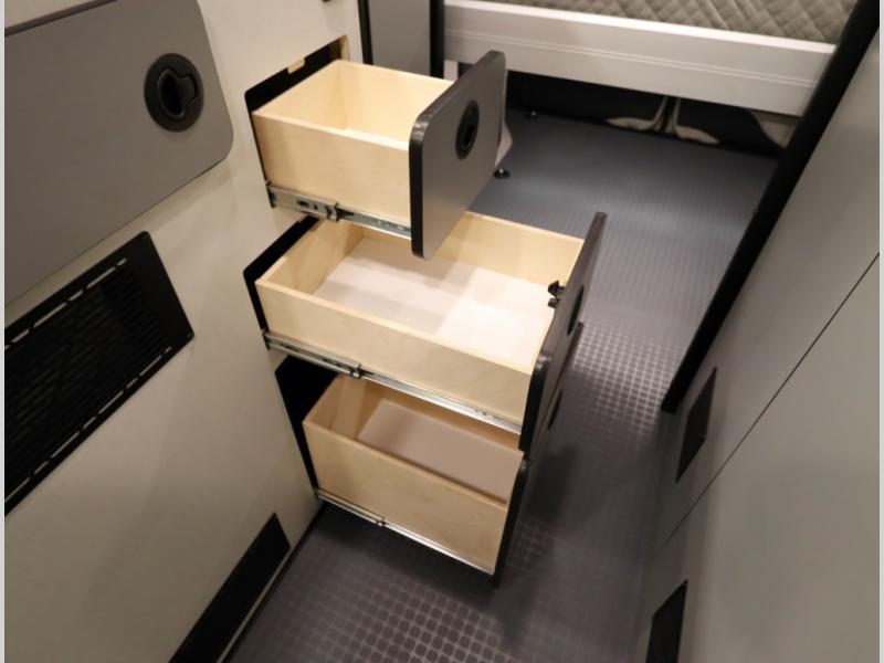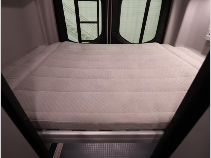 Storage and living space are maximized by the flared body and Power Lift Bed that converts to a 49 x 79 inch sleeping surface. Welded aluminum cabinet face frames, dual pane windows with insulated shades, and an available quieter Mach 10 NDQ AC system all contribute to the Revel's off the grid livability.