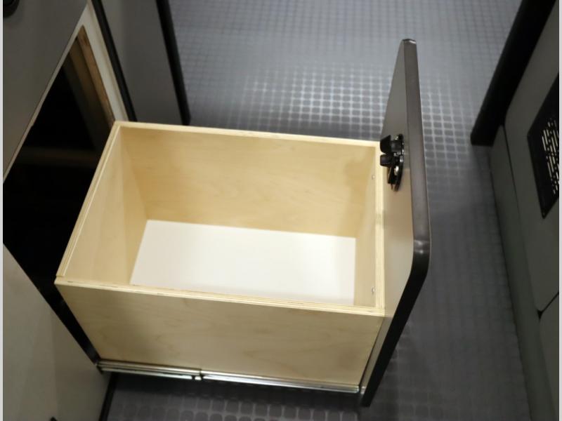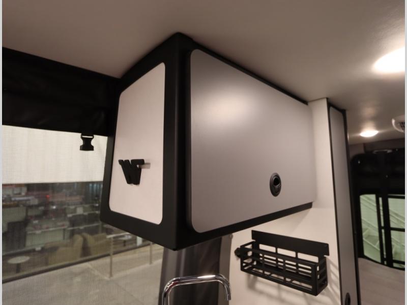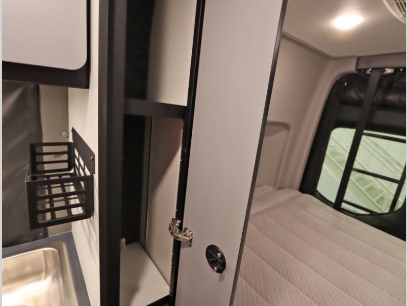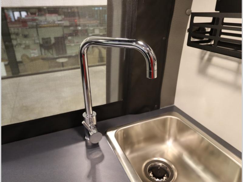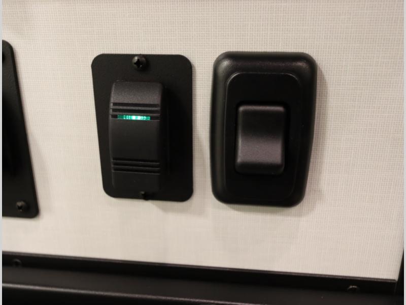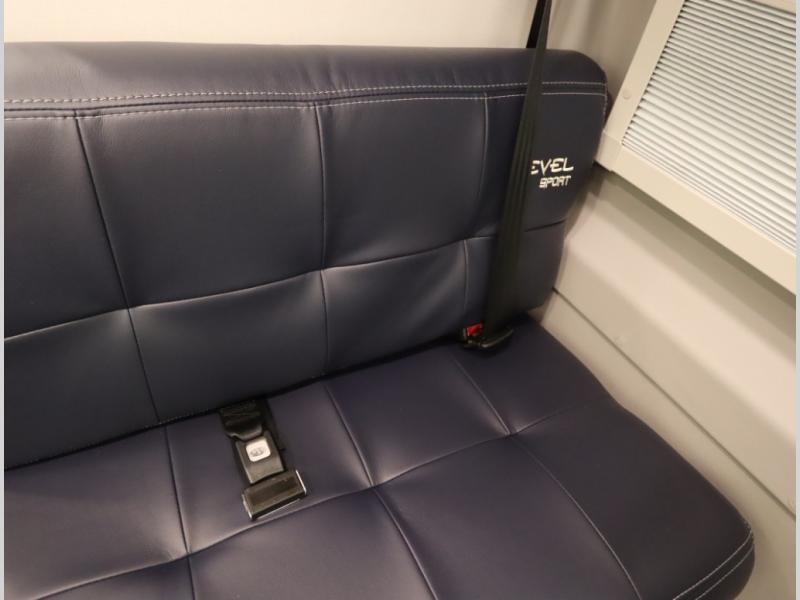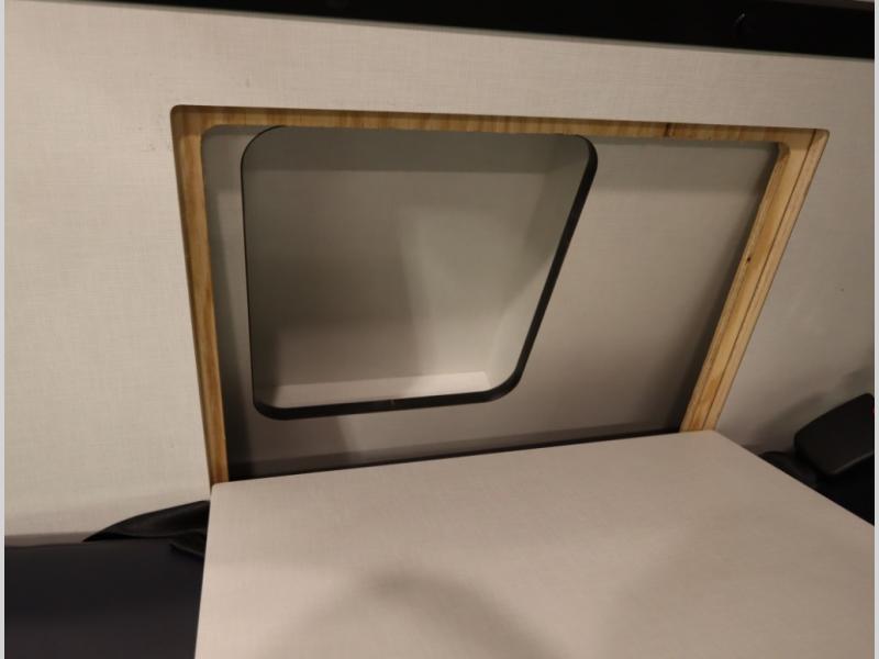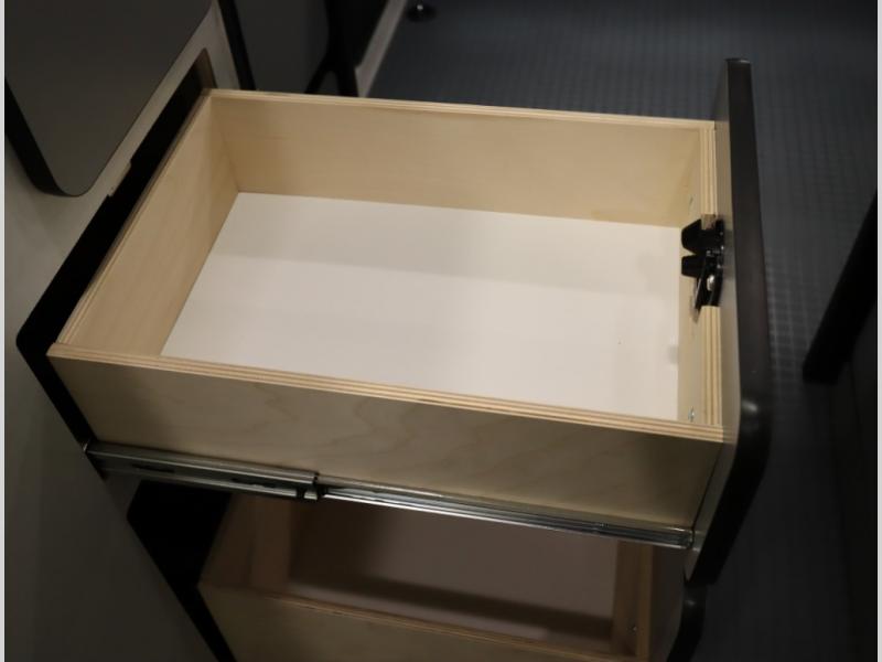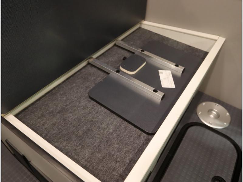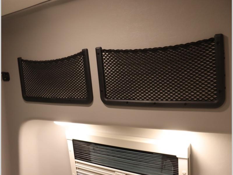 Storage and living space are maximized by the flared body and Power Lift Bed that converts to a 49 x 79 inch sleeping surface. Welded aluminum cabinet face frames, dual pane windows with insulated shades, and an available quieter Mach 10 NDQ AC system all contribute to the Revel's off the grid livability.