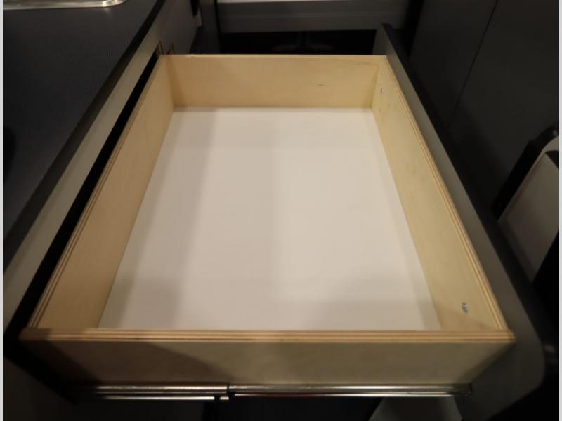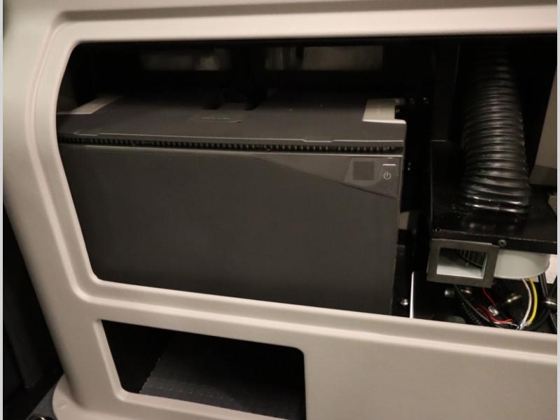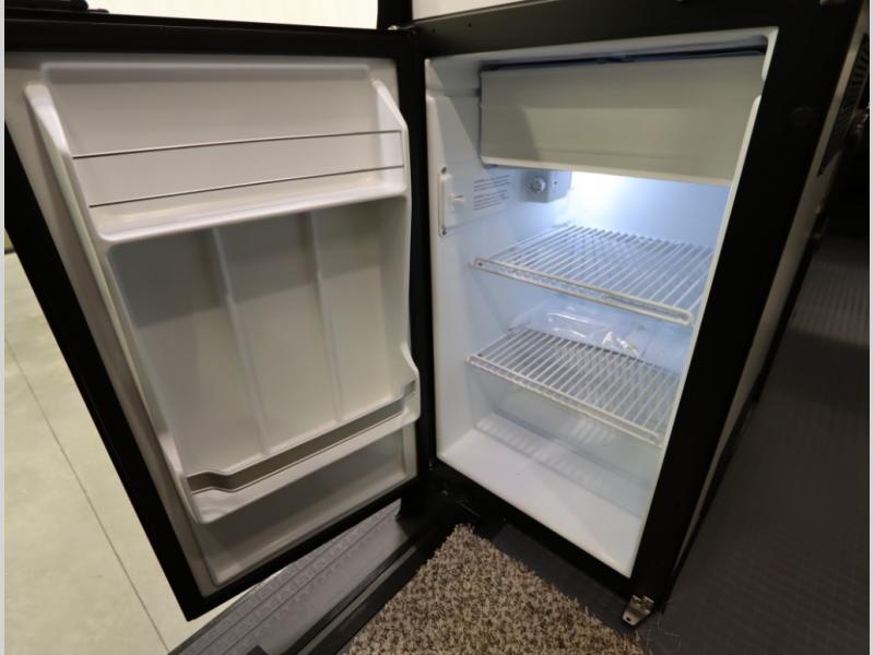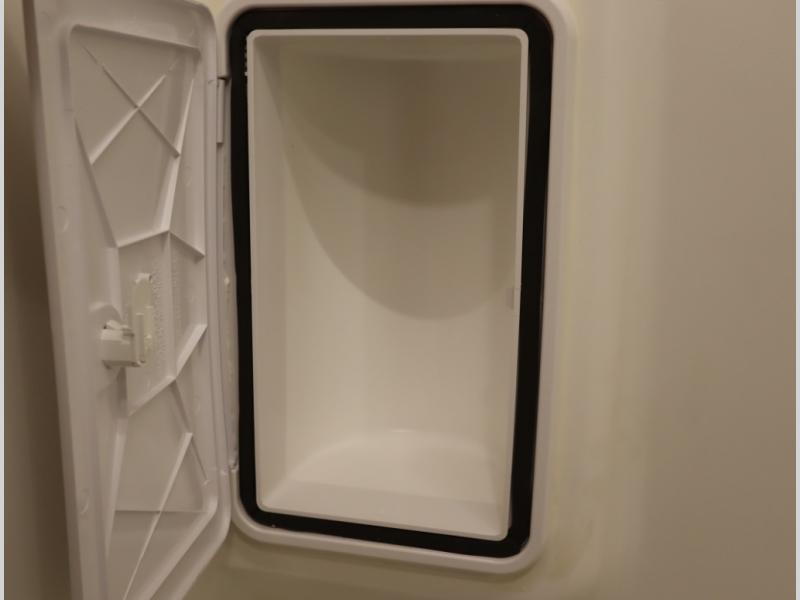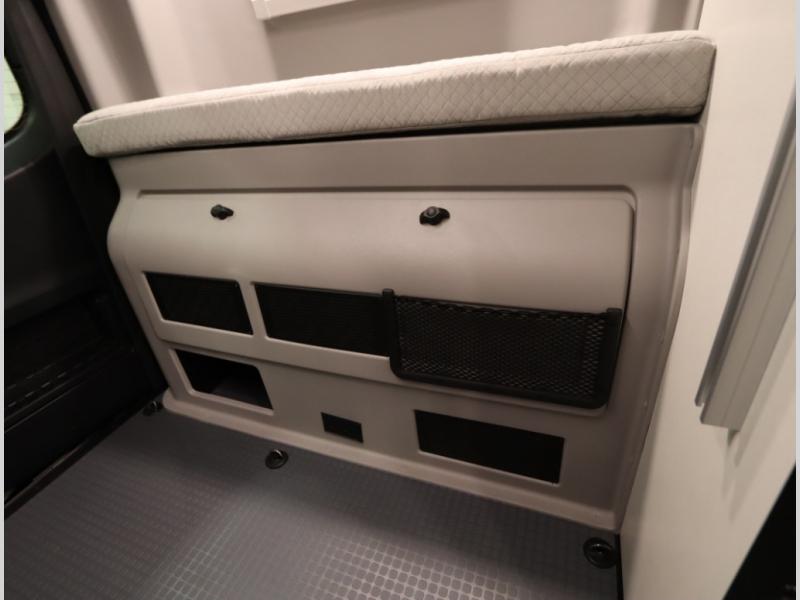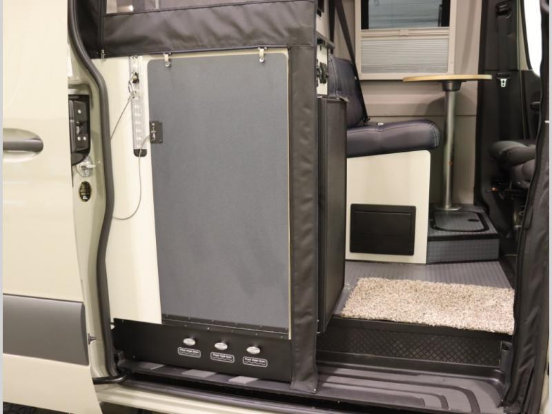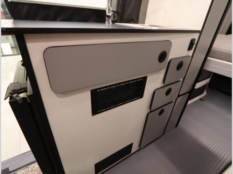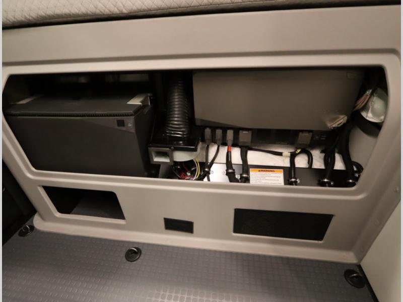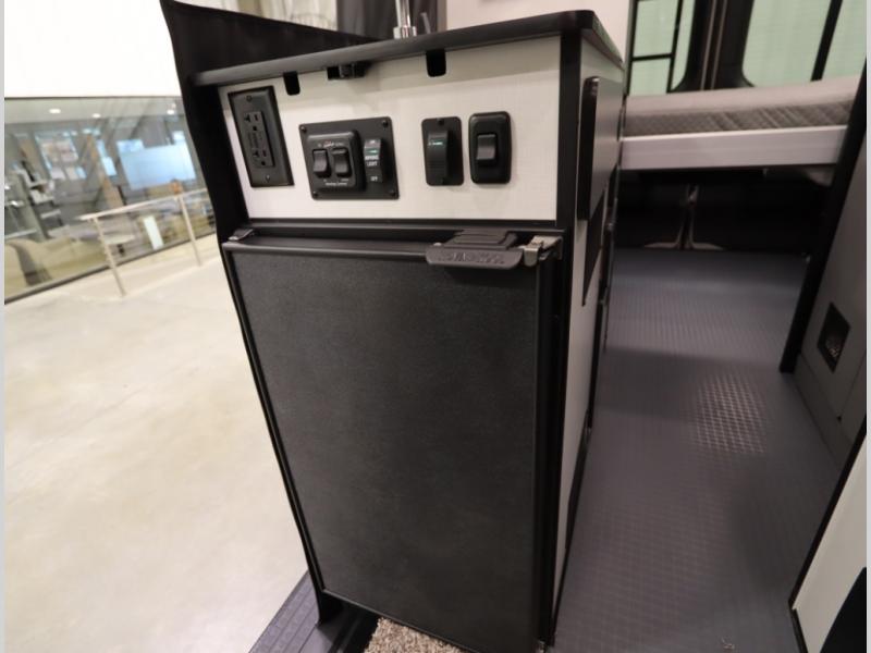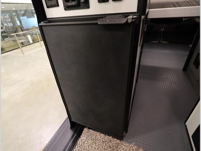 2. A larger compressor driven refrigerator is now included and turned forward facing, towards the cargo door area for convenient access inside or outside the van