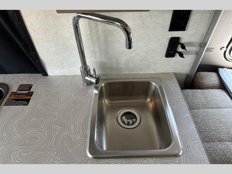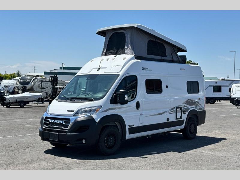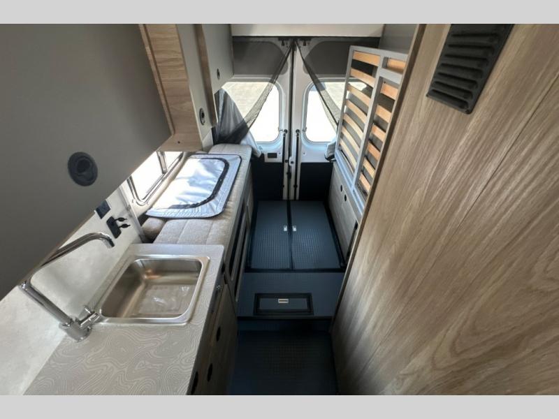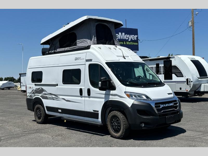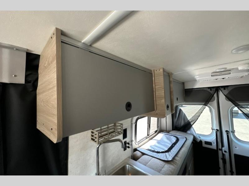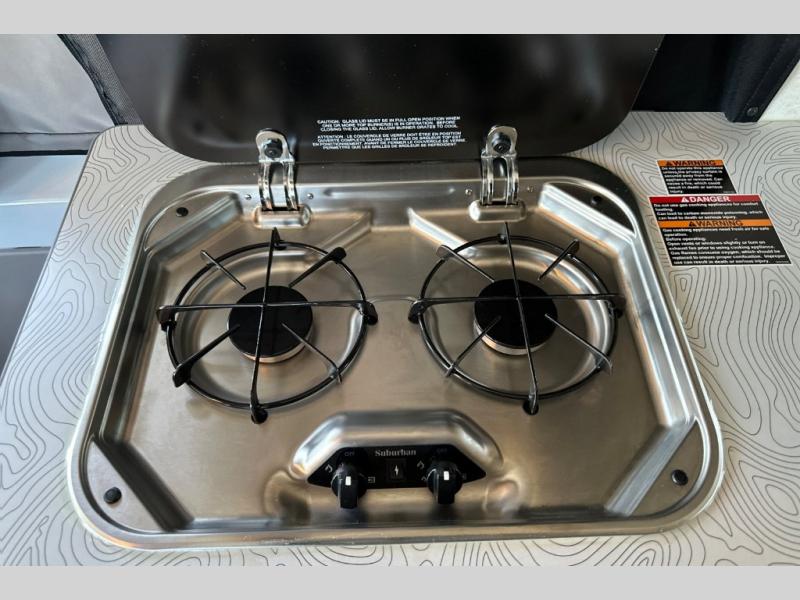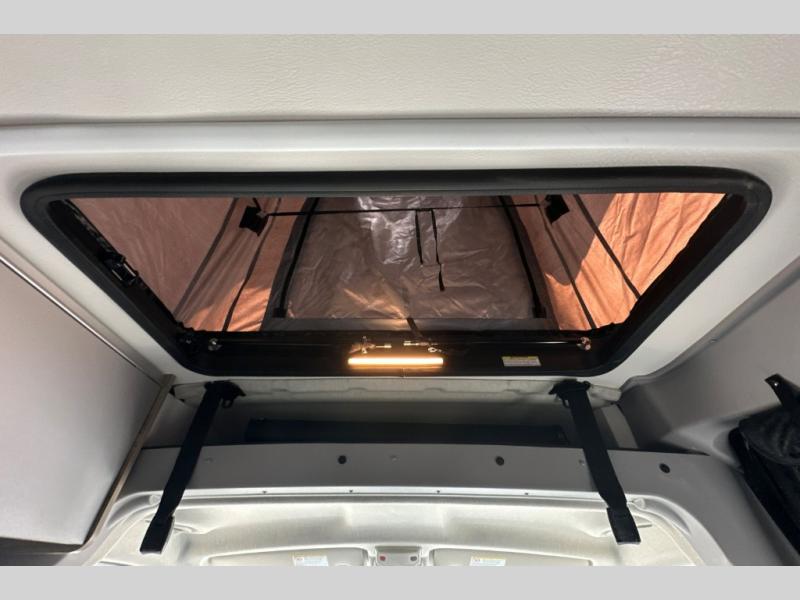 Enjoy a weekend ride in the mountains or make it an overnight stay with versatile sleeping options in this camper van. You'll find the Murphy+ bed in the back will provide a great night's rest, or you can choose the optional sofa/bed with added belted seating if you have more tag-alongs. And of course the little ones will love the pop-top sleeping area to climb into each night. After you've freshened up in the convenient wet bath, prepare breakfast on the two burner range, and the milk and eggs can go back in the 3.0 cu. ft. single door refrigerator/freezer. This model also includes rear double doors with screens to let the breeze in and keep bugs out!