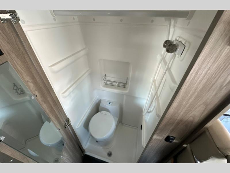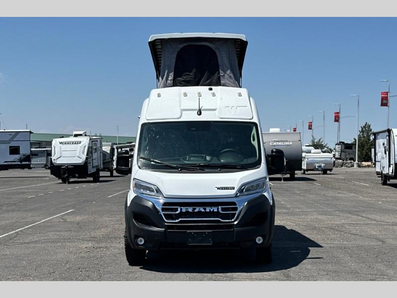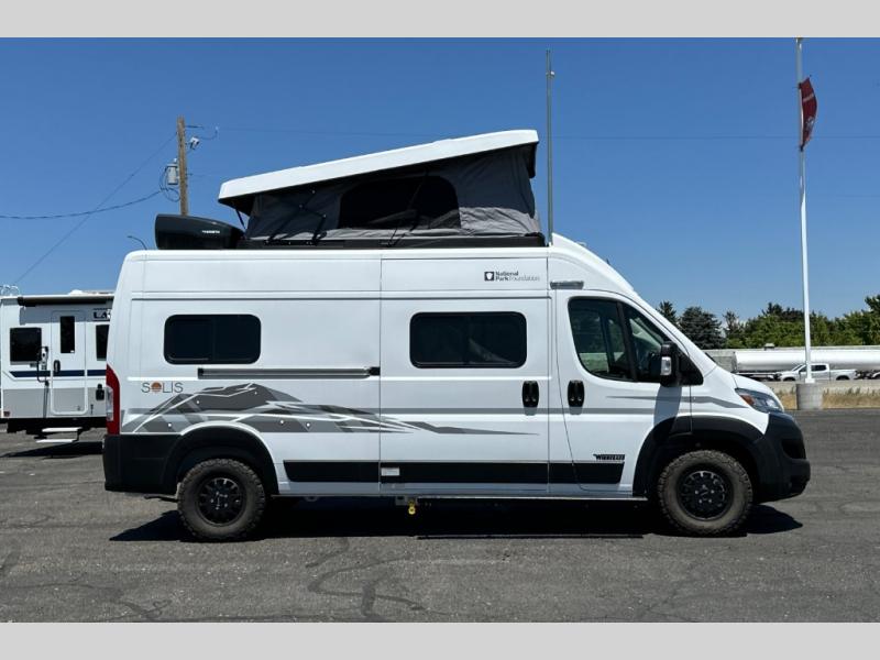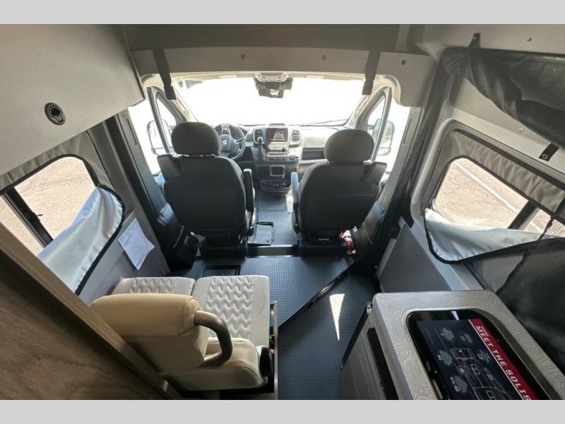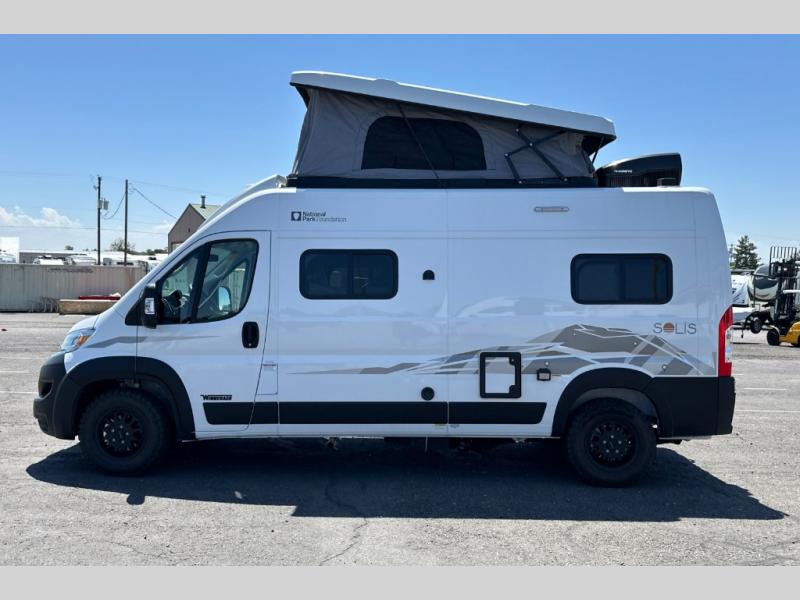 Each Solis Class B gas motorhome by Winnebago sits upon a fuel-efficient Ram ProMaster chassis with a 3.6L V6 engine to power your adventures. You will love the cab conveniences that make each trip enjoyable, like the radio/review monitor system touchscreen and the crosswind assist to keep you steady on the road. Some of the hassle-free amenities you will appreciate are the exterior wash station, the Eco-Hot water system, and the water center control panel located inside the right rear door. Head indoors to find heavy-duty vinyl flooring throughout, a laminate countertop and a stainless steel sink in the galley, plus tinted coach windows for added privacy. The Solis also features off-grid capabilities with its two deep-cycle Group 31 batteries and 220-watt flexible surface solar panel with a controller. Adventures awaits in the Solis Class B gas motorhome!