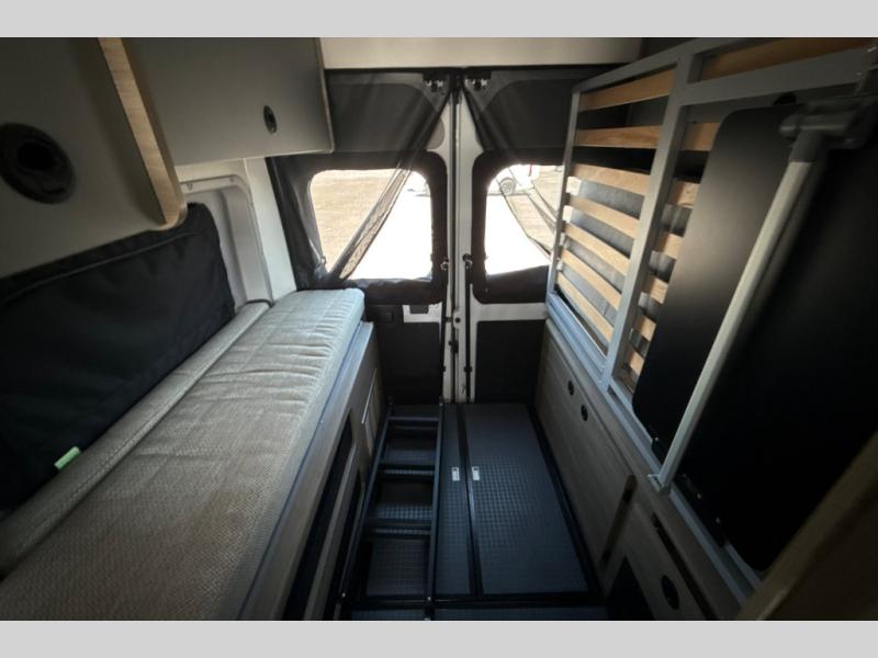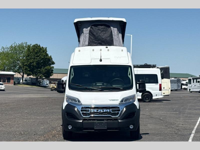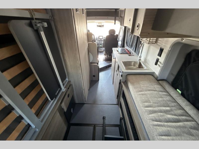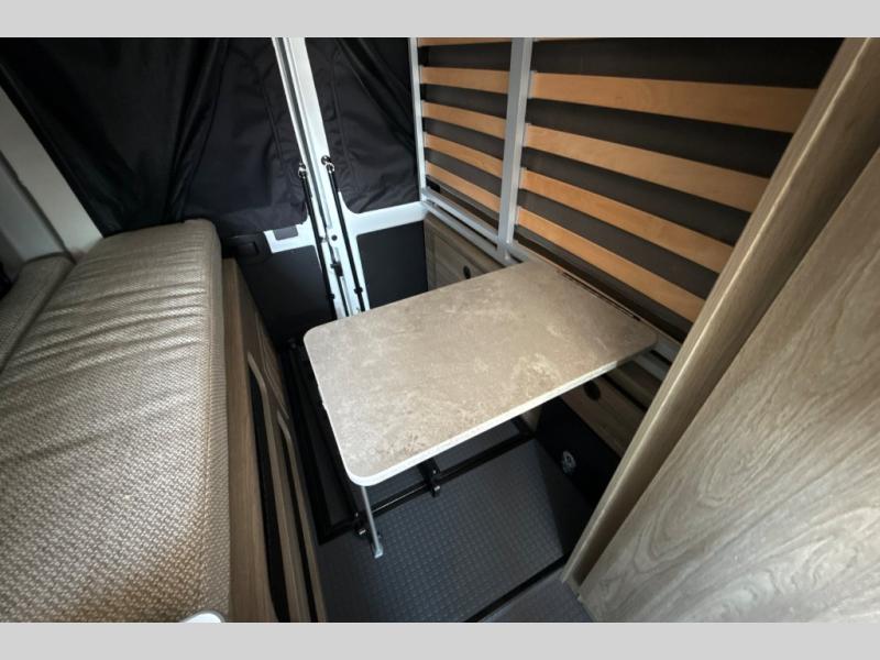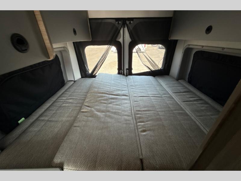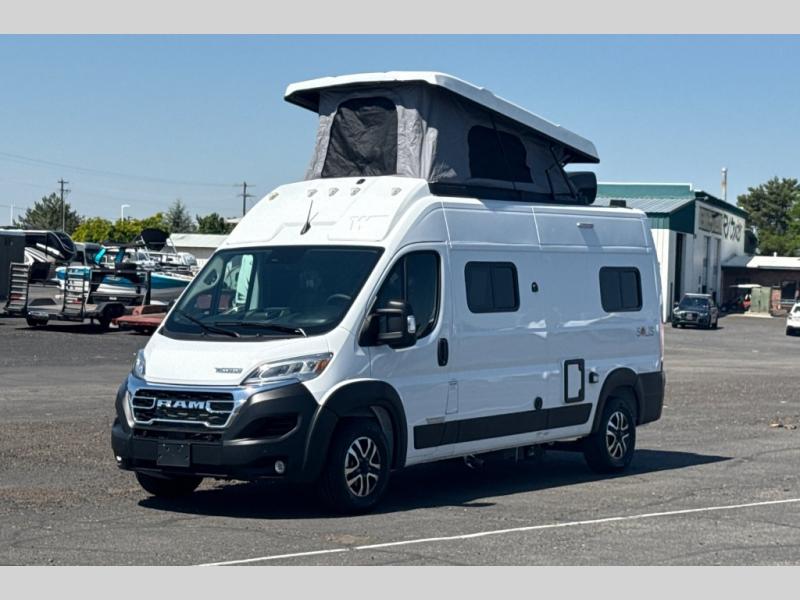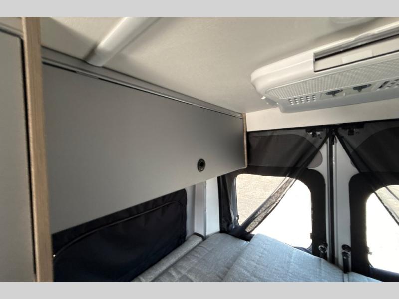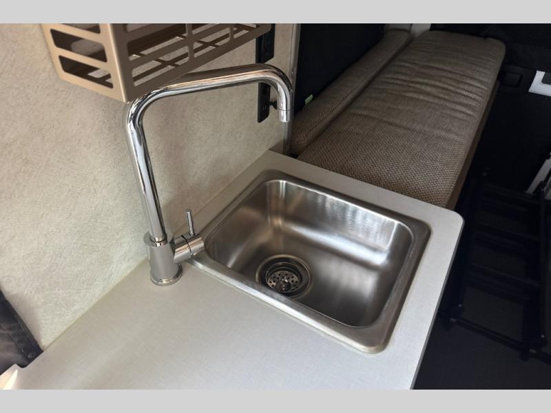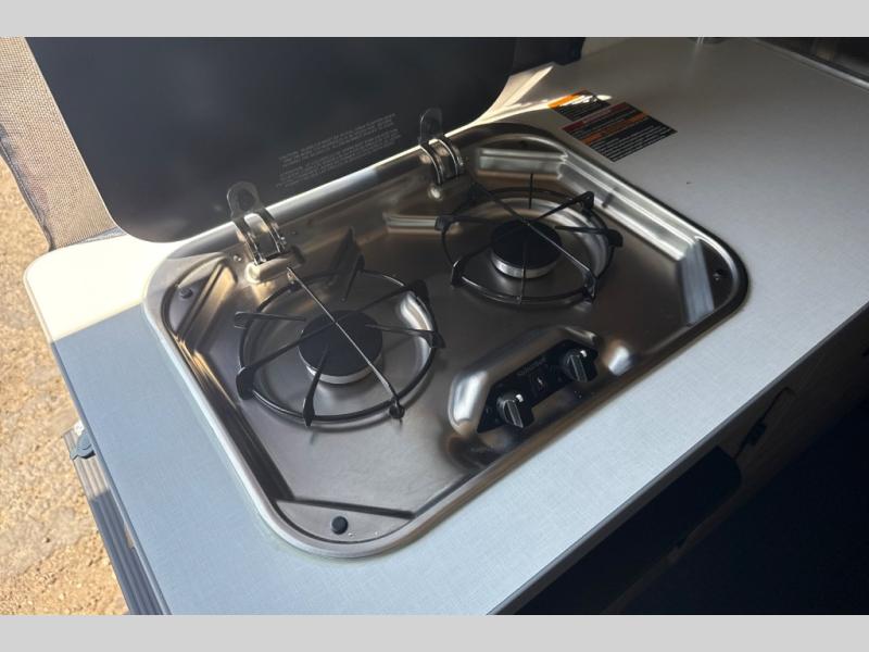Enjoy a weekend ride in the mountains or make it an overnight stay with versatile sleeping options in this camper van. You'll find the Murphy+ bed in the back will provide a great night's rest, or you can choose the optional sofa/bed with added belted seating if you have more tag-alongs. And of course the little ones will love the pop-top sleeping area to climb into each night. After you've freshened up in the convenient wet bath, prepare breakfast on the two burner range, and the milk and eggs can go back in the 3.0 cu. ft. single door refrigerator/freezer. This model also includes rear double doors with screens to let the breeze in and keep bugs out!