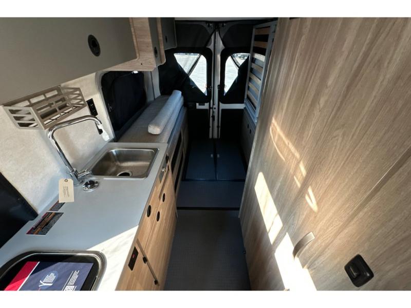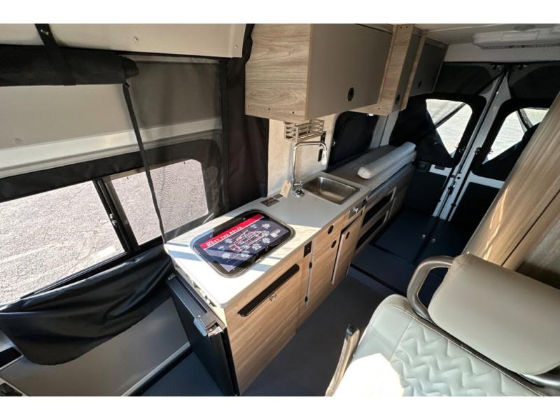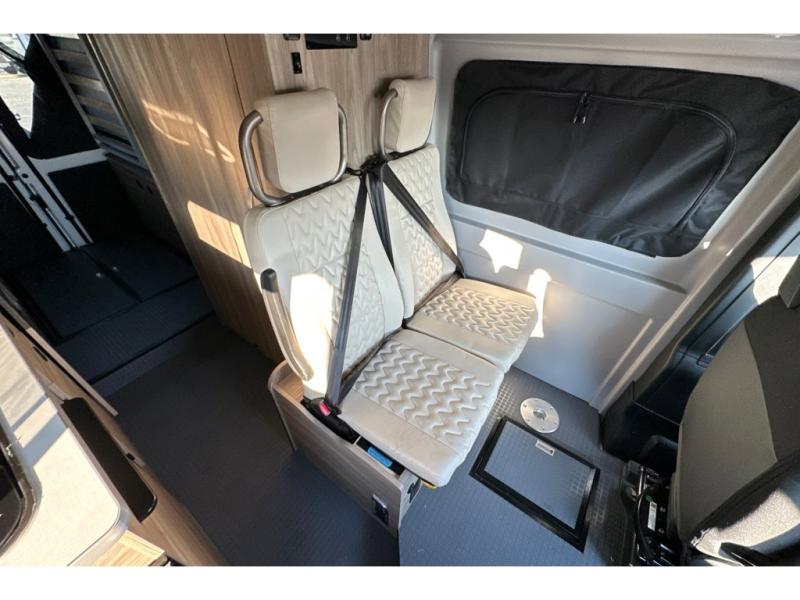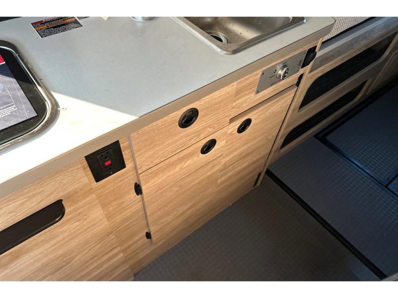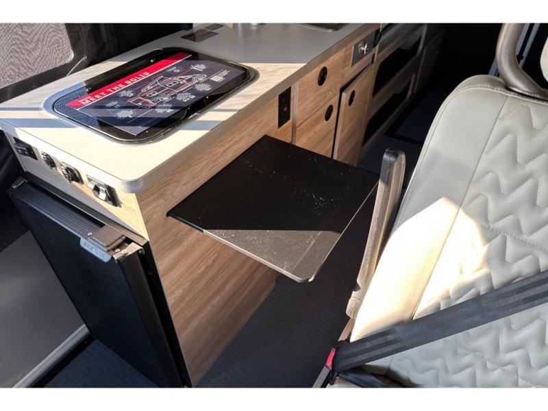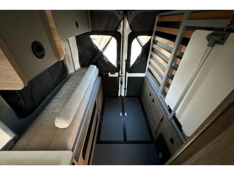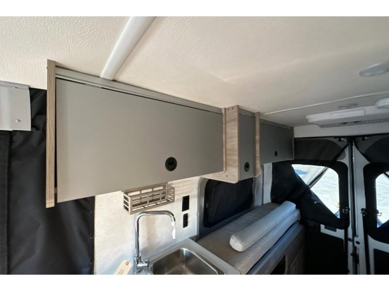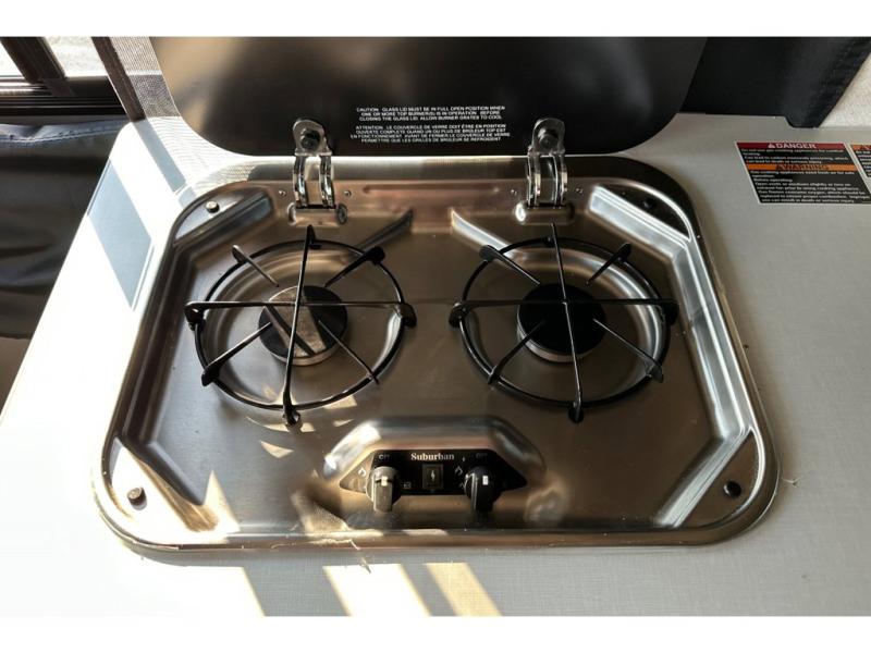Enjoy a weekend ride in the mountains or make it an overnight stay with versatile sleeping options in this camper van. You'll find the Murphy+ bed in the back will provide a great night's rest, or you can choose the optional sofa/bed with added belted seating if you have more tag-alongs. And of course the little ones will love the pop-top sleeping area to climb into each night. After you've freshened up in the convenient wet bath, prepare breakfast on the two burner range, and the milk and eggs can go back in the 3.0 cu. ft. single door refrigerator/freezer. This model also includes rear double doors with screens to let the breeze in and keep bugs out!