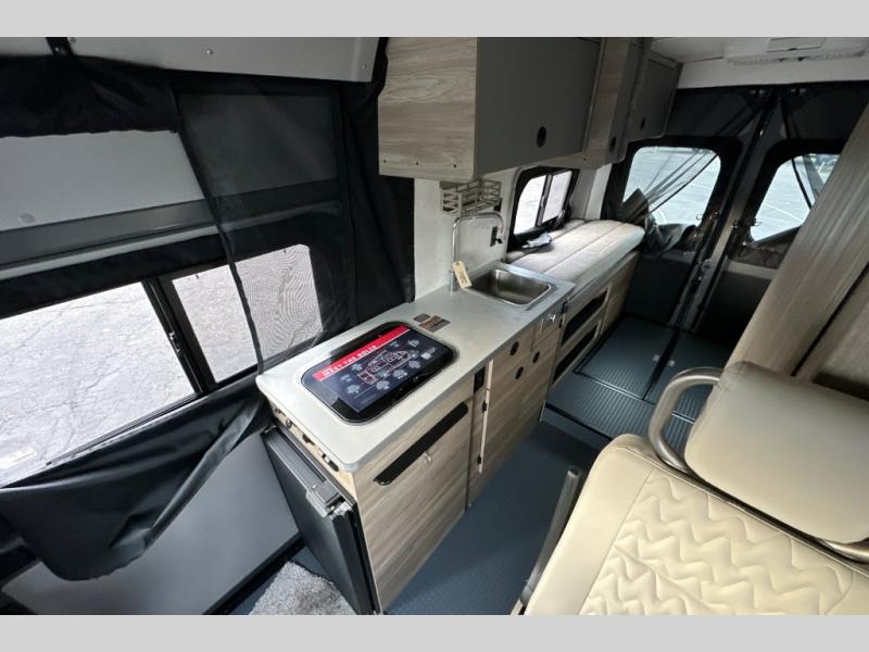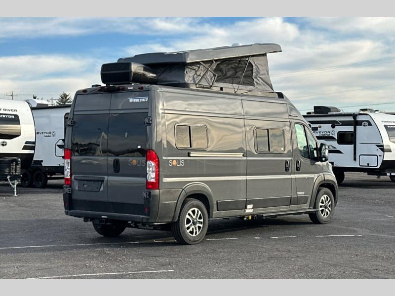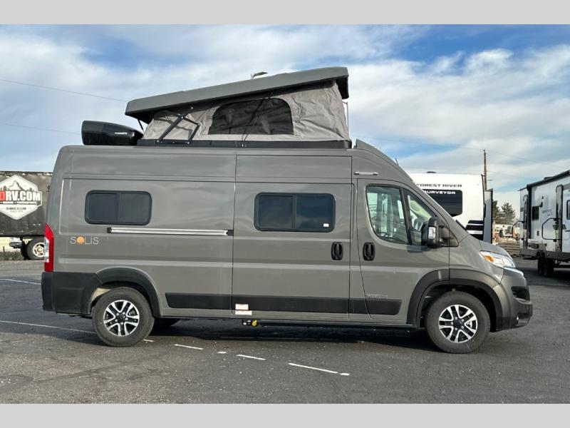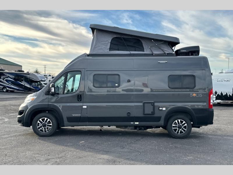 Each Solis Class B gas motorhome by Winnebago sits upon a fuel-efficient Ram ProMaster chassis with a 3.6L V6 engine to power your adventures. You will love the cab conveniences that make each trip enjoyable, like the radio/review monitor system touchscreen and the crosswind assist to keep you steady on the road. Some of the hassle-free amenities you will appreciate are the exterior wash station, the Eco-Hot water system, and the water center control panel located inside the right rear door. Head indoors to find heavy-duty vinyl flooring throughout, a laminate countertop and a stainless steel sink in the galley, plus tinted coach windows for added privacy. The Solis also features off-grid capabilities with its two deep-cycle Group 31 batteries and 220-watt flexible surface solar panel with a controller. Adventures awaits in the Solis Class B gas motorhome!