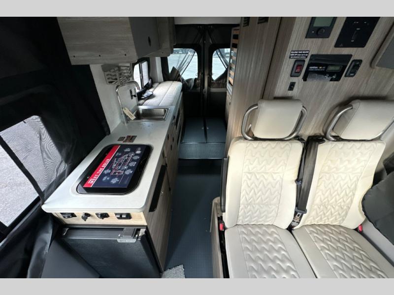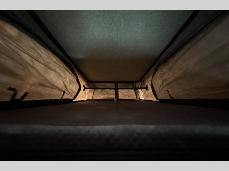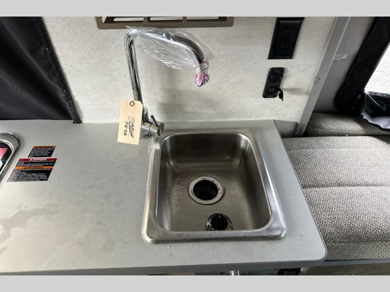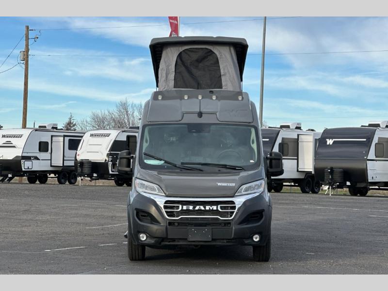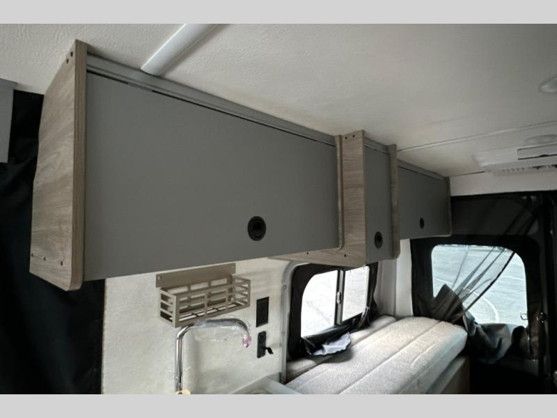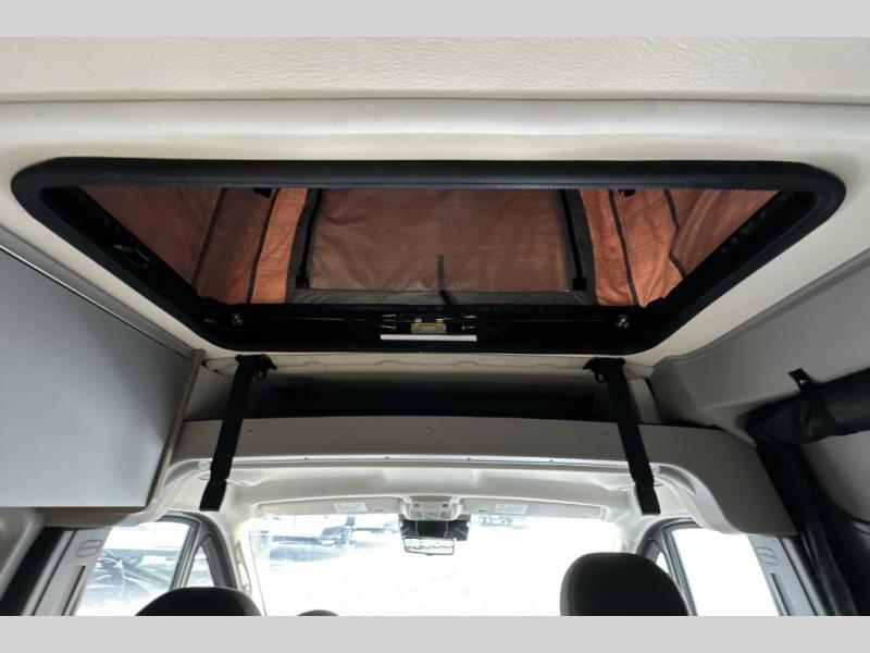 Enjoy a weekend ride in the mountains or make it an overnight stay with versatile sleeping options in this camper van. You'll find the Murphy+ bed in the back will provide a great night's rest, or you can choose the optional sofa/bed with added belted seating if you have more tag-alongs. And of course the little ones will love the pop-top sleeping area to climb into each night. After you've freshened up in the convenient wet bath, prepare breakfast on the two burner range, and the milk and eggs can go back in the 3.0 cu. ft. single door refrigerator/freezer. This model also includes rear double doors with screens to let the breeze in and keep bugs out!