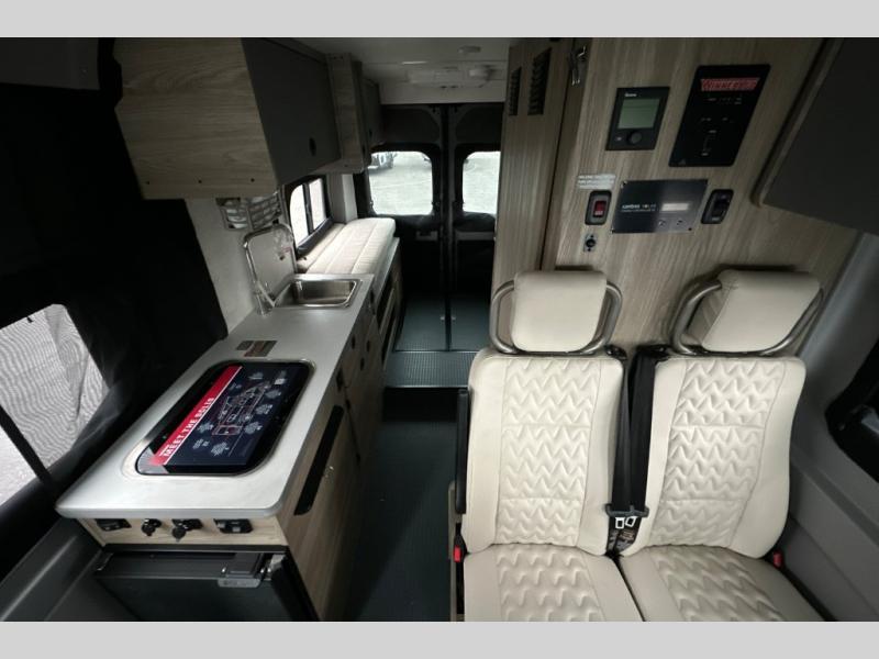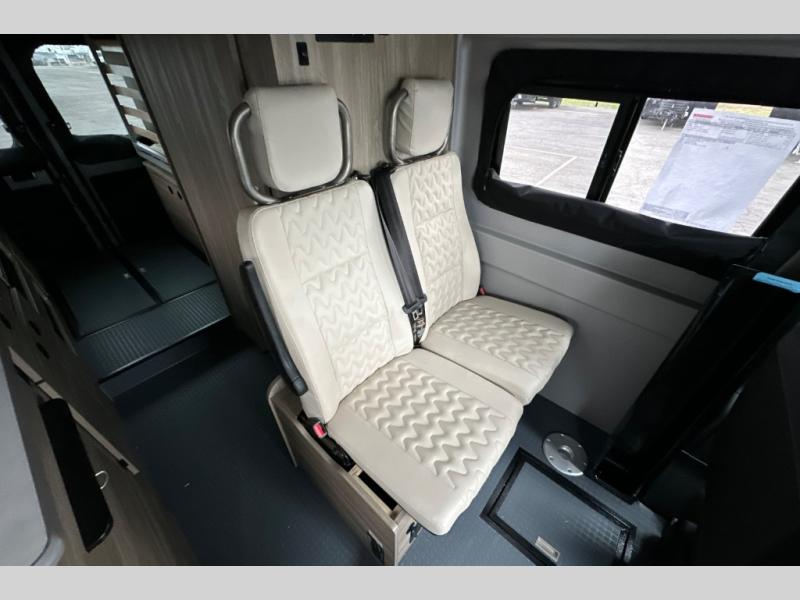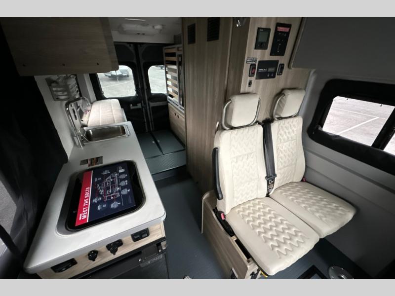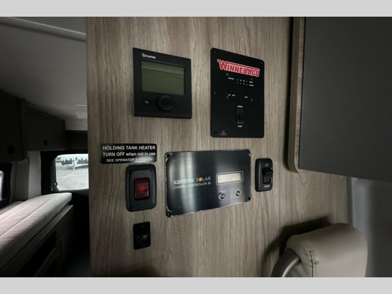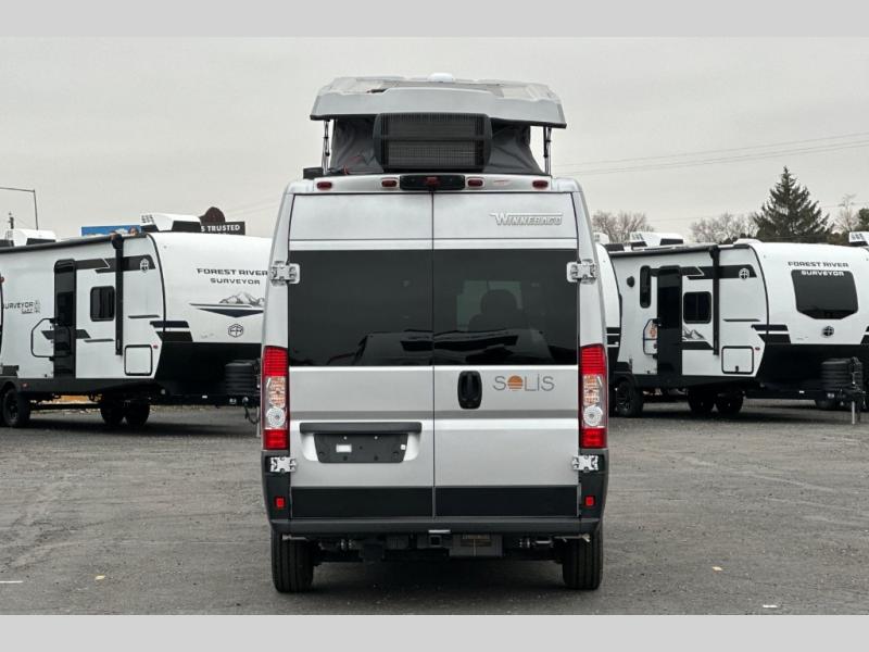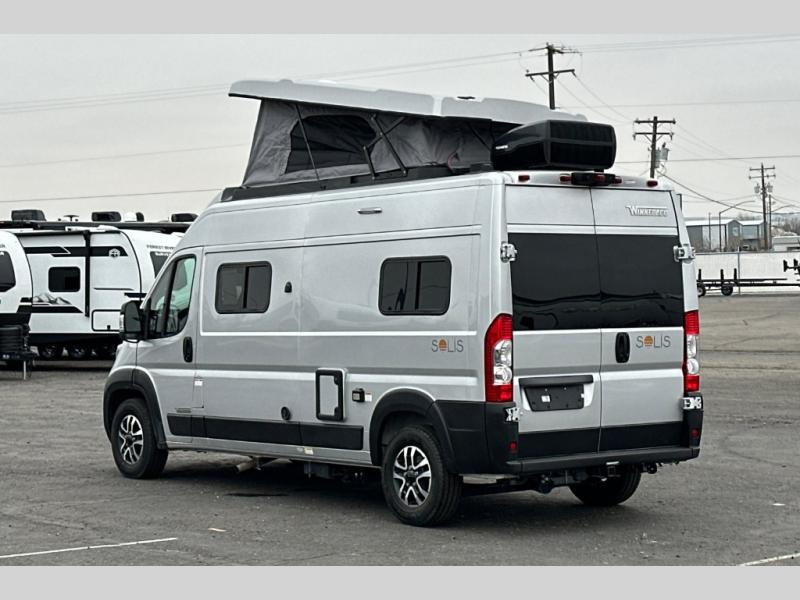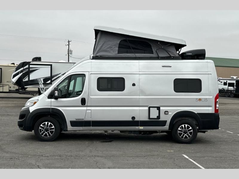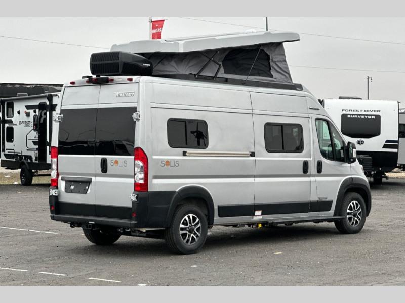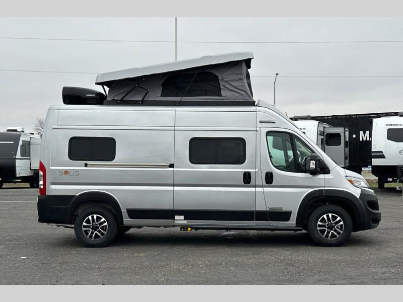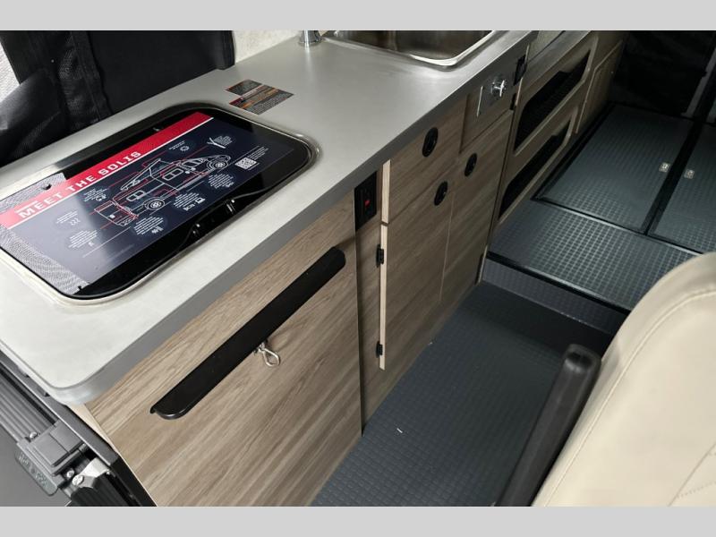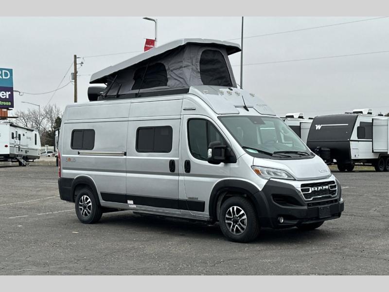 Each Solis Class B gas motorhome by Winnebago sits upon a fuel-efficient Ram ProMaster chassis with a 3.6L V6 engine to power your adventures. You will love the cab conveniences that make each trip enjoyable, like the radio/review monitor system touchscreen and the crosswind assist to keep you steady on the road. Some of the hassle-free amenities you will appreciate are the exterior wash station, the Eco-Hot water system, and the water center control panel located inside the right rear door. Head indoors to find heavy-duty vinyl flooring throughout, a laminate countertop and a stainless steel sink in the galley, plus tinted coach windows for added privacy. The Solis also features off-grid capabilities with its two deep-cycle Group 31 batteries and 220-watt flexible surface solar panel with a controller. Adventures awaits in the Solis Class B gas motorhome!