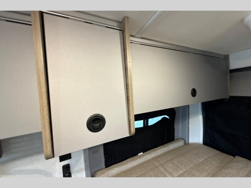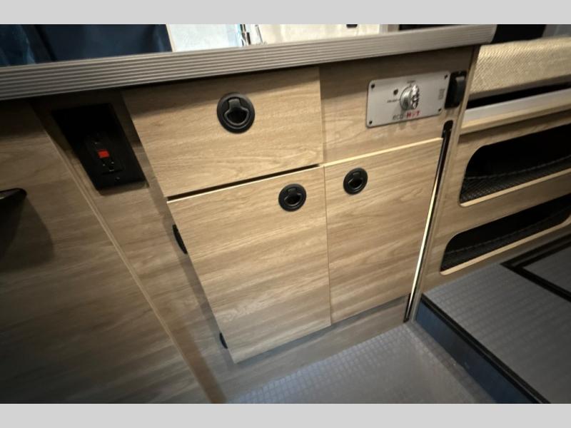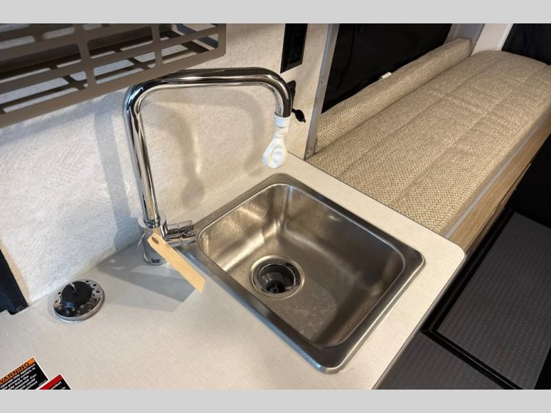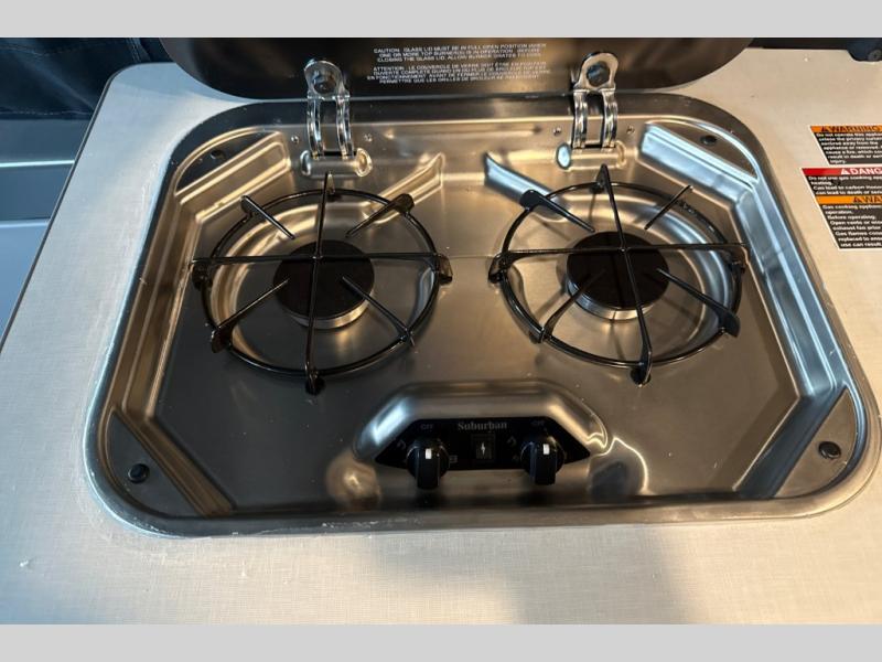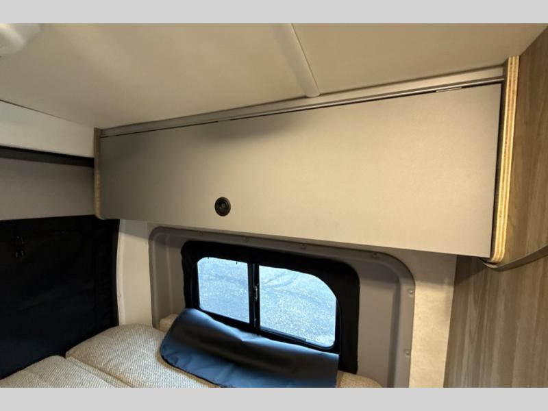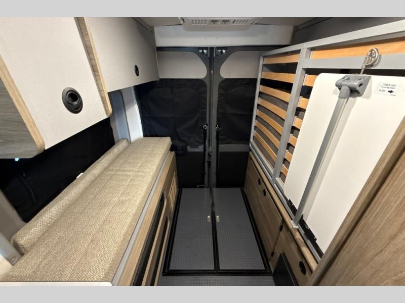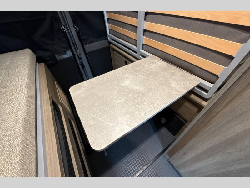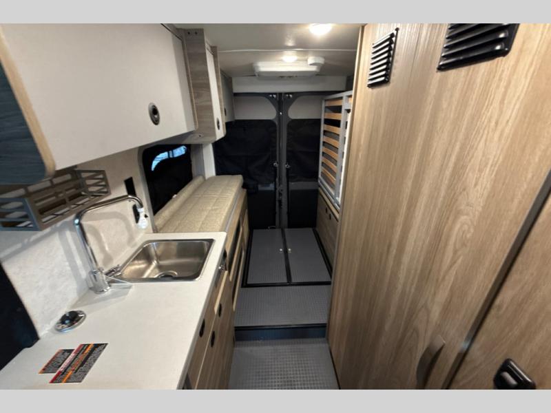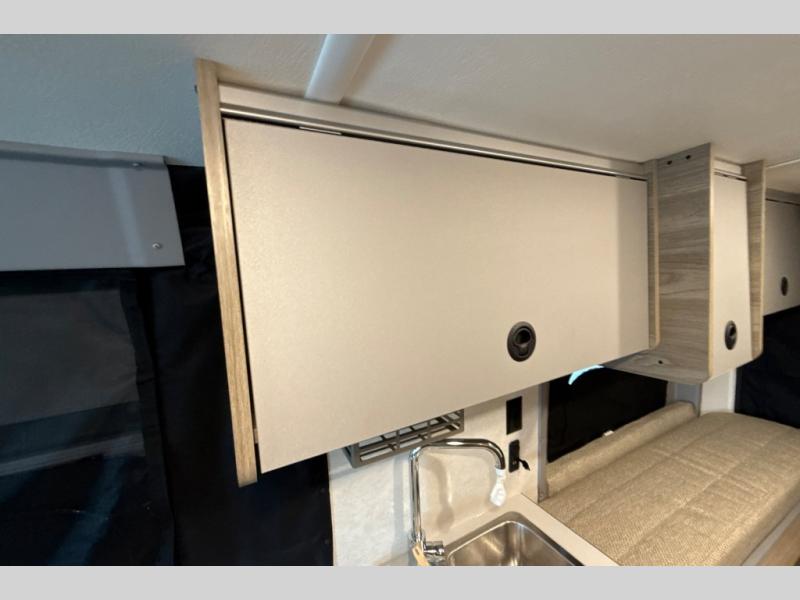 Enjoy a weekend ride in the mountains or make it an overnight stay with versatile sleeping options in this camper van. You'll find the Murphy+ bed in the back will provide a great night's rest, or you can choose the optional sofa/bed with added belted seating if you have more tag-alongs. And of course the little ones will love the pop-top sleeping area to climb into each night. After you've freshened up in the convenient wet bath, prepare breakfast on the two burner range, and the milk and eggs can go back in the 3.0 cu. ft. single door refrigerator/freezer. This model also includes rear double doors with screens to let the breeze in and keep bugs out!