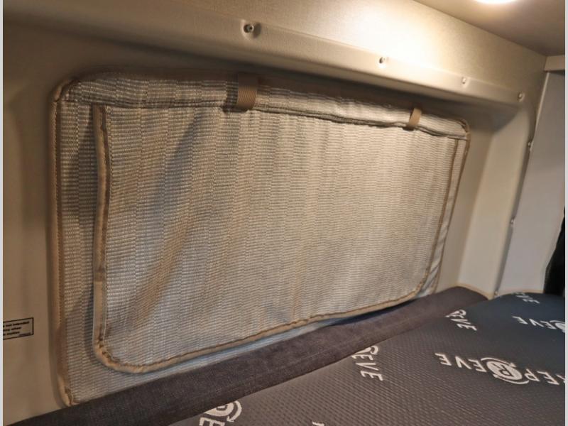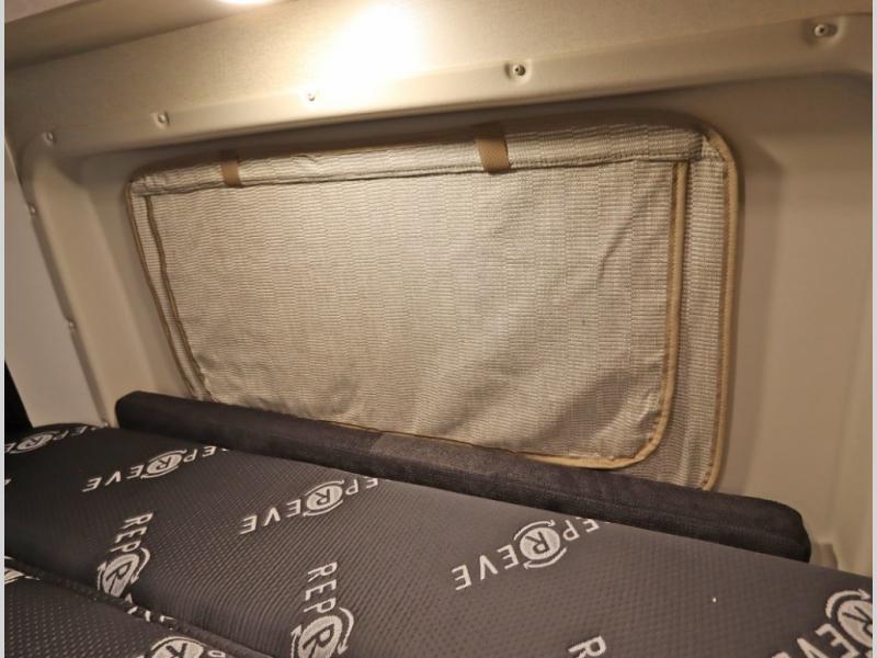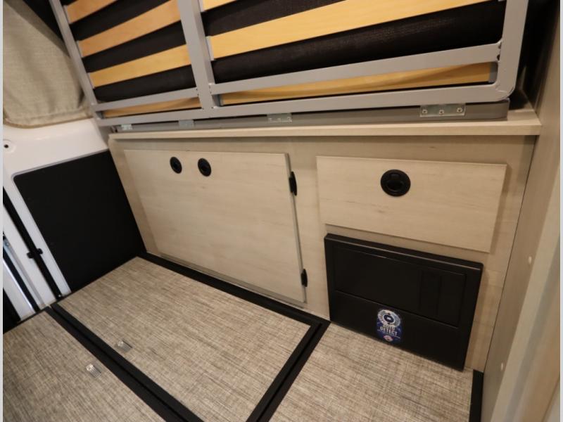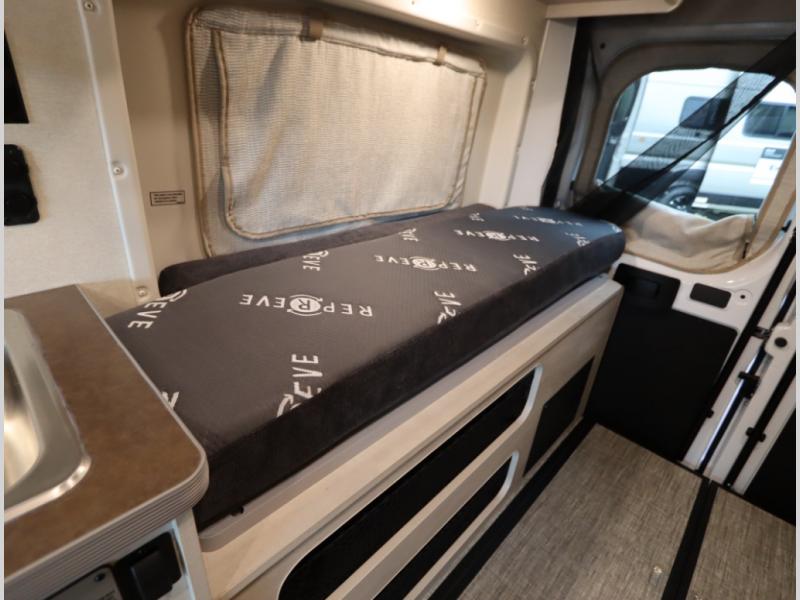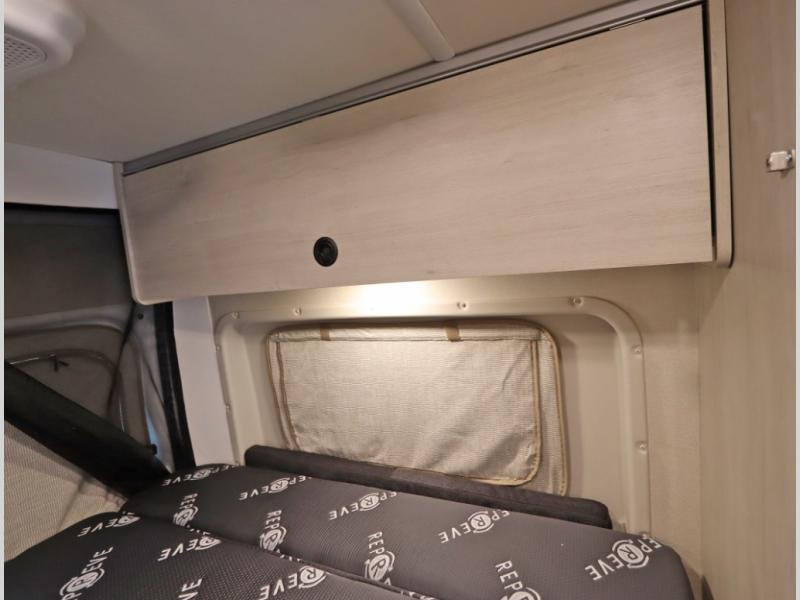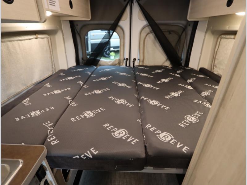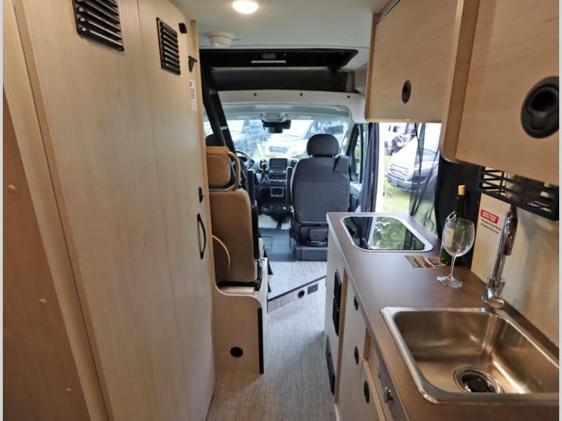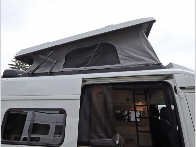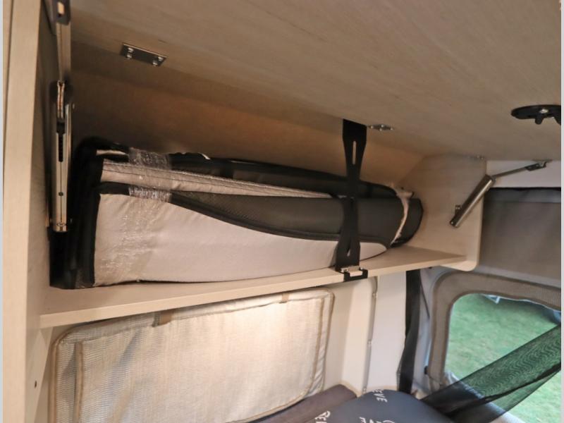 The popular Solis is available with or without the overhead pop top studio loft sleeping surface that includes the Froli deluxe sleep system! Plus you can increase sleeping now with the Luno front cab air mattress for a 30 x 65 in additional sleeping surface. Towards the rear of the van, the standard cross coach sleeping Murphy Bed is available or can be replaced with a sofa bed as well!