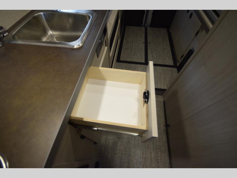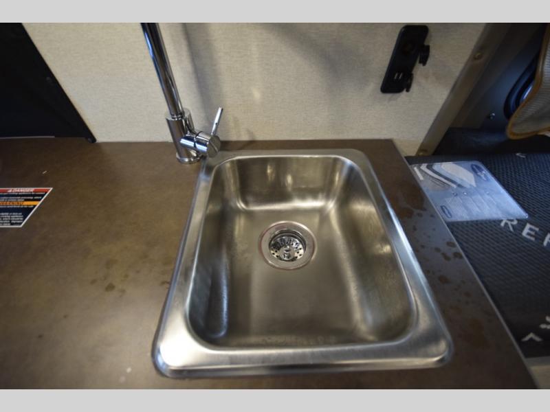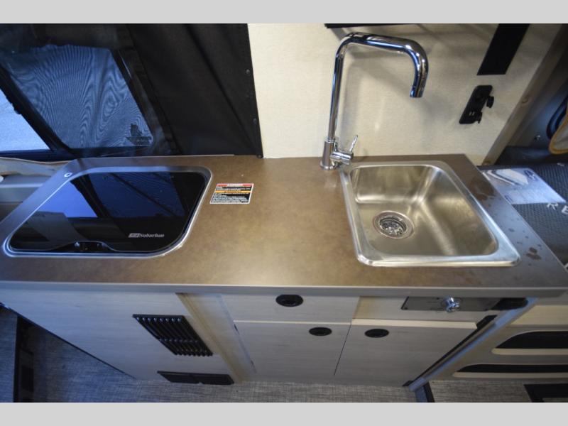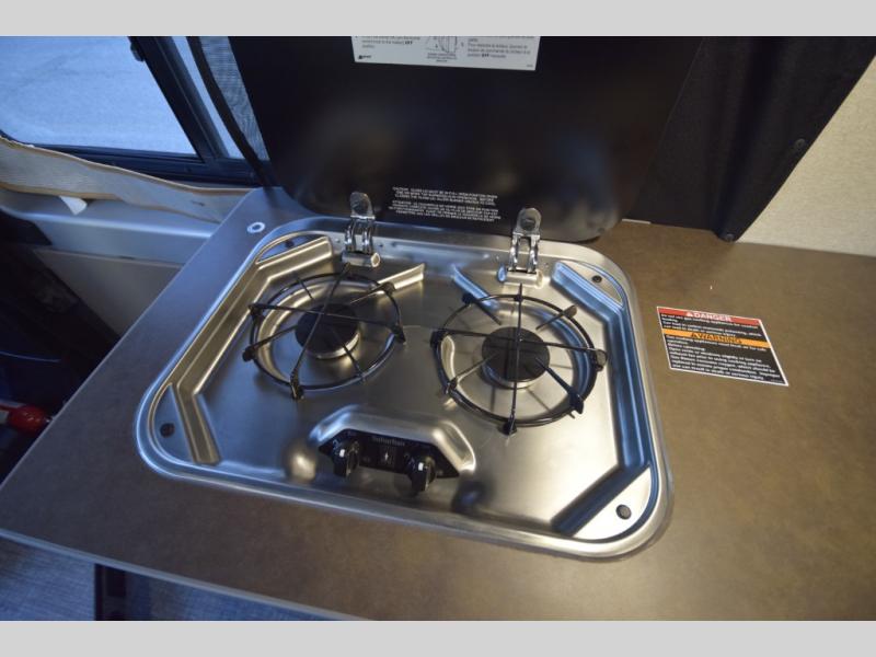 Prepare meals with ease using the two-burner range, stainless steel sink, and 3.0 cu. ft. refrigerator/freezer—perfect for quick breakfasts or trail-side dinners.
