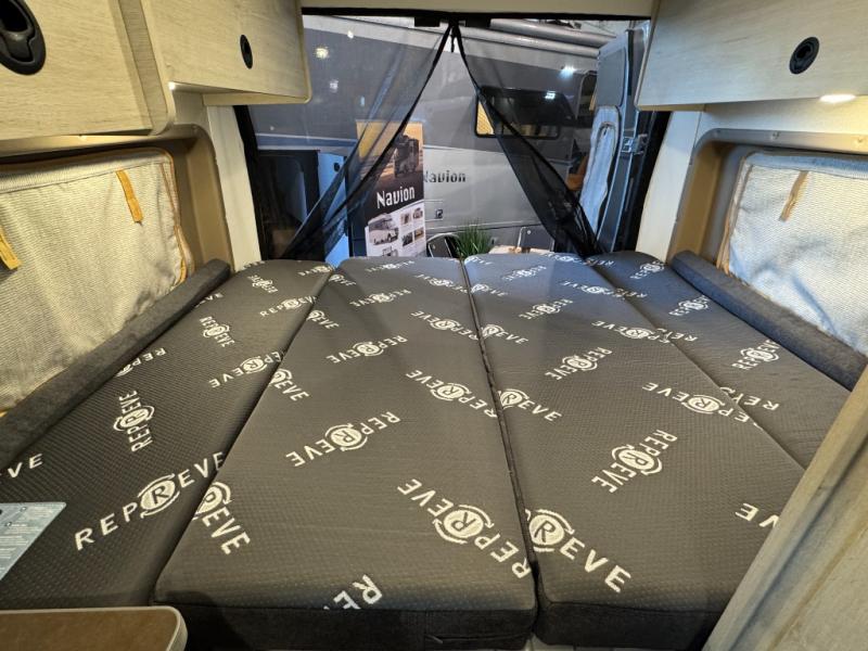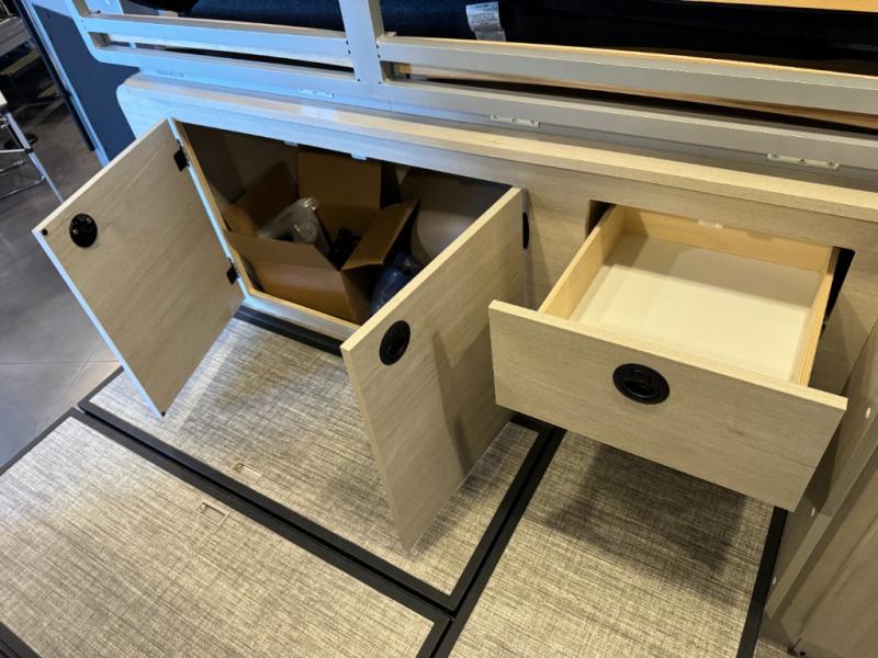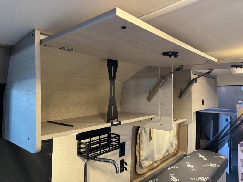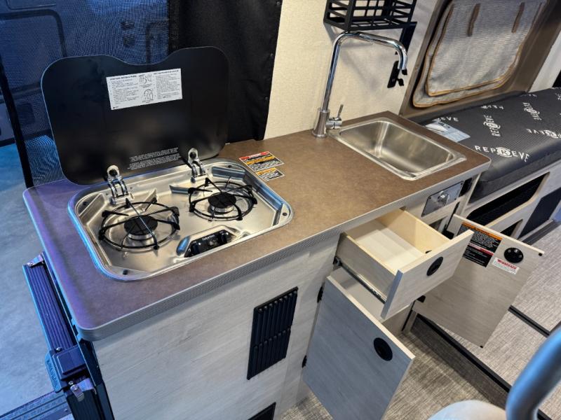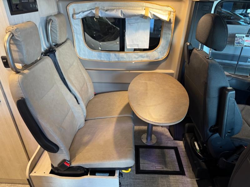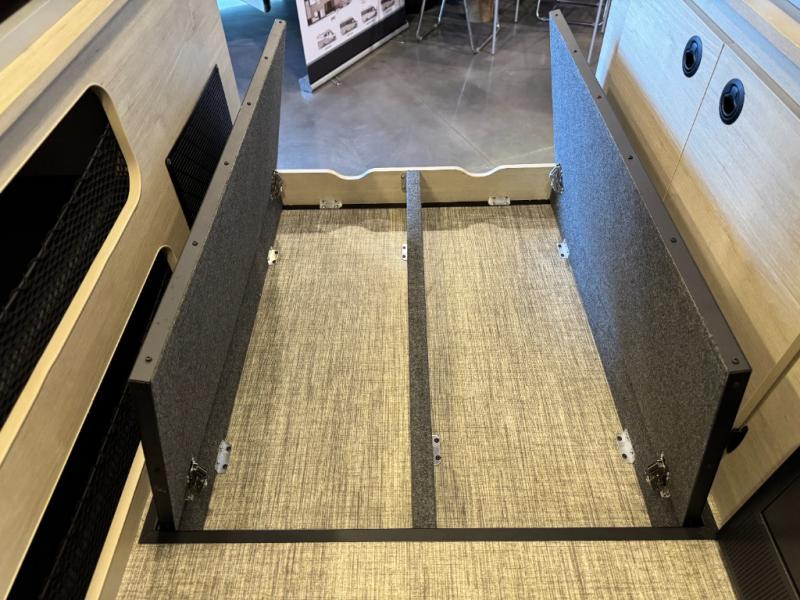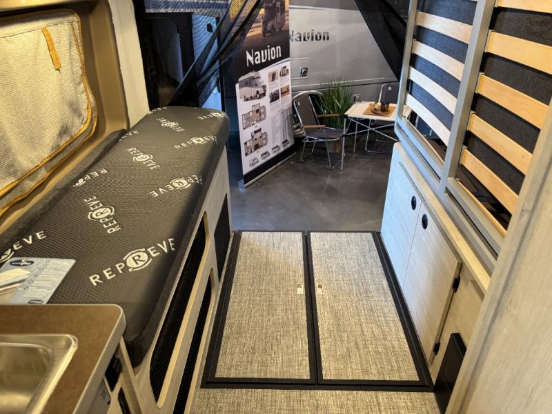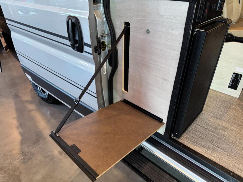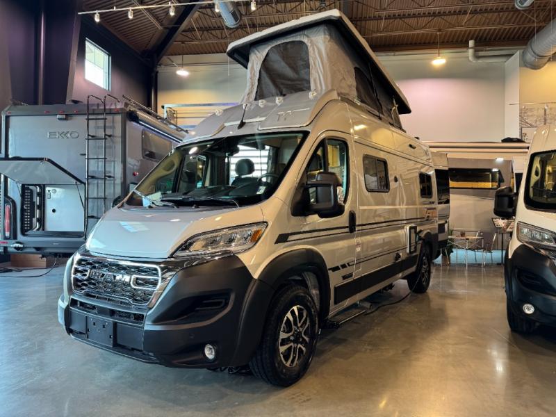 Enjoy a weekend ride in the mountains or make it an overnight stay with versatile sleeping options in this camper van. You'll find the Murphy+ bed in the back will provide a great night's rest, or you can choose the optional sofa/bed with added belted seating if you have more tag-alongs. And of course the little ones will love the pop-top sleeping area to climb into each night. After you've freshened up in the convenient wet bath, prepare breakfast on the two burner range, and the milk and eggs can go back in the 3.0 cu. ft. single door refrigerator/freezer. This model also includes rear double doors with screens to let the breeze in and keep bugs out!