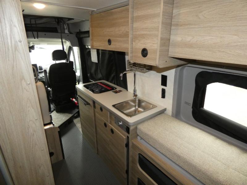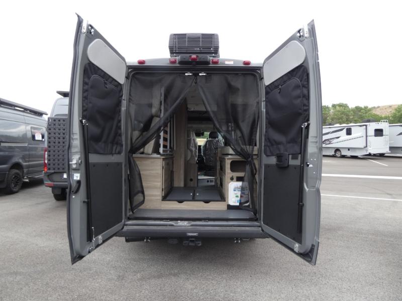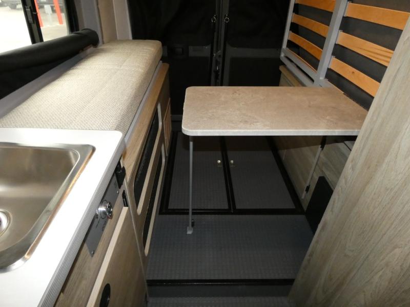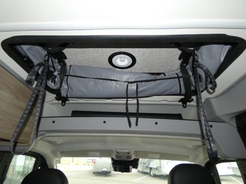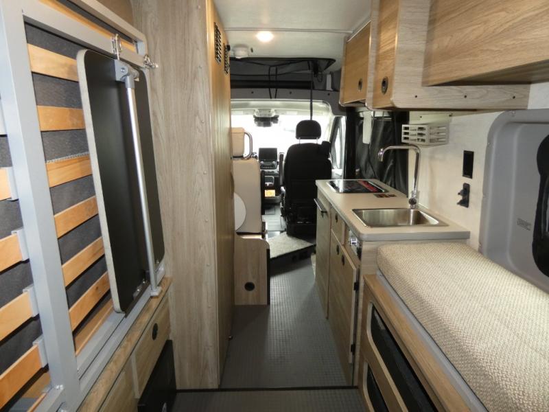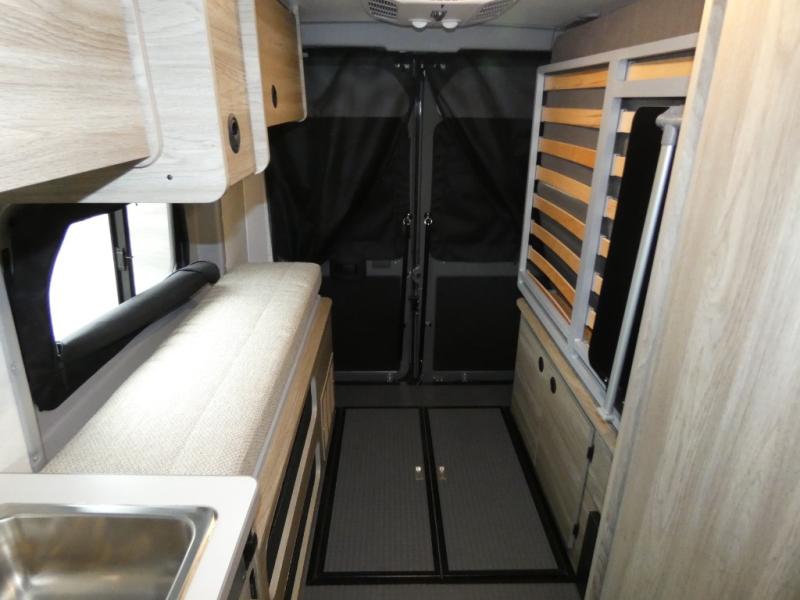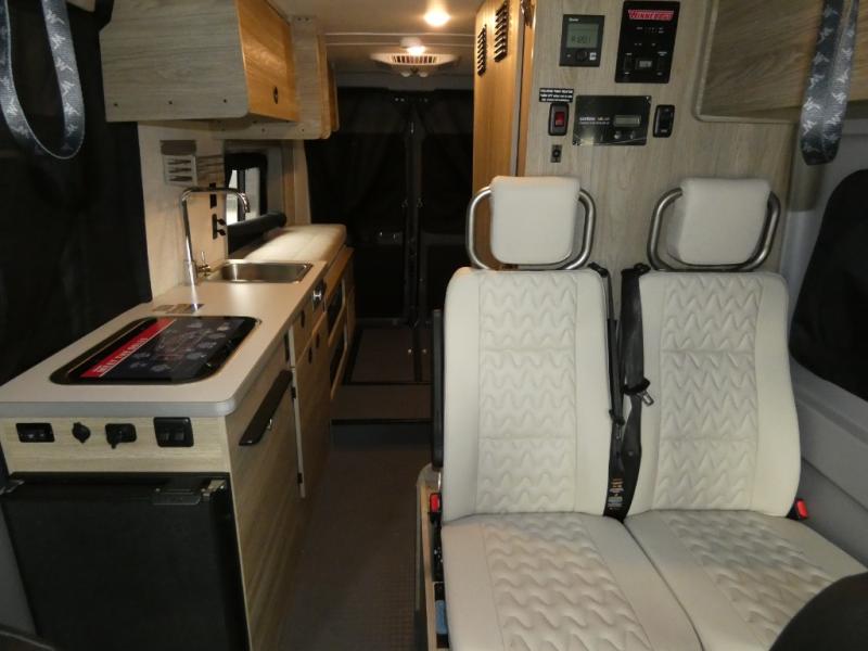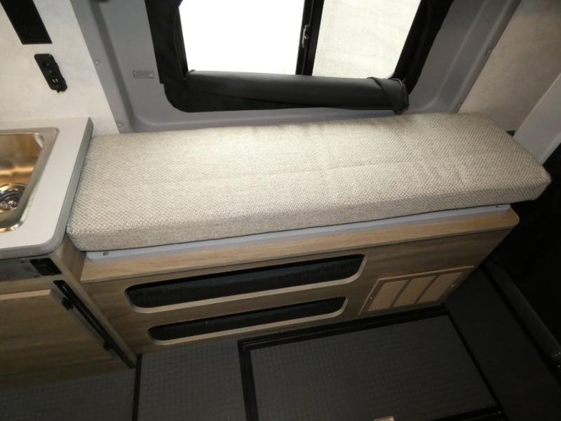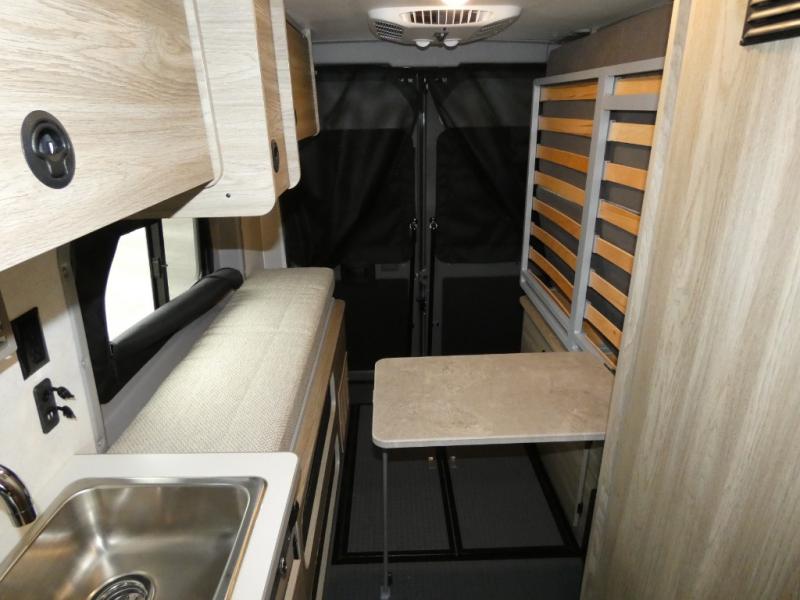 This camper van with an L-track storage system is perfect for those needing more storage space for their hiking and biking gear. You can stay powered up with the 2,800-watt gas generator, and there is a 13,500 BTU air conditioner with directional ducts and dial control that will allow you to come inside to cool off after a trail ride. A Murphy+ bed comes standard, and any guests that tag along can sleep in the pop-top sleeping area! If you choose to remove the pop-top, you'll enjoy the deluxe powered ventilator fan instead. You'll find the wet bath to come in handy when you want to clean up, and the dinette seating with a removable pedestal table will provide a place to enjoy your dinner at.