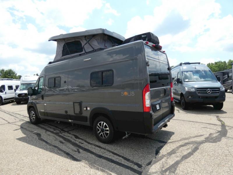 Each Solis Class B gas motorhome by Winnebago sits upon a fuel-efficient Ram ProMaster chassis with a 3.6L V6 engine to power your adventures. You will love the cab conveniences that make each trip enjoyable, like the radio/review monitor system touchscreen and the crosswind assist to keep you steady on the road. Some of the hassle-free amenities you will appreciate are the exterior wash station, the Eco-Hot water system, and the water center control panel located inside the right rear door. Head indoors to find heavy-duty vinyl flooring throughout, a laminate countertop and a stainless steel sink in the galley, plus tinted coach windows for added privacy. The Solis also features off-grid capabilities with its two deep-cycle Group 31 batteries and 220-watt flexible surface solar panel with a controller. Adventures awaits in the Solis Class B gas motorhome!