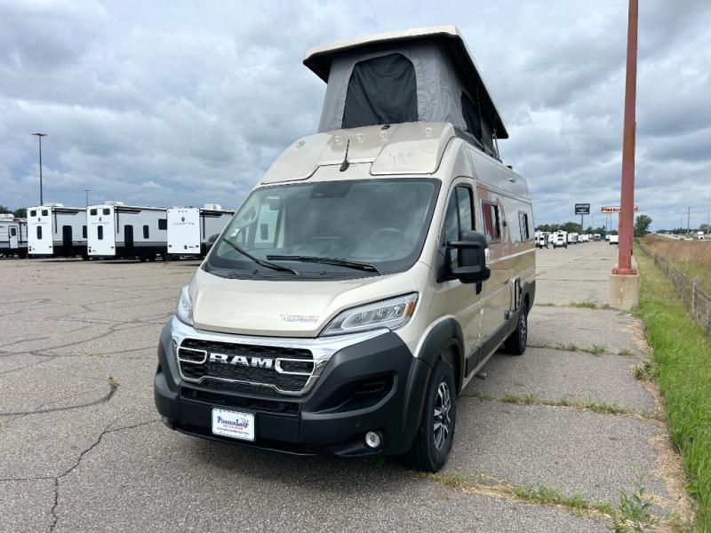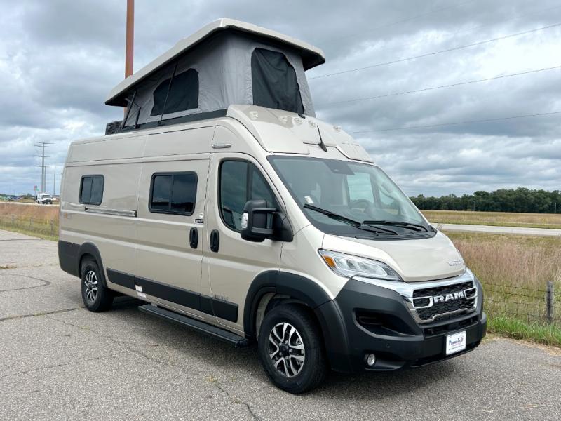 This camper van with an L-track storage system is perfect for those needing more storage space for their hiking and biking gear. You can stay powered up with the 2,800-watt gas generator, and there is a 13,500 BTU air conditioner with directional ducts and dial control that will allow you to come inside to cool off after a trail ride. A Murphy+ bed comes standard, and any guests that tag along can sleep in the pop-top sleeping area! If you choose to remove the pop-top, you'll enjoy the deluxe powered ventilator fan instead. You'll find the wet bath to come in handy when you want to clean up, and the dinette seating with a removable pedestal table will provide a place to enjoy your dinner at.