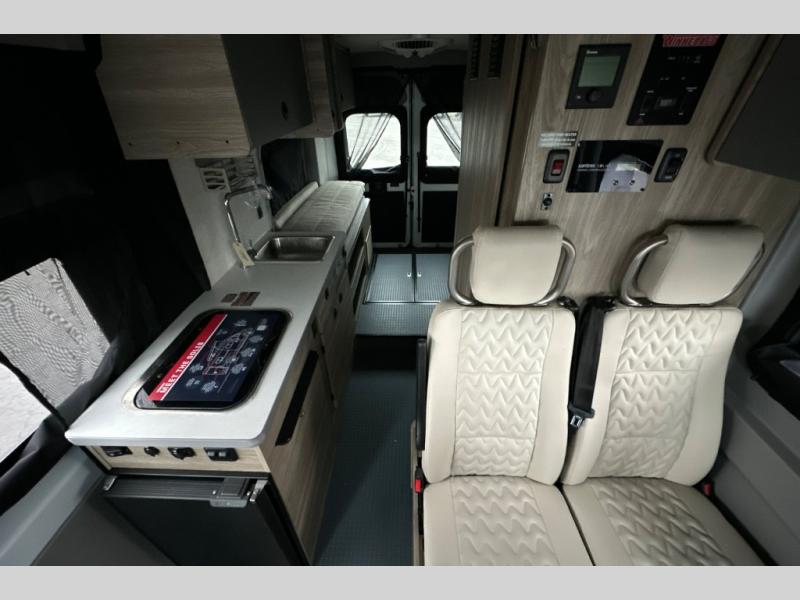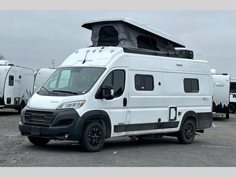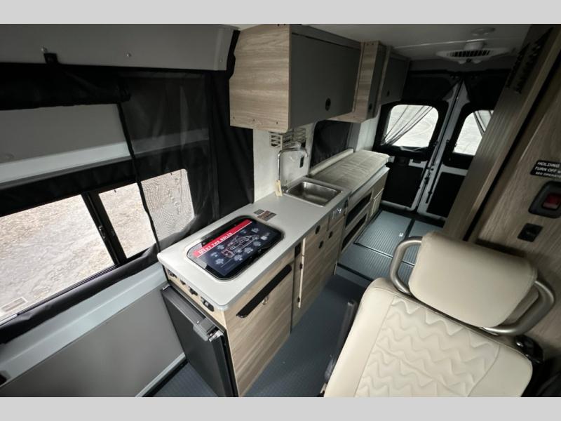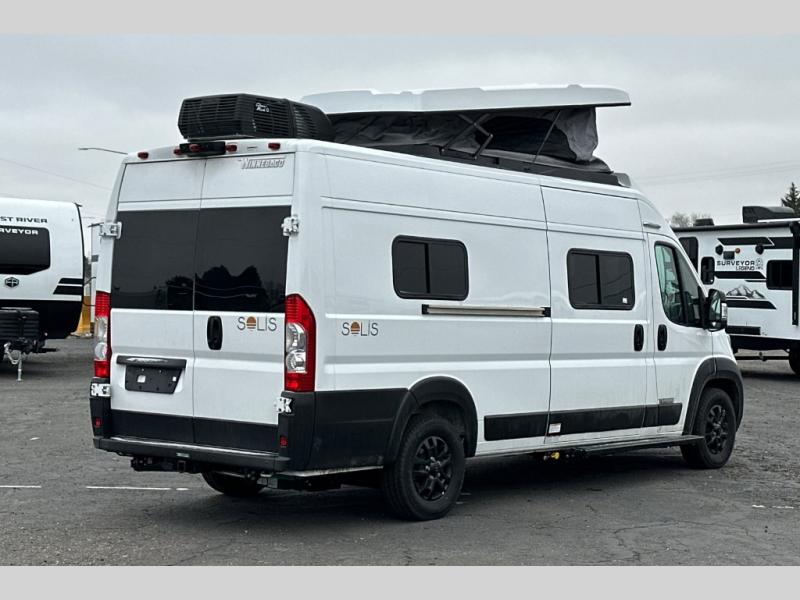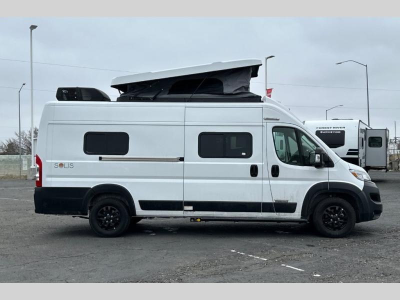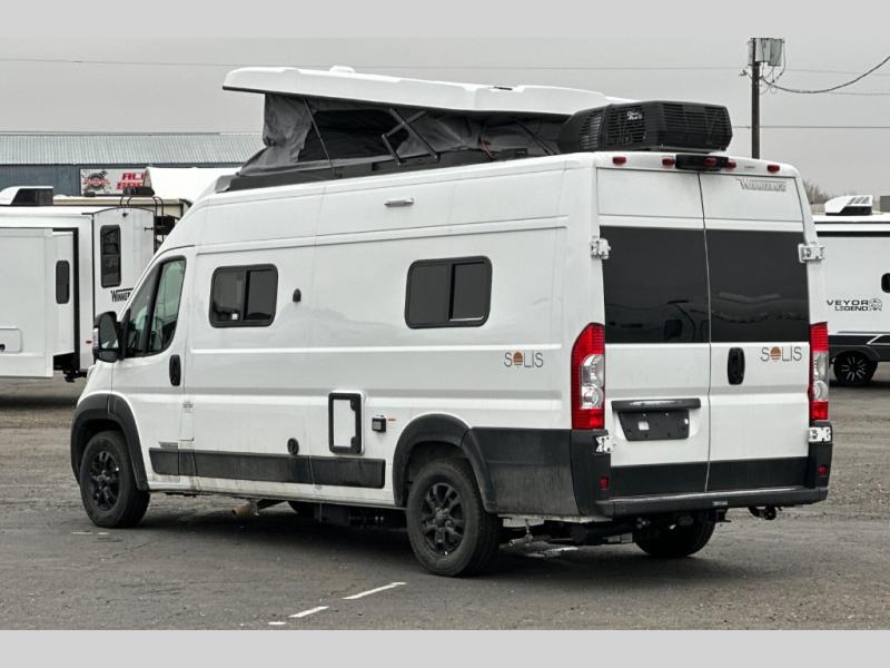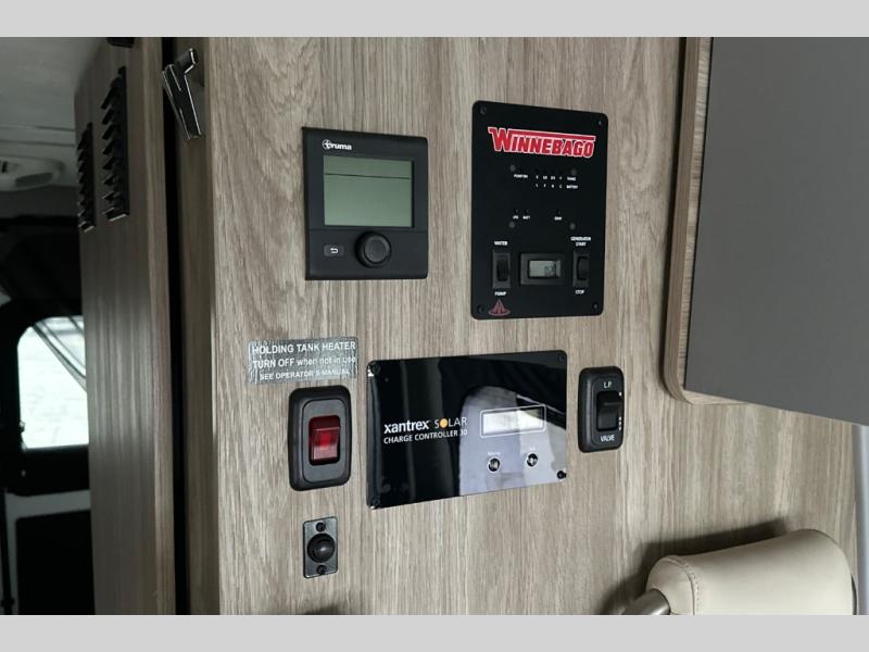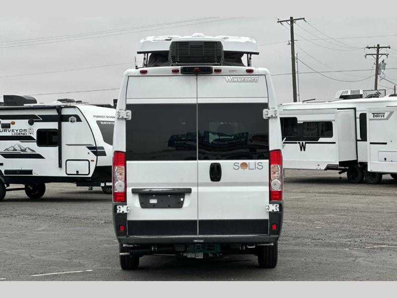 Each Solis Class B gas motorhome by Winnebago sits upon a fuel-efficient Ram ProMaster chassis with a 3.6L V6 engine to power your adventures. You will love the cab conveniences that make each trip enjoyable, like the radio/review monitor system touchscreen and the crosswind assist to keep you steady on the road. Some of the hassle-free amenities you will appreciate are the exterior wash station, the Eco-Hot water system, and the water center control panel located inside the right rear door. Head indoors to find heavy-duty vinyl flooring throughout, a laminate countertop and a stainless steel sink in the galley, plus tinted coach windows for added privacy. The Solis also features off-grid capabilities with its two deep-cycle Group 31 batteries and 220-watt flexible surface solar panel with a controller. Adventures awaits in the Solis Class B gas motorhome!