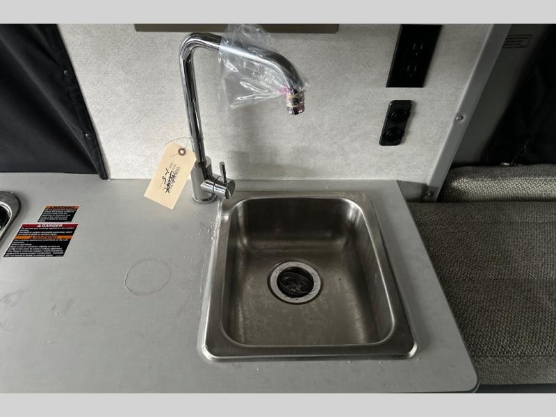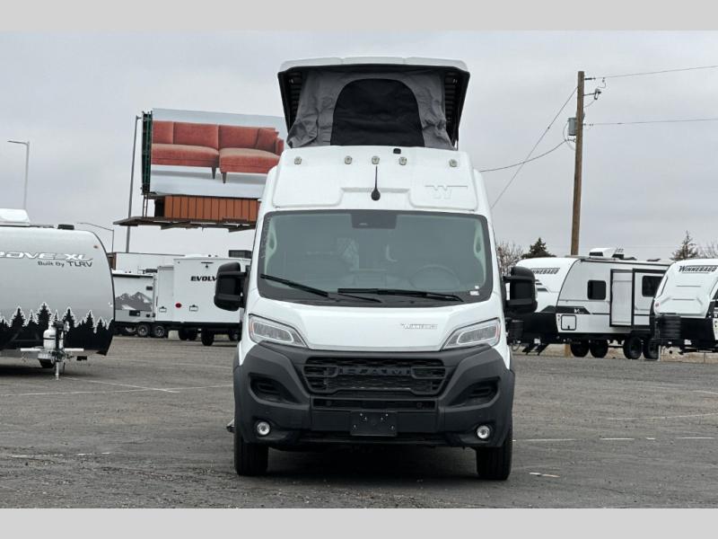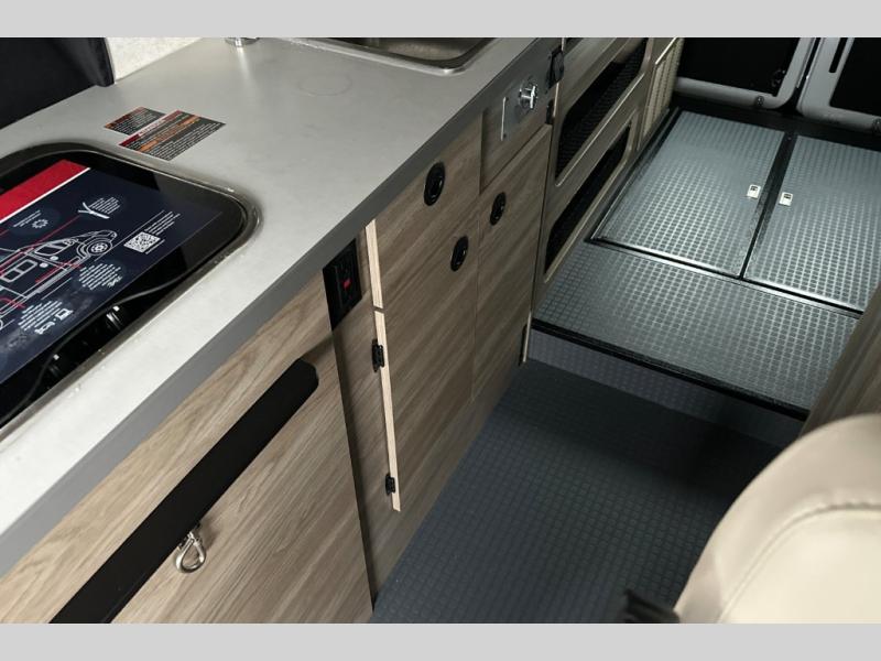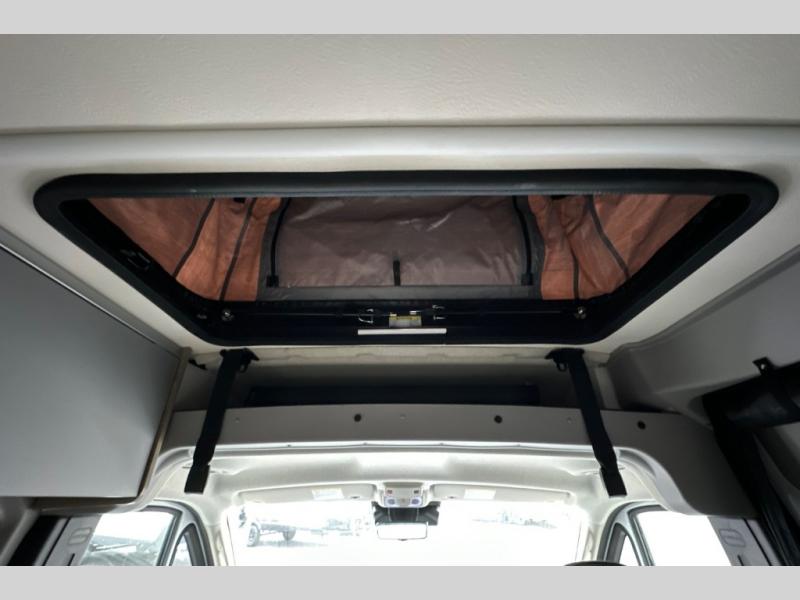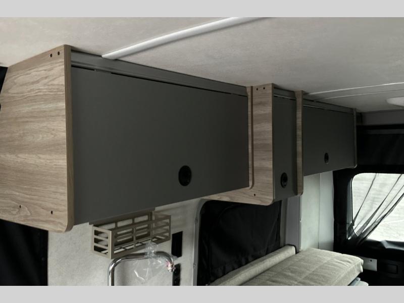 This camper van with an L-track storage system is perfect for those needing more storage space for their hiking and biking gear. You can stay powered up with the 2,800-watt gas generator, and there is a 13,500 BTU air conditioner with directional ducts and dial control that will allow you to come inside to cool off after a trail ride. A Murphy+ bed comes standard, and any guests that tag along can sleep in the pop-top sleeping area! If you choose to remove the pop-top, you'll enjoy the deluxe powered ventilator fan instead. You'll find the wet bath to come in handy when you want to clean up, and the dinette seating with a removable pedestal table will provide a place to enjoy your dinner at.