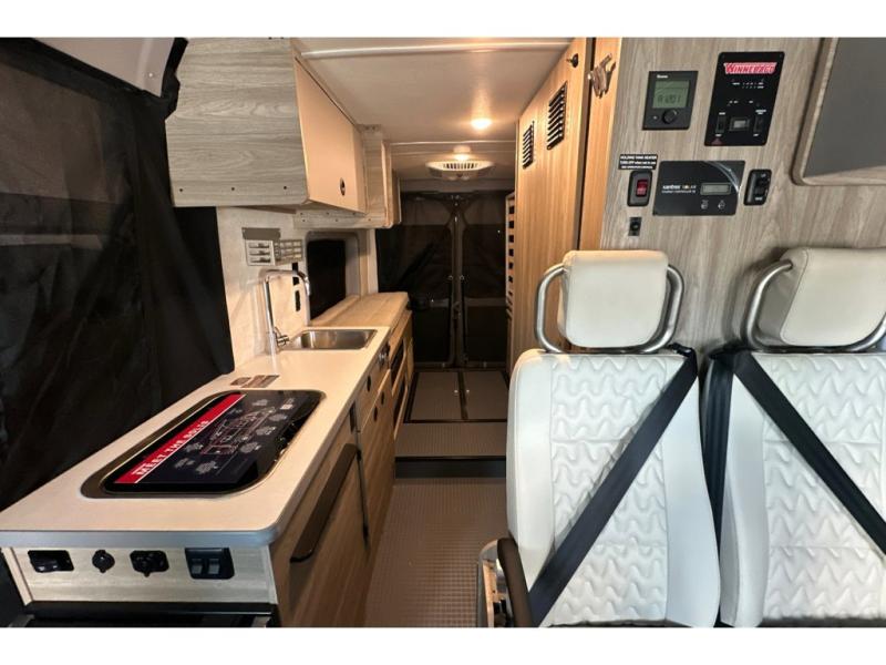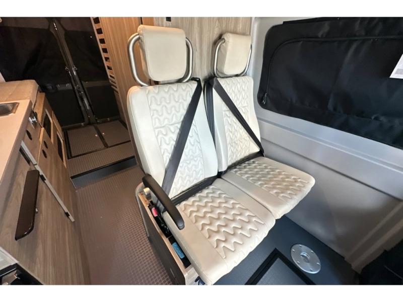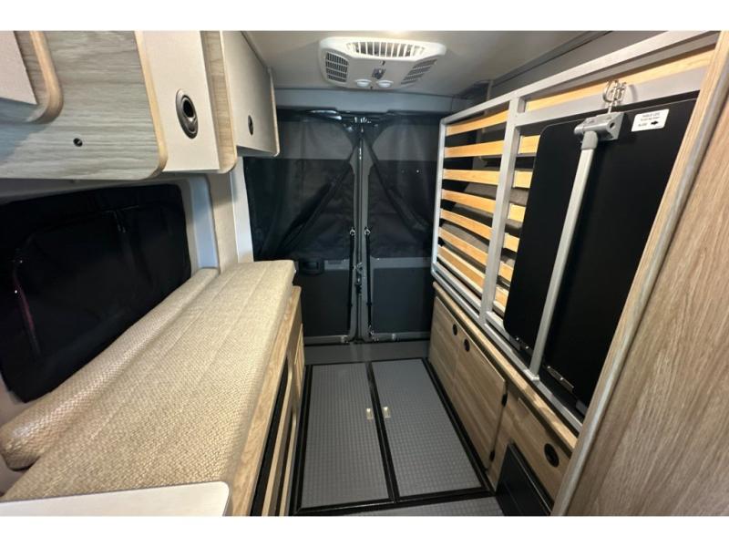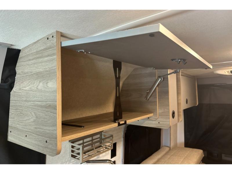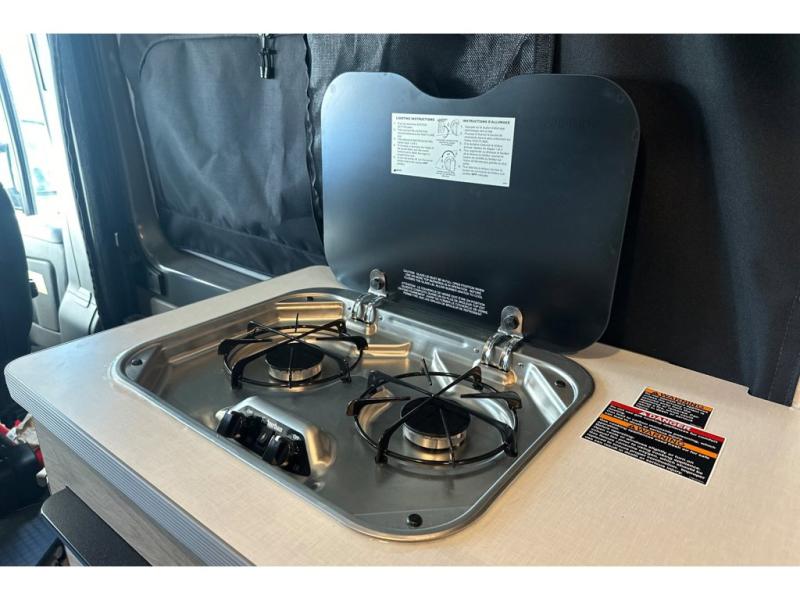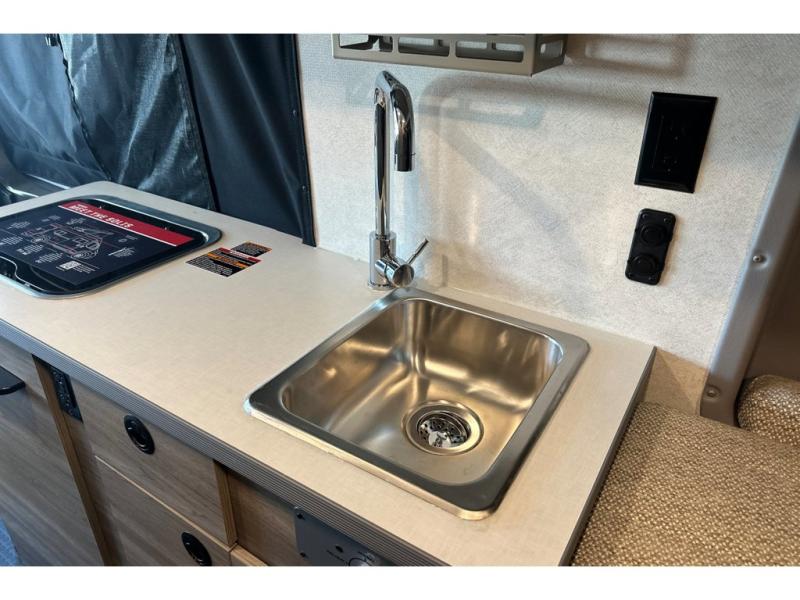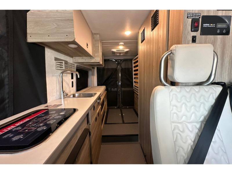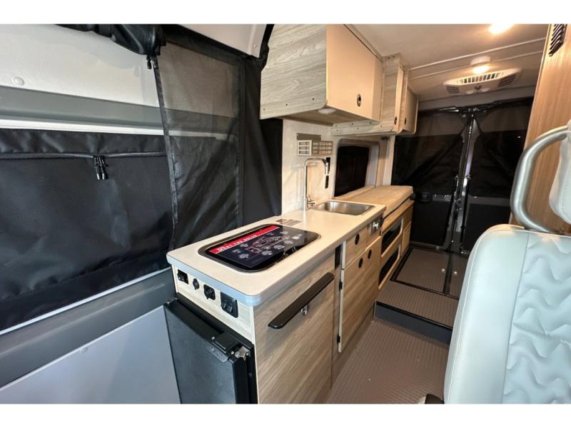 This camper van with an L-track storage system is perfect for those needing more storage space for their hiking and biking gear. You can stay powered up with the 2,800-watt gas generator, and there is a 13,500 BTU air conditioner with directional ducts and dial control that will allow you to come inside to cool off after a trail ride. A Murphy+ bed comes standard, and any guests that tag along can sleep in the pop-top sleeping area! If you choose to remove the pop-top, you'll enjoy the deluxe powered ventilator fan instead. You'll find the wet bath to come in handy when you want to clean up, and the dinette seating with a removable pedestal table will provide a place to enjoy your dinner at.