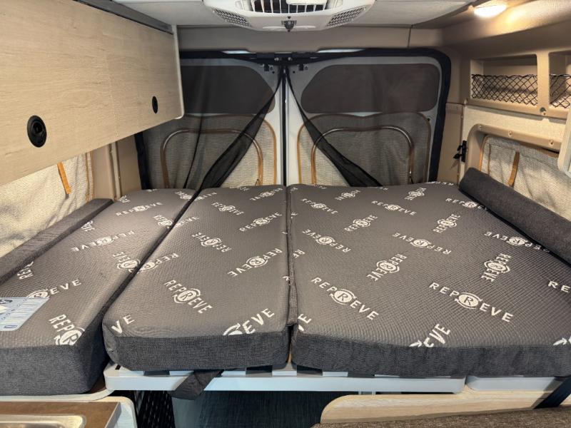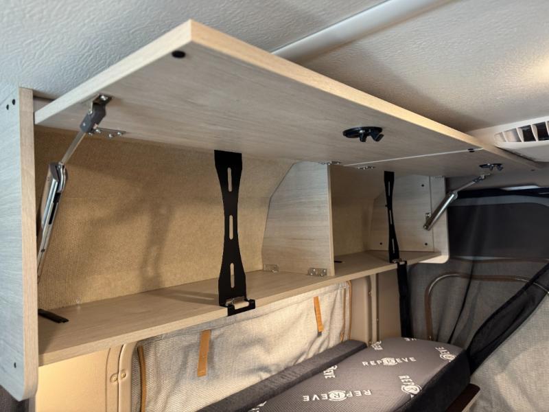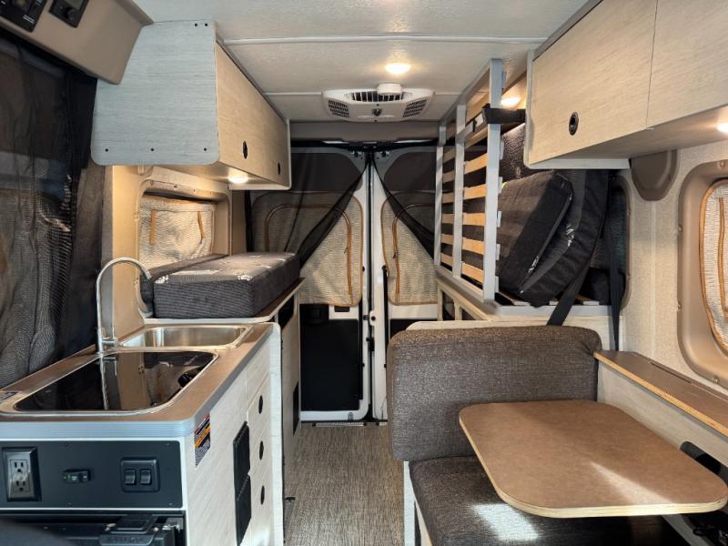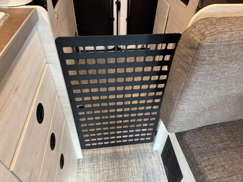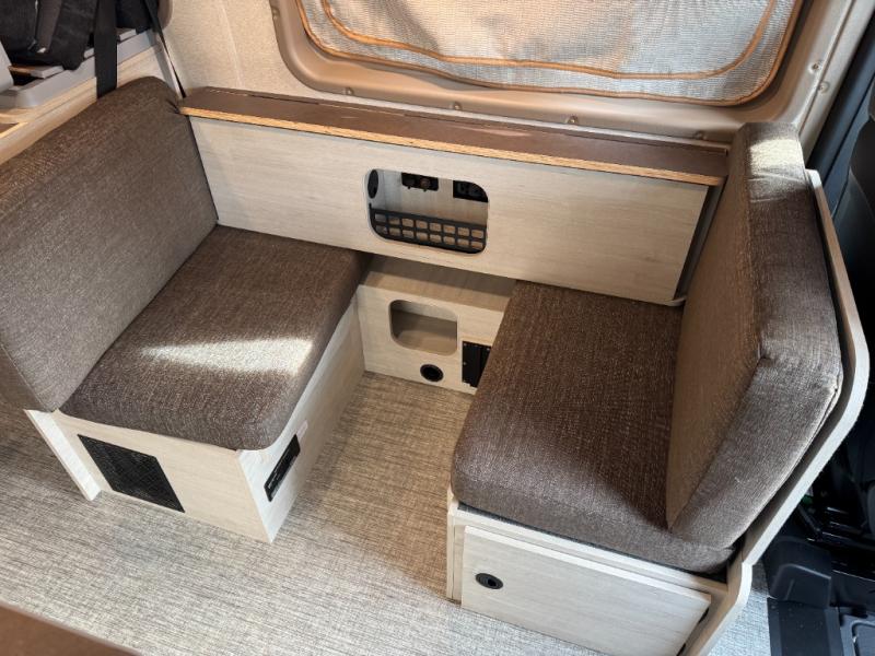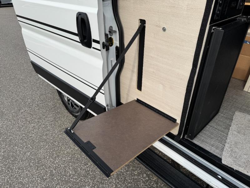 Enjoy versatile living in this motorhome! As you enter the rear double doors, you will notice the 52" x 75" Murphy+ bed with a mattress cover that can be brought down for a good night's rest. You can prepare delicious home cooked meals while out on the road with the two burner range with glass cover, the stainless steel sink, and the single door compressor-driven 3.0 cu. ft. refrigerator/freezer, and enjoy them at the dinette. This dinette offers many different variations like a sleeping mode, a sofa mode with a table, a daybed mode with a table, and a settee loveseat mode. Plus, underneath the dinette is a storage area for the portable toilet. A rigid MOLLE panel cargo gate and L-track cargo tie-downs ensure your cargo will stay in place as you travel!