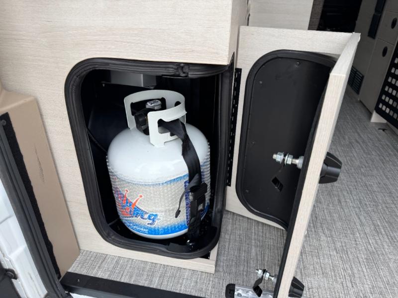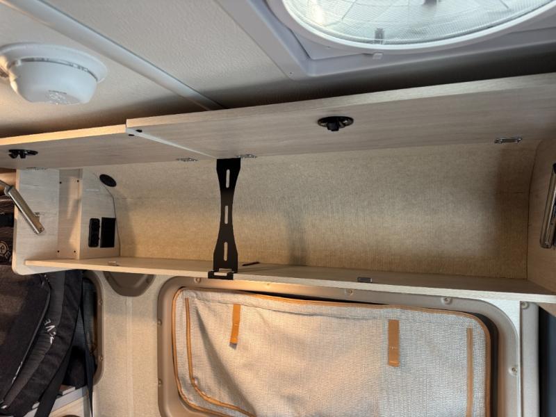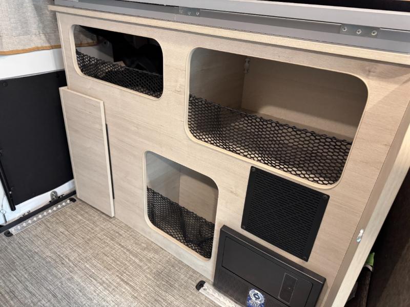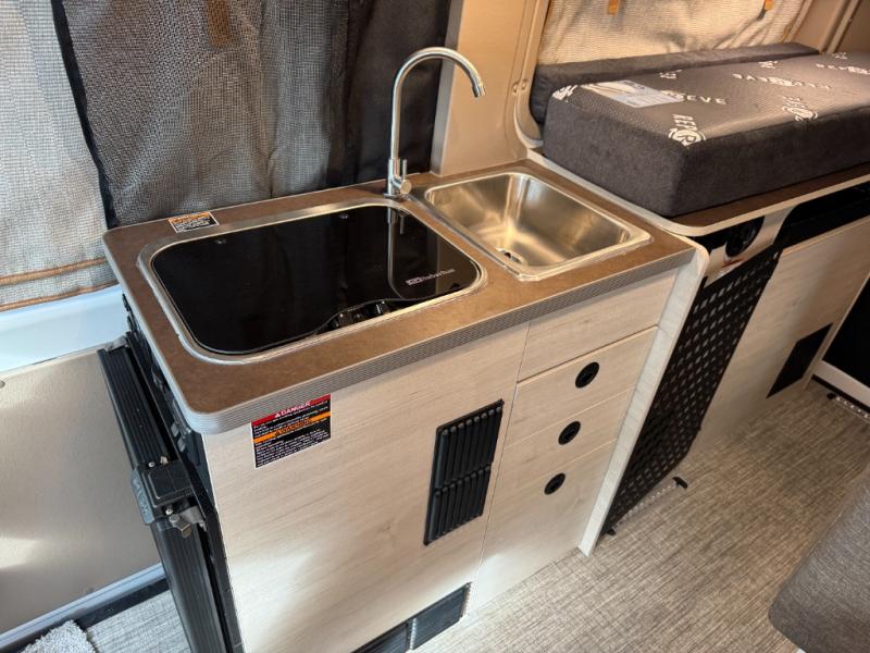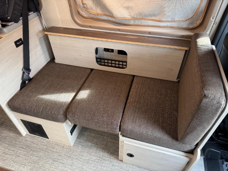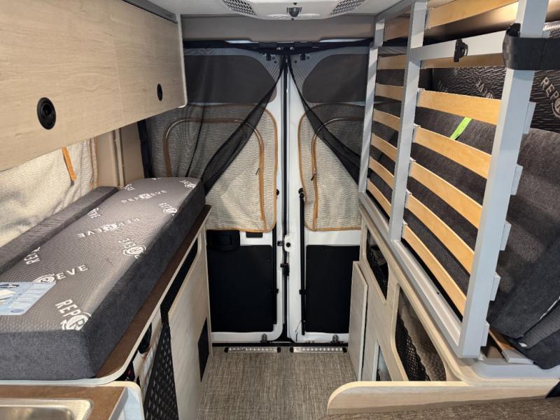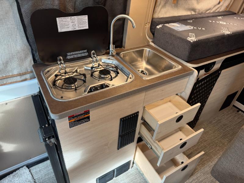 Enjoy versatile living in this motorhome! As you enter the rear double doors, you will notice the 52" x 75" Murphy+ bed with a mattress cover that can be brought down for a good night's rest. You can prepare delicious home cooked meals while out on the road with the two burner range with glass cover, the stainless steel sink, and the single door compressor-driven 3.0 cu. ft. refrigerator/freezer, and enjoy them at the dinette. This dinette offers many different variations like a sleeping mode, a sofa mode with a table, a daybed mode with a table, and a settee loveseat mode. Plus, underneath the dinette is a storage area for the portable toilet. A rigid MOLLE panel cargo gate and L-track cargo tie-downs ensure your cargo will stay in place as you travel!