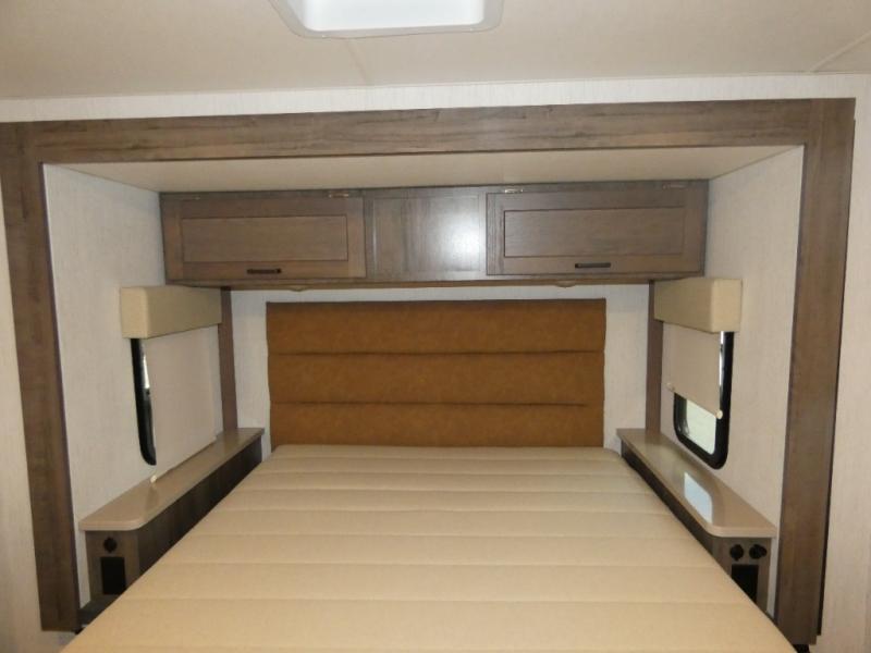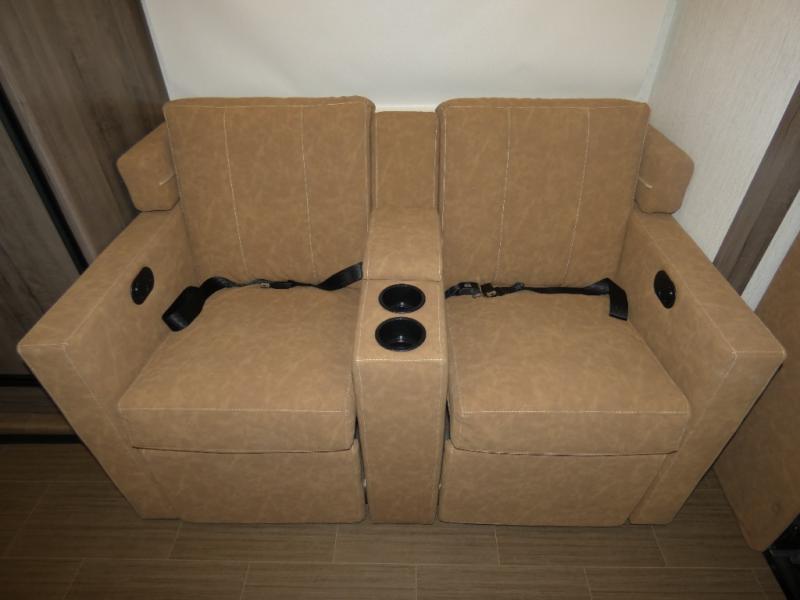 Time spent in this spacious coach will be time well spent! Whether you're dining around the U-shaped dinette, relaxing on the theater seats, or visiting outdoors under the power awning, you're sure to have a great time. The cab-over bunk and the living room furniture will provide sleeping space for guests. A three burner range and a microwave oven will let you prepare your best meals while you're on the road, plus there is an 8 cu. ft. 2-way large double door refrigerator/freezer and pantry for food storage. After a long day outdoors exploring trails, you can relax in the private bedroom on the RV queen bed slide. There are dual bedside nightstands for your things, a sliding door for more space, plus quick access into the rear corner full bath!