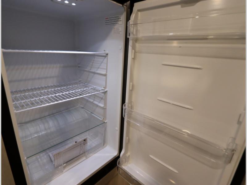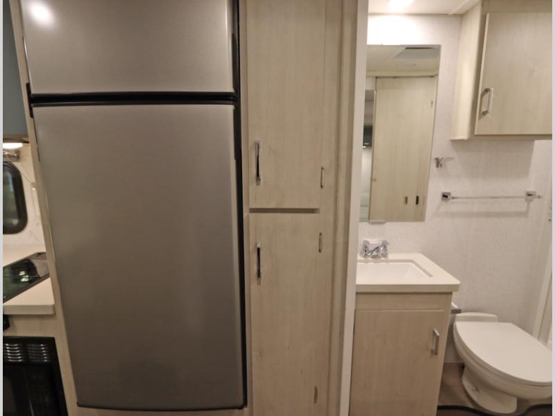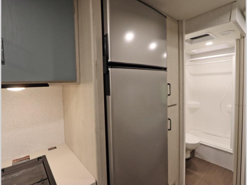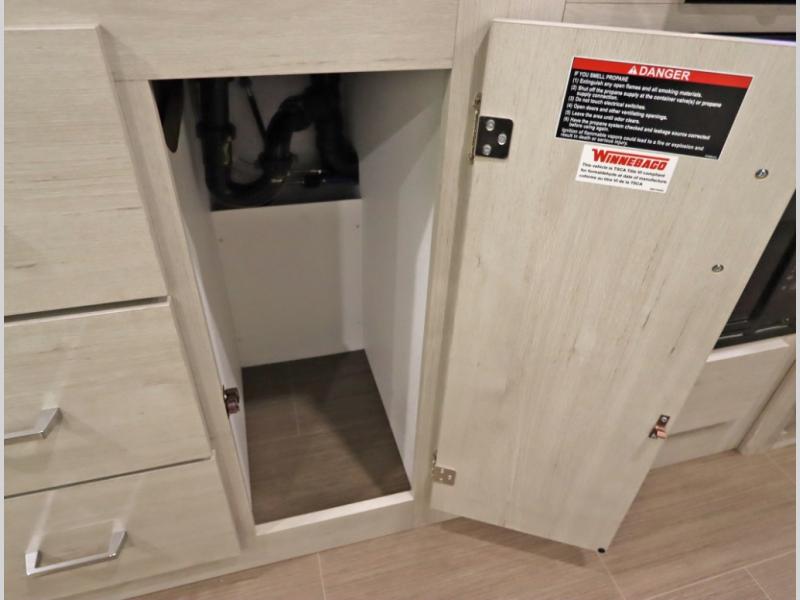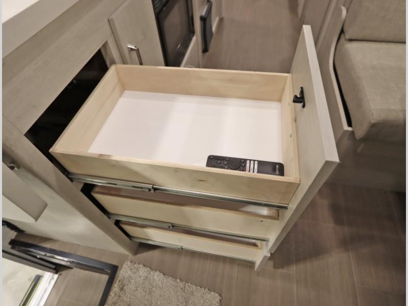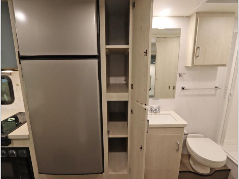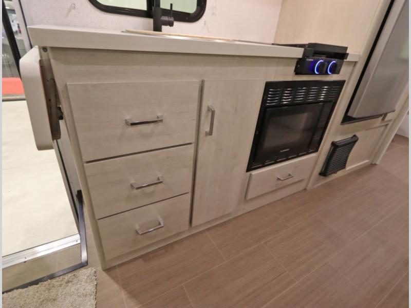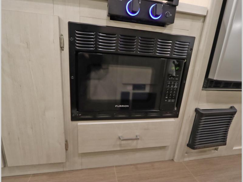Convenient Amenities: The convection microwave with a built-in air fryer saves space, while flat floor designs enhance movement throughout the coach.
