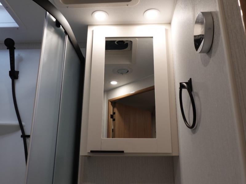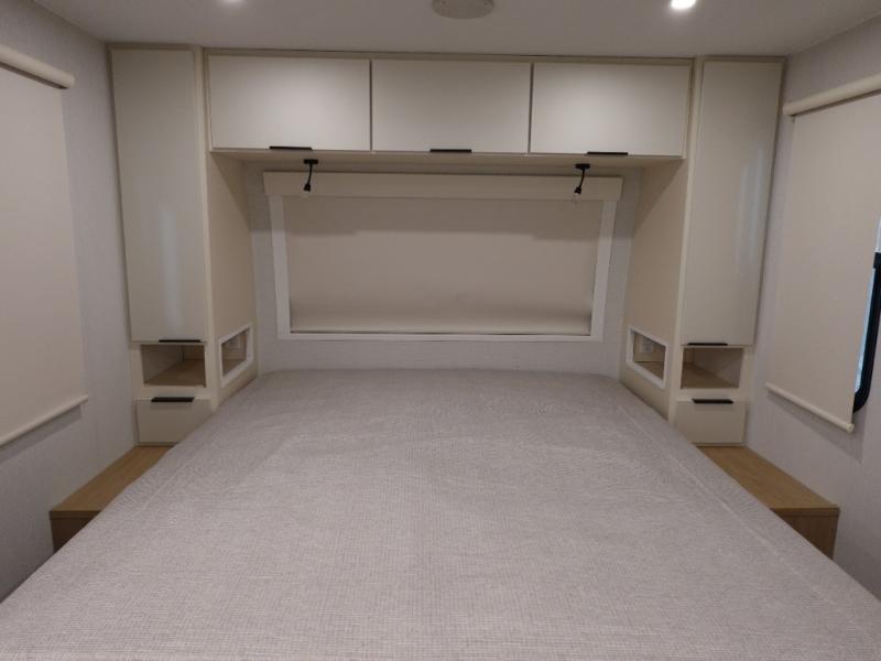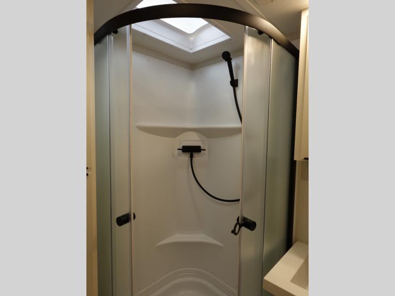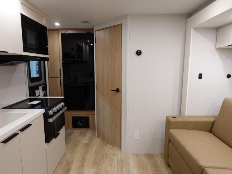 It will be so easy to enjoy camping trips in this compact travel trailer. The jack knife sofa slide provides more floor space plus a place for an overnight guest to sleep. You'll find a king-size bed up front with a privacy curtain and dual bedroom wardrobes to keep your things tidy. A recessed three burner cooktop with an oven will let you make meals each day, and the 10.6 cu. ft. 12V refrigerator will keep your cold items fresh. There is also a pantry with pull-out and removable shelves for added storage space. The full bath includes a power vent fan and a shower skylight that will give you more lighting and extra head room as you get ready each day!