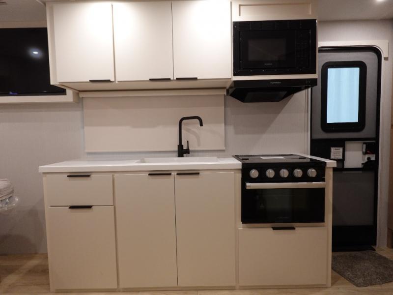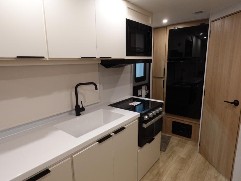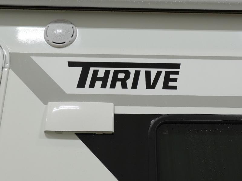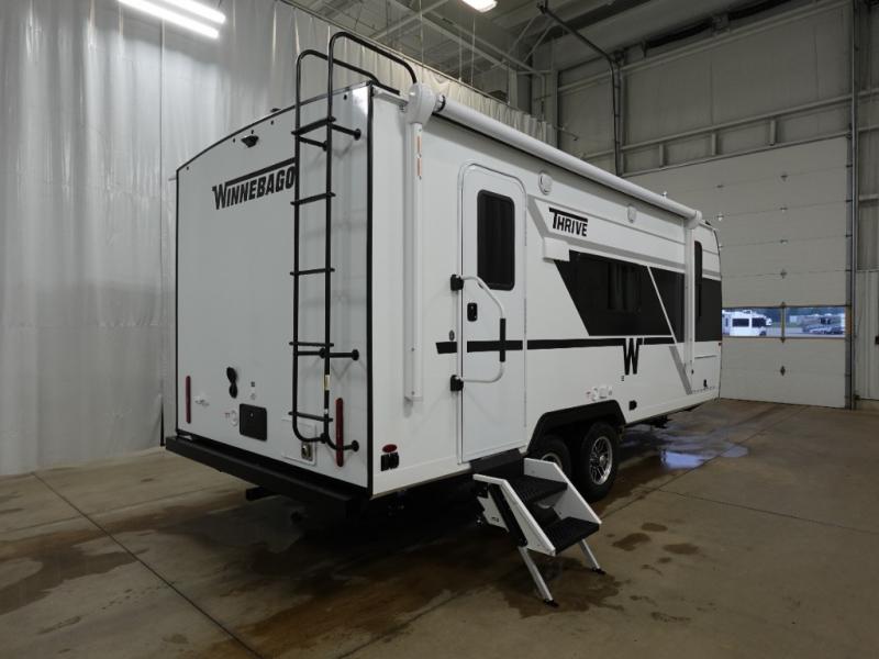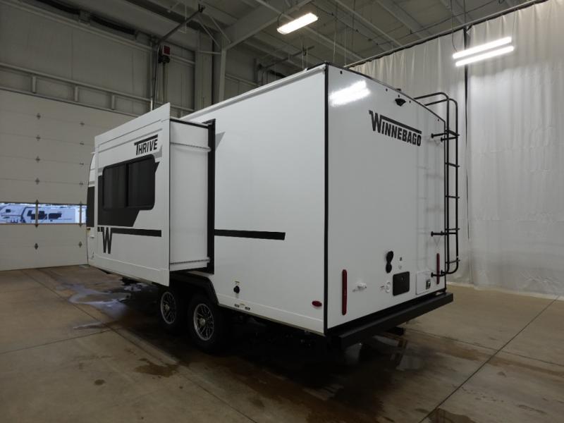 With any Thrive travel trailer by Winnebago, you can camp with functionality, comfort, and convenience! The tinted and frameless front window will be the first thing that catches your eye, and the fiberglass sidewalls with Azdel Onboard provide a durable trailer made to last. There is also an exterior ladder, along with front radius profile lights, power stabilizer jacks, and a powered awning with LED lighting to name a few exterior features. You will stay powered up by the 30-amp power cord and 200-watt solar panel, plus there is a tankless water heater for endless hot showers. Inside, you'll love the custom Winnebago furniture, carpetless side outs, molded fiberglass countertops, and residential recessed ceiling lights to keep your space well lit!