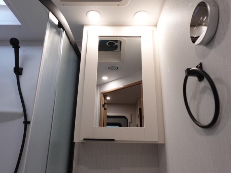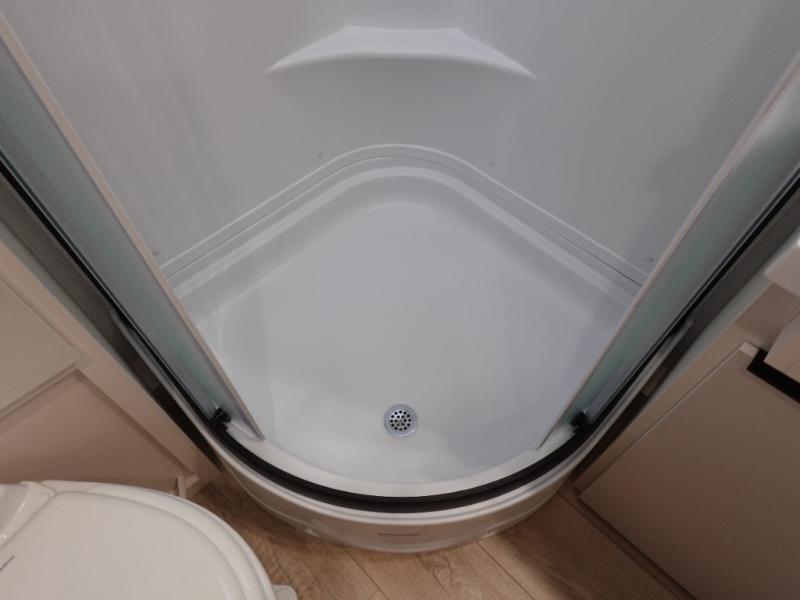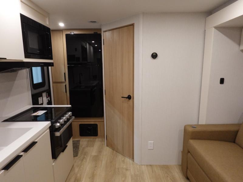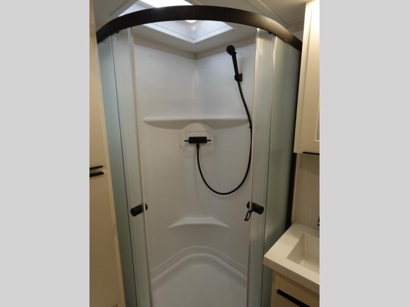 It will be so easy to enjoy camping trips in this compact travel trailer. The jack knife sofa slide provides more floor space plus a place for an overnight guest to sleep. You'll find a king-size bed up front with a privacy curtain and dual bedroom wardrobes to keep your things tidy. A recessed three burner cooktop with an oven will let you make meals each day, and the 10.6 cu. ft. 12V refrigerator will keep your cold items fresh. There is also a pantry with pull-out and removable shelves for added storage space. The full bath includes a power vent fan and a shower skylight that will give you more lighting and extra head room as you get ready each day!