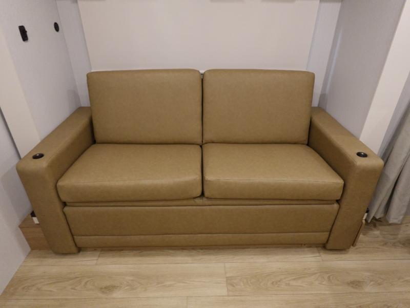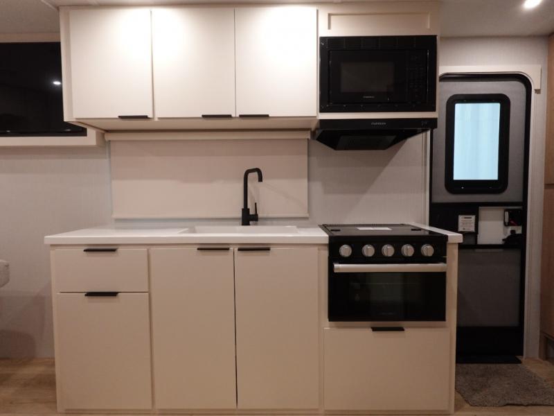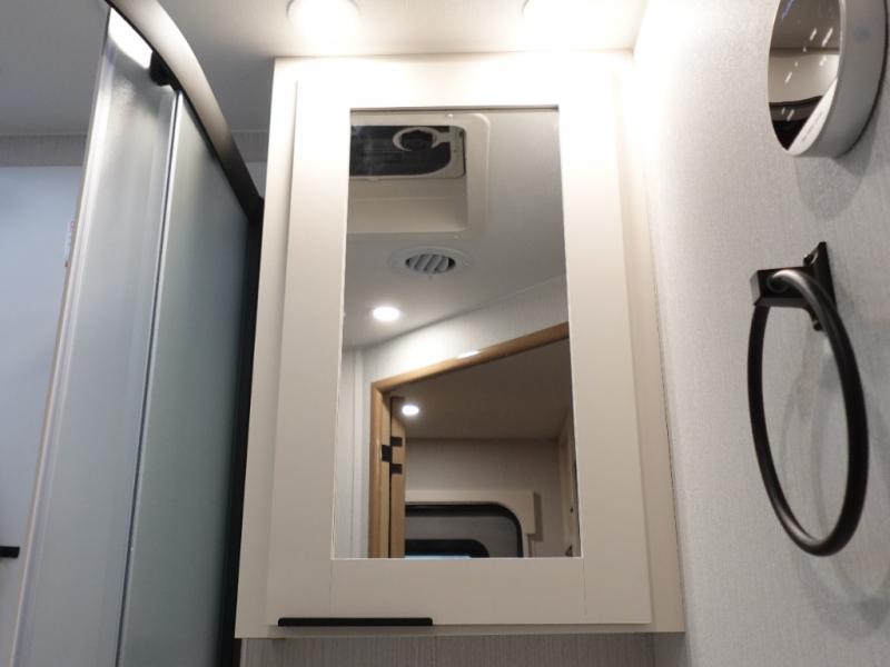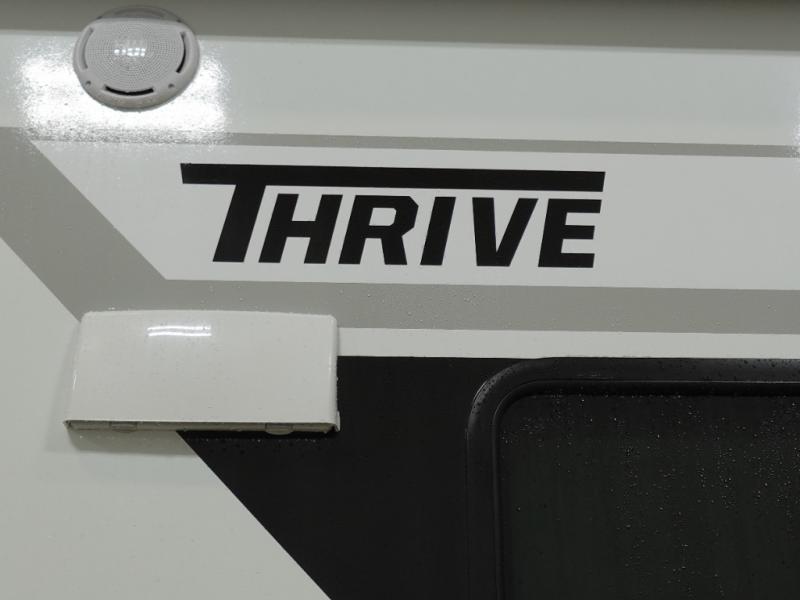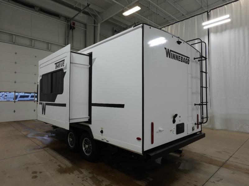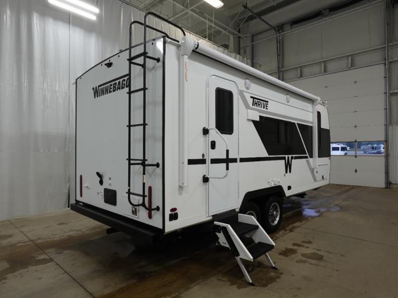 With any Thrive travel trailer by Winnebago, you can camp with functionality, comfort, and convenience! The tinted and frameless front window will be the first thing that catches your eye, and the fiberglass sidewalls with Azdel Onboard provide a durable trailer made to last. There is also an exterior ladder, along with front radius profile lights, power stabilizer jacks, and a powered awning with LED lighting to name a few exterior features. You will stay powered up by the 30-amp power cord and 200-watt solar panel, plus there is a tankless water heater for endless hot showers. Inside, you'll love the custom Winnebago furniture, carpetless side outs, molded fiberglass countertops, and residential recessed ceiling lights to keep your space well lit!
