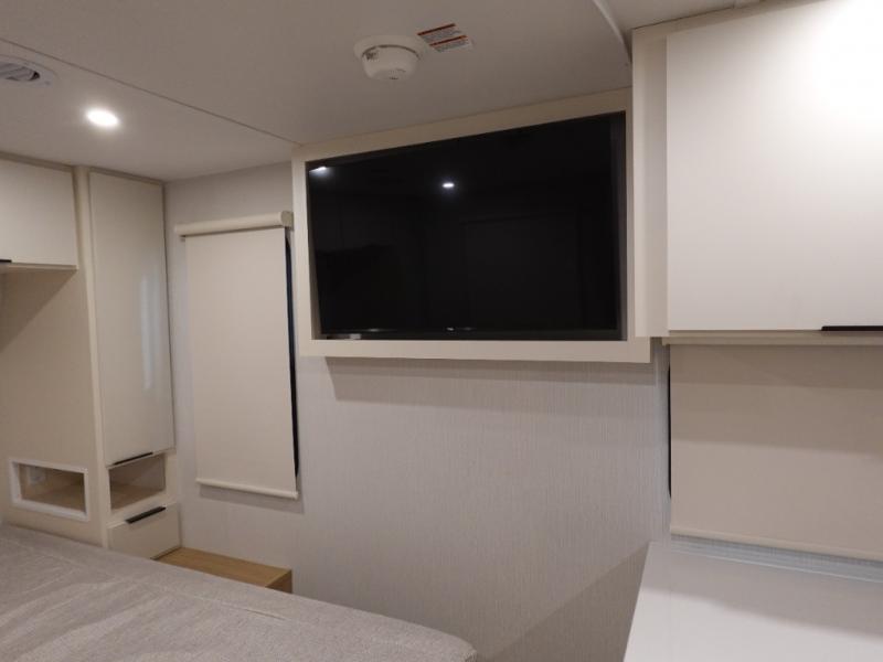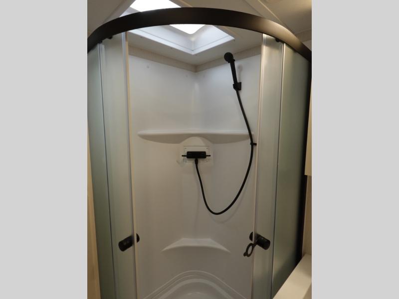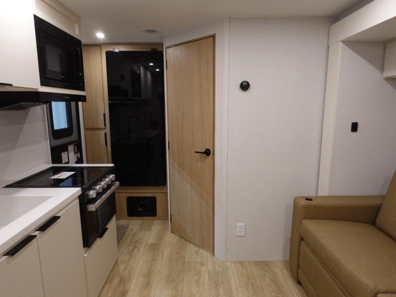 It will be so easy to enjoy camping trips in this compact travel trailer. The jack knife sofa slide provides more floor space plus a place for an overnight guest to sleep. You'll find a king-size bed up front with a privacy curtain and dual bedroom wardrobes to keep your things tidy. A recessed three burner cooktop with an oven will let you make meals each day, and the 10.6 cu. ft. 12V refrigerator will keep your cold items fresh. There is also a pantry with pull-out and removable shelves for added storage space. The full bath includes a power vent fan and a shower skylight that will give you more lighting and extra head room as you get ready each day!