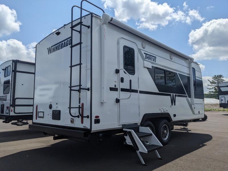 With any Thrive travel trailer by Winnebago, you can camp with functionality, comfort, and convenience! The tinted and frameless front window will be the first thing that catches your eye, and the fiberglass sidewalls with Azdel Onboard provide a durable trailer made to last. There is also an exterior ladder, along with front radius profile lights, power stabilizer jacks, and a powered awning with LED lighting to name a few exterior features. You will stay powered up by the 30-amp power cord and 200-watt solar panel, plus there is a tankless water heater for endless hot showers. Inside, you'll love the custom Winnebago furniture, carpetless side outs, molded fiberglass countertops, and residential recessed ceiling lights to keep your space well lit!