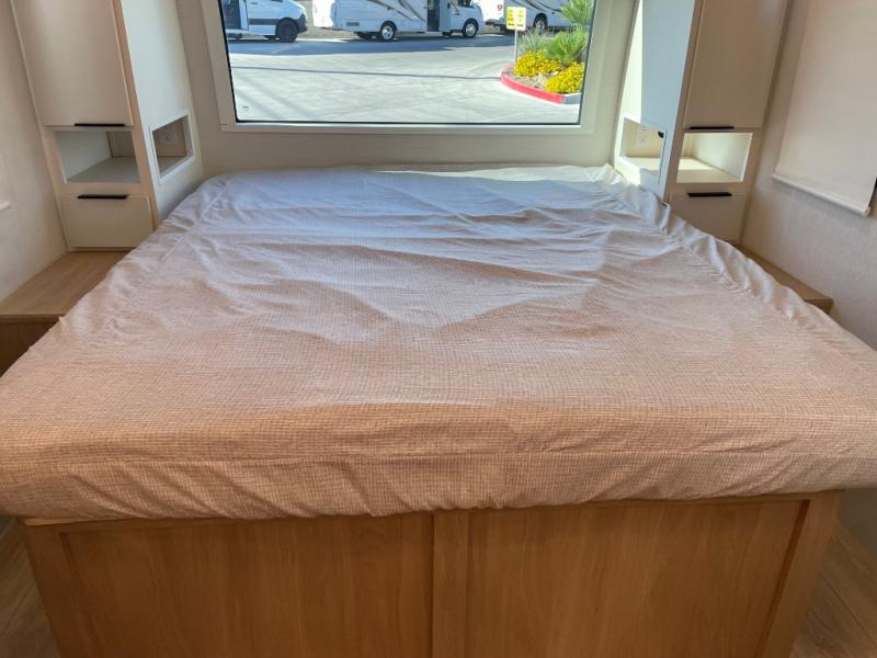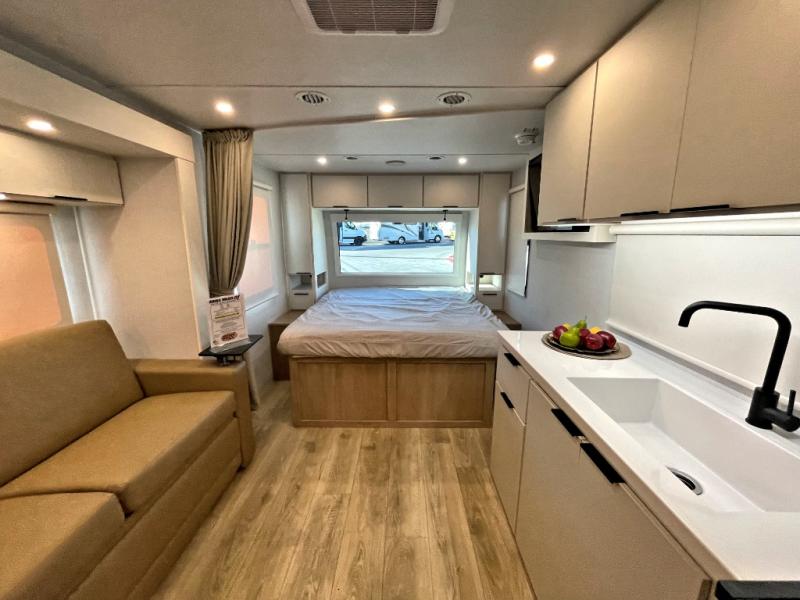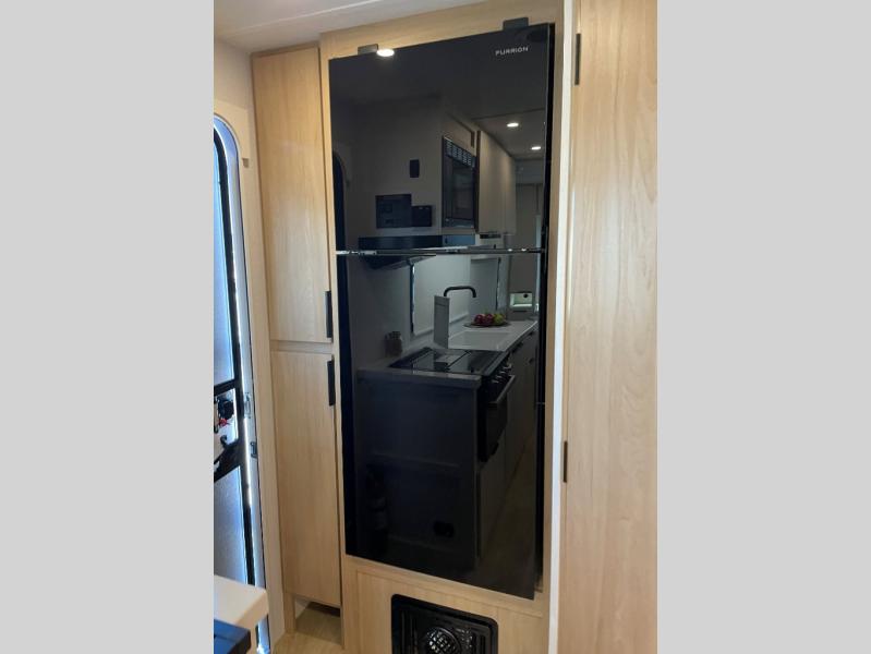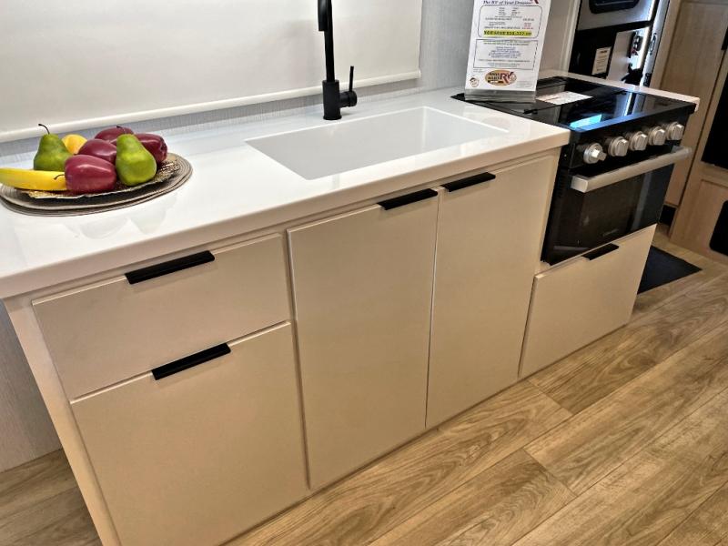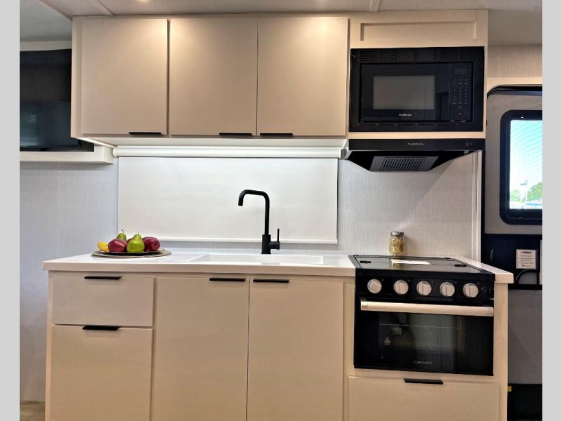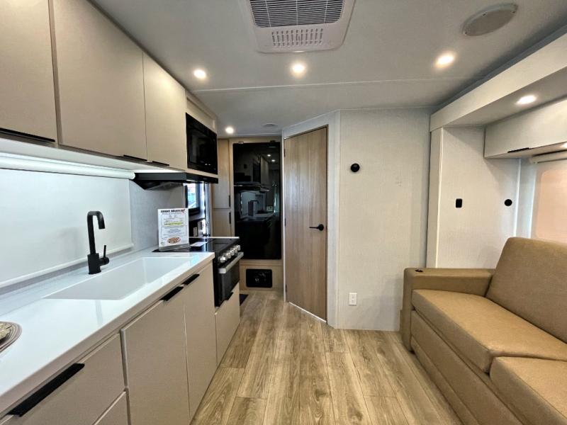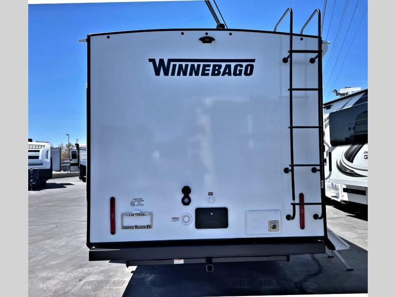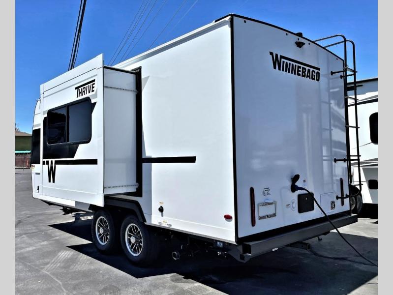 With any Thrive travel trailer by Winnebago, you can camp with functionality, comfort, and convenience! The tinted and frameless front window will be the first thing that catches your eye, and the fiberglass sidewalls with Azdel Onboard provide a durable trailer made to last. There is also an exterior ladder, along with front radius profile lights, power stabilizer jacks, and a powered awning with LED lighting to name a few exterior features. You will stay powered up by the 30-amp power cord and 200-watt solar panel, plus there is a tankless water heater for endless hot showers. Inside, you'll love the custom Winnebago furniture, carpetless side outs, molded fiberglass countertops, and residential recessed ceiling lights to keep your space well lit!