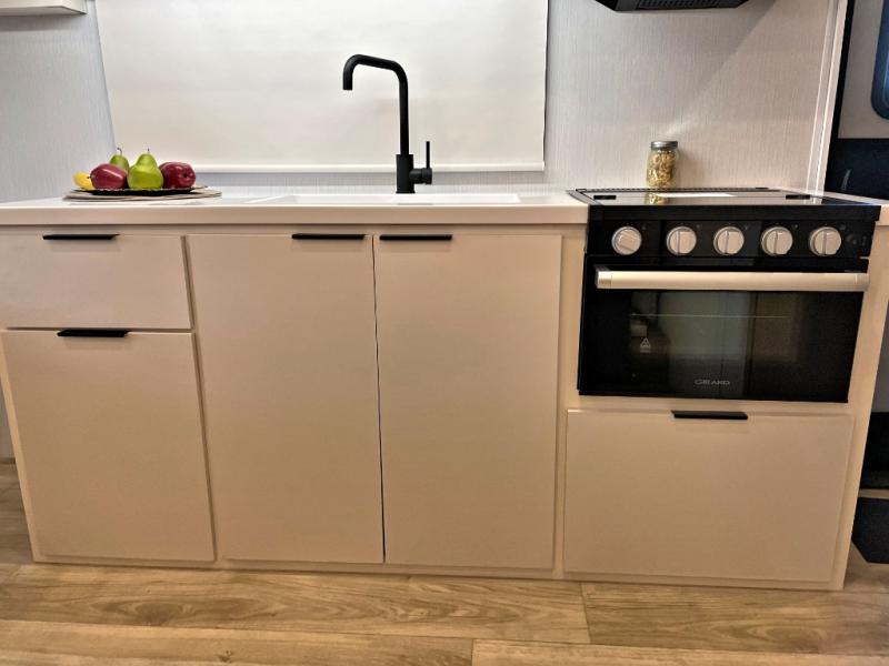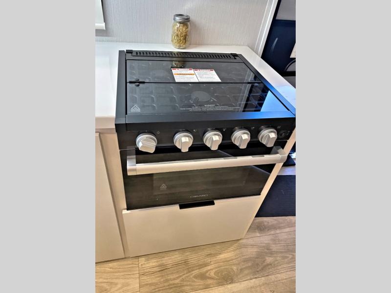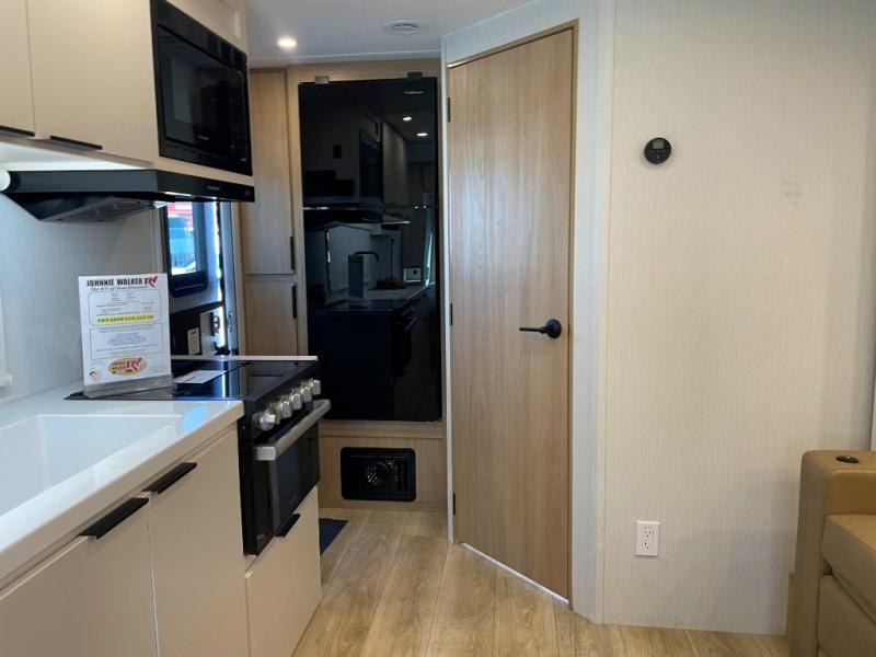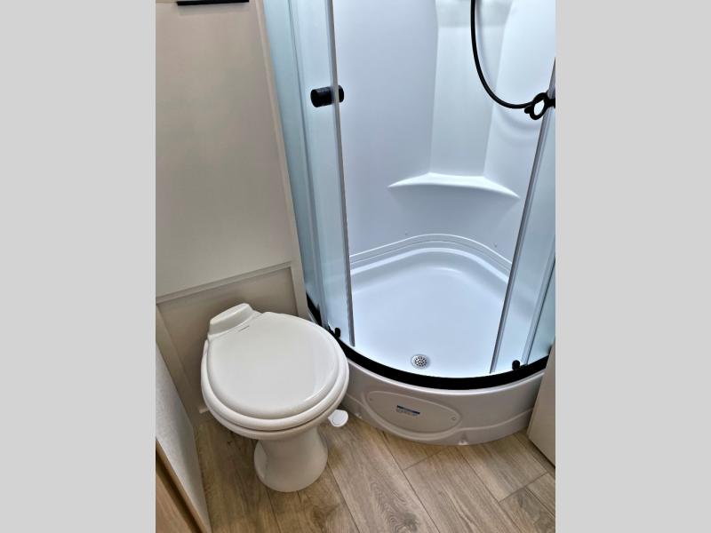 It will be so easy to enjoy camping trips in this compact travel trailer. The jack knife sofa slide provides more floor space plus a place for an overnight guest to sleep. You'll find a king-size bed up front with a privacy curtain and dual bedroom wardrobes to keep your things tidy. A recessed three burner cooktop with an oven will let you make meals each day, and the 10.6 cu. ft. 12V refrigerator will keep your cold items fresh. There is also a pantry with pull-out and removable shelves for added storage space. The full bath includes a power vent fan and a shower skylight that will give you more lighting and extra head room as you get ready each day!