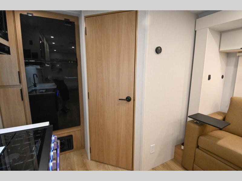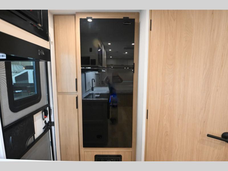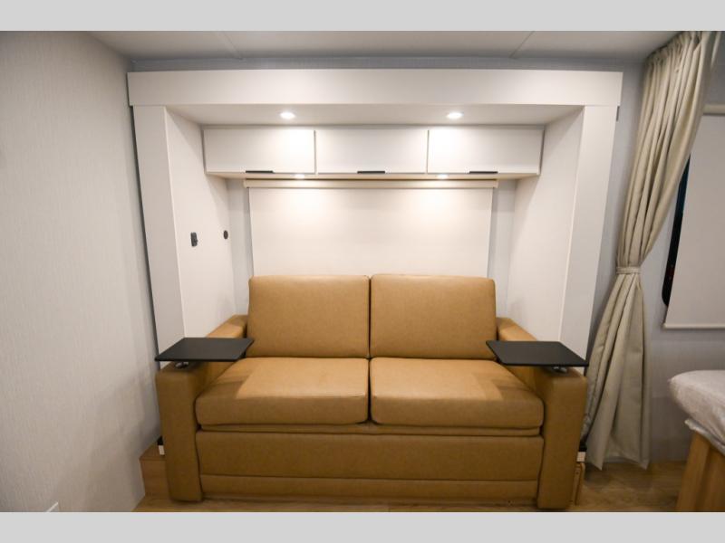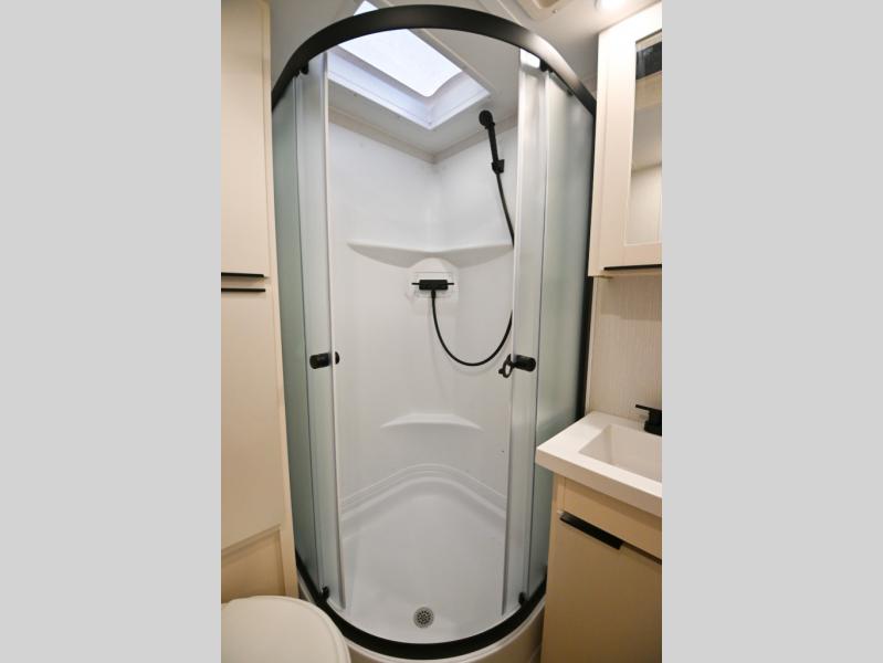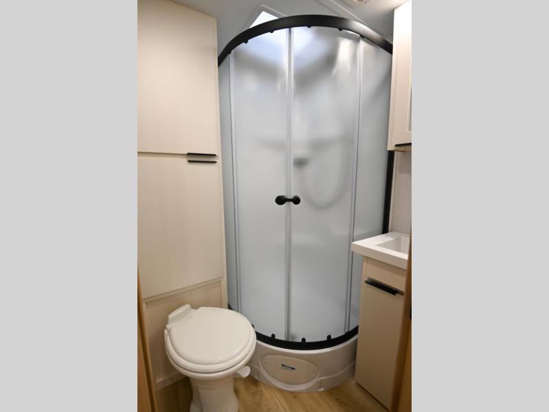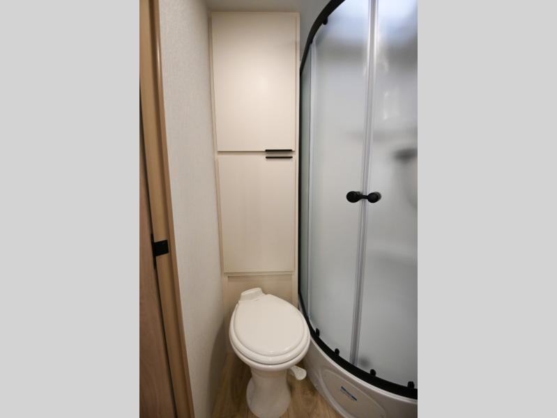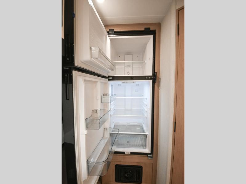 It will be so easy to enjoy camping trips in this compact travel trailer. The jack knife sofa slide provides more floor space plus a place for an overnight guest to sleep. You'll find a king-size bed up front with a privacy curtain and dual bedroom wardrobes to keep your things tidy. A recessed three burner cooktop with an oven will let you make meals each day, and the 10.6 cu. ft. 12V refrigerator will keep your cold items fresh. There is also a pantry with pull-out and removable shelves for added storage space. The full bath includes a power vent fan and a shower skylight that will give you more lighting and extra head room as you get ready each day!