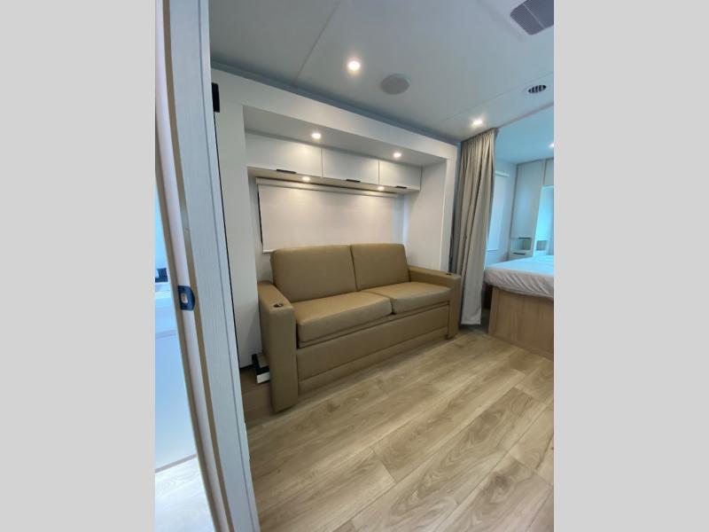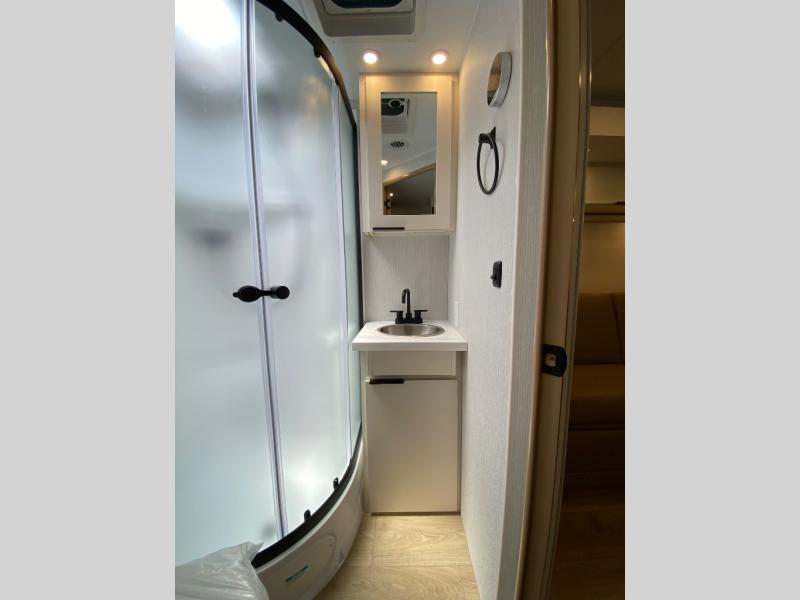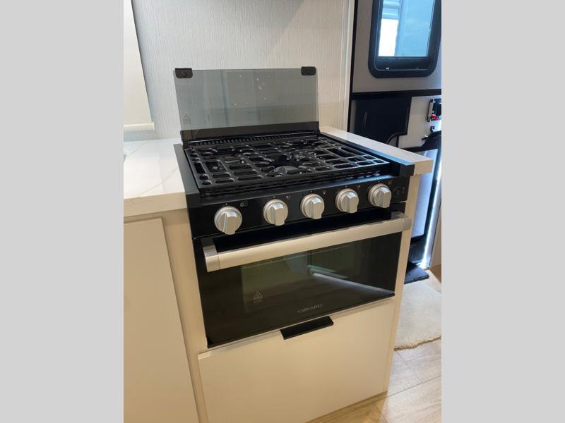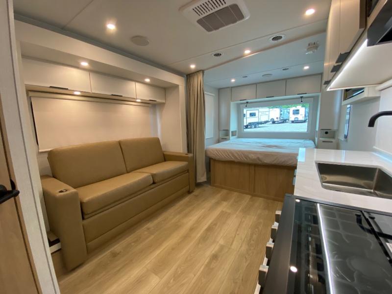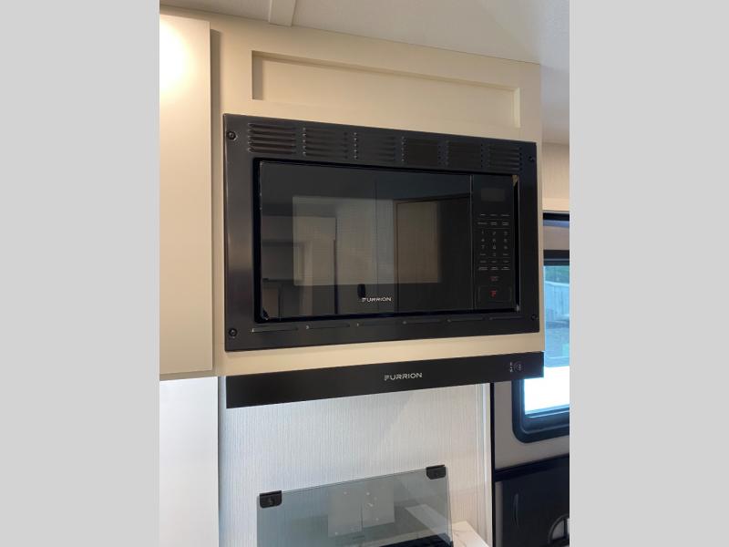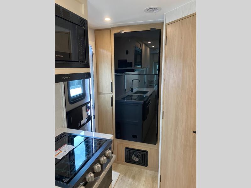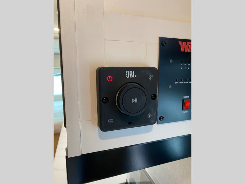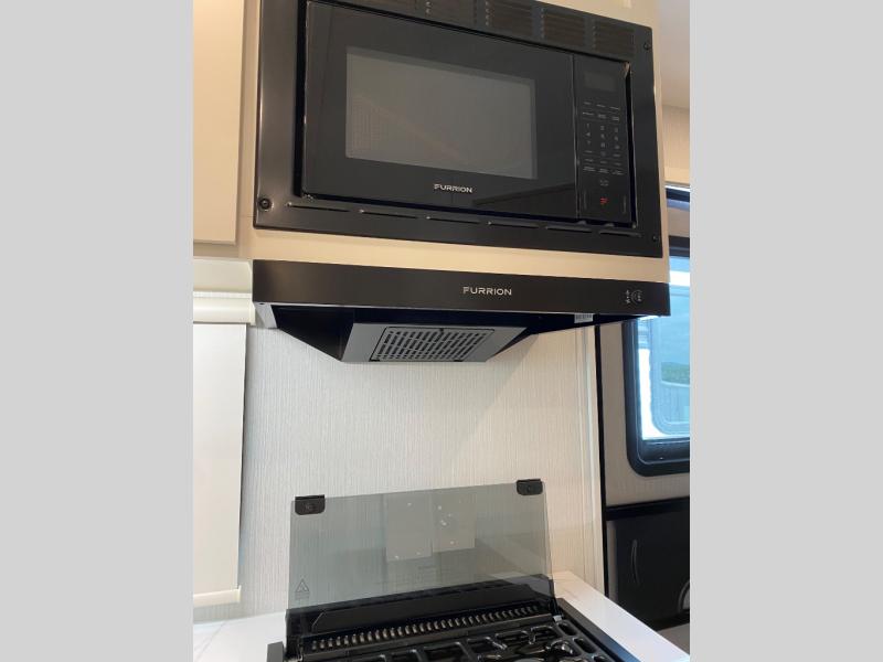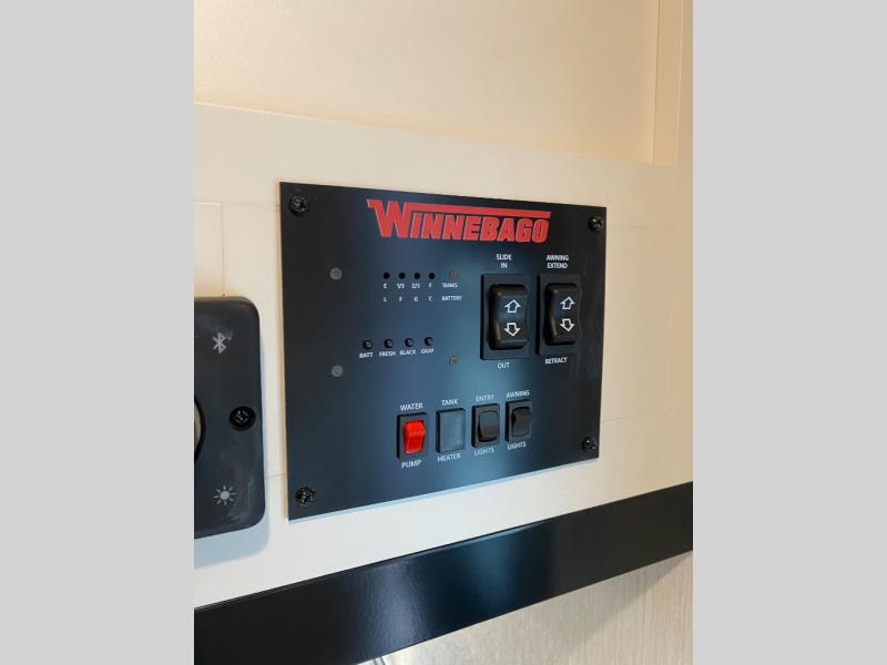 With any Thrive travel trailer by Winnebago, you can camp with functionality, comfort, and convenience! The tinted and frameless front window will be the first thing that catches your eye, and the fiberglass sidewalls with Azdel Onboard provide a durable trailer made to last. There is also an exterior ladder, along with front radius profile lights, power stabilizer jacks, and a powered awning with LED lighting to name a few exterior features. You will stay powered up by the 30-amp power cord and 200-watt solar panel, plus there is a tankless water heater for endless hot showers. Inside, you'll love the custom Winnebago furniture, carpetless side outs, molded fiberglass countertops, and residential recessed ceiling lights to keep your space well lit!