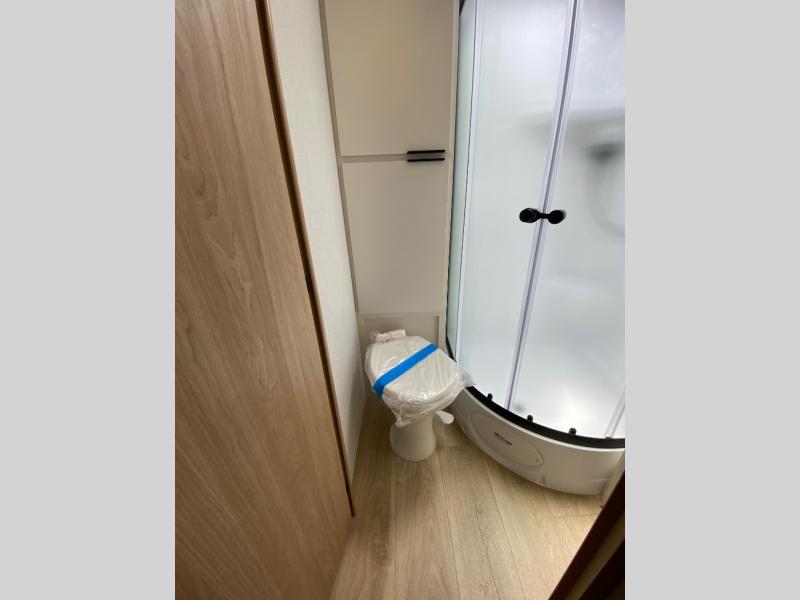 It will be so easy to enjoy camping trips in this compact travel trailer. The jack knife sofa slide provides more floor space plus a place for an overnight guest to sleep. You'll find a king-size bed up front with a privacy curtain and dual bedroom wardrobes to keep your things tidy. A recessed three burner cooktop with an oven will let you make meals each day, and the 10.6 cu. ft. 12V refrigerator will keep your cold items fresh. There is also a pantry with pull-out and removable shelves for added storage space. The full bath includes a power vent fan and a shower skylight that will give you more lighting and extra head room as you get ready each day!