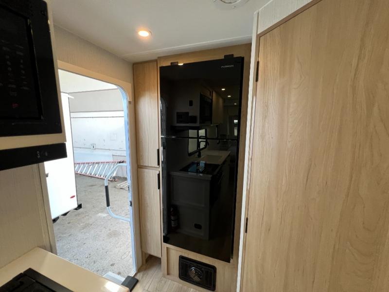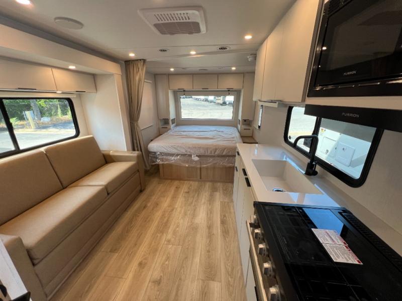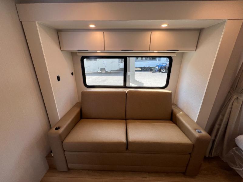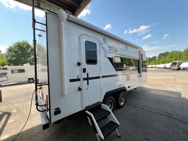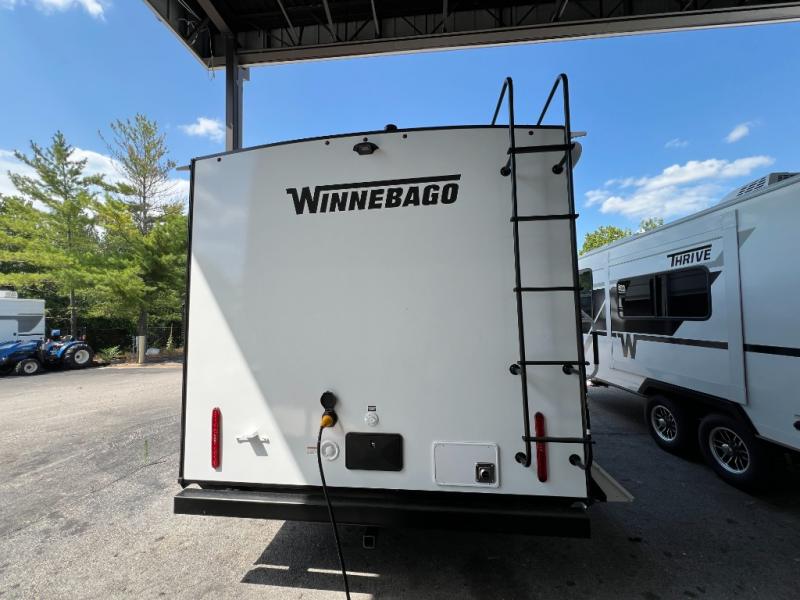 With any Thrive travel trailer by Winnebago, you can camp with functionality, comfort, and convenience! The tinted and frameless front window will be the first thing that catches your eye, and the fiberglass sidewalls with Azdel Onboard provide a durable trailer made to last. There is also an exterior ladder, along with front radius profile lights, power stabilizer jacks, and a powered awning with LED lighting to name a few exterior features. You will stay powered up by the 30-amp power cord and 200-watt solar panel, plus there is a tankless water heater for endless hot showers. Inside, you'll love the custom Winnebago furniture, carpetless side outs, molded fiberglass countertops, and residential recessed ceiling lights to keep your space well lit!
