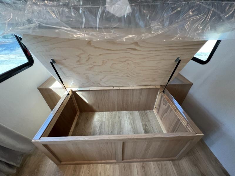 It will be so easy to enjoy camping trips in this compact travel trailer. The jack knife sofa slide provides more floor space plus a place for an overnight guest to sleep. You'll find a king-size bed up front with a privacy curtain and dual bedroom wardrobes to keep your things tidy. A recessed three burner cooktop with an oven will let you make meals each day, and the 10.6 cu. ft. 12V refrigerator will keep your cold items fresh. There is also a pantry with pull-out and removable shelves for added storage space. The full bath includes a power vent fan and a shower skylight that will give you more lighting and extra head room as you get ready each day!