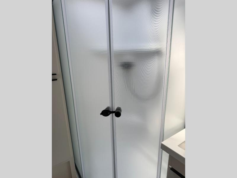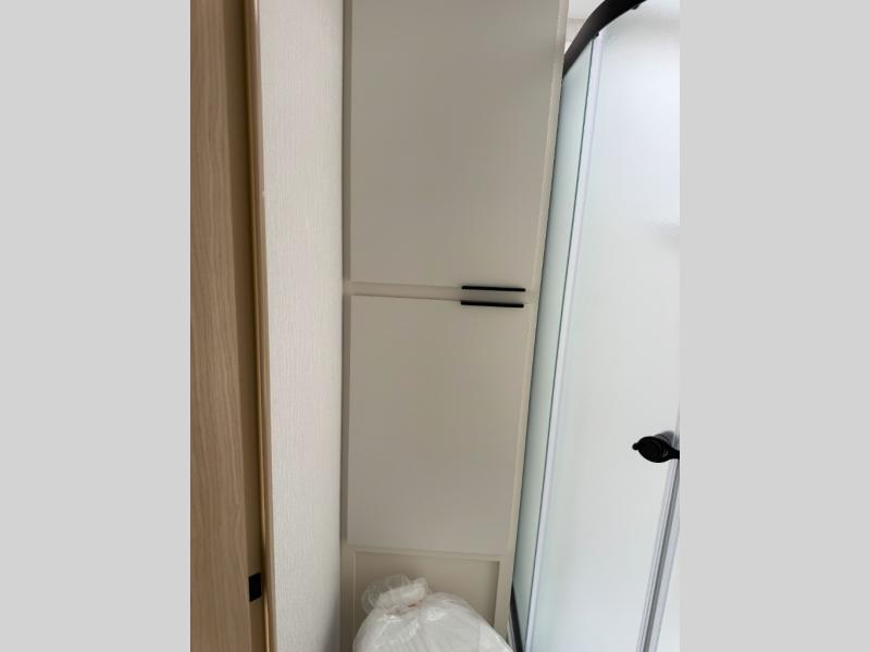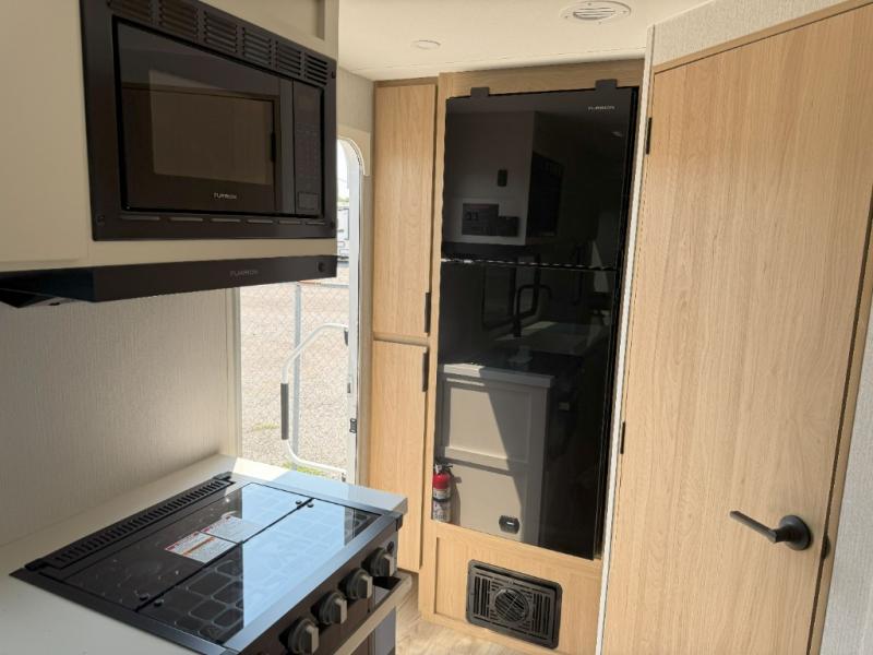 It will be so easy to enjoy camping trips in this compact travel trailer. The jack knife sofa slide provides more floor space plus a place for an overnight guest to sleep. You'll find a king-size bed up front with a privacy curtain and dual bedroom wardrobes to keep your things tidy. A recessed three burner cooktop with an oven will let you make meals each day, and the 10.6 cu. ft. 12V refrigerator will keep your cold items fresh. There is also a pantry with pull-out and removable shelves for added storage space. The full bath includes a power vent fan and a shower skylight that will give you more lighting and extra head room as you get ready each day!