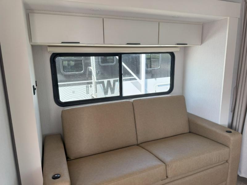 With any Thrive travel trailer by Winnebago, you can camp with functionality, comfort, and convenience! The tinted and frameless front window will be the first thing that catches your eye, and the fiberglass sidewalls with Azdel Onboard provide a durable trailer made to last. There is also an exterior ladder, along with front radius profile lights, power stabilizer jacks, and a powered awning with LED lighting to name a few exterior features. You will stay powered up by the 30-amp power cord and 200-watt solar panel, plus there is a tankless water heater for endless hot showers. Inside, you'll love the custom Winnebago furniture, carpetless side outs, molded fiberglass countertops, and residential recessed ceiling lights to keep your space well lit!