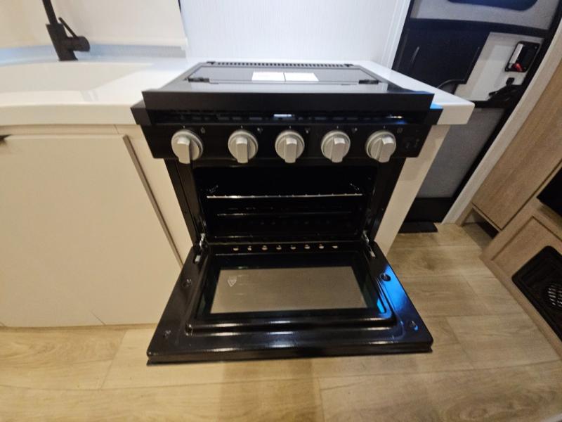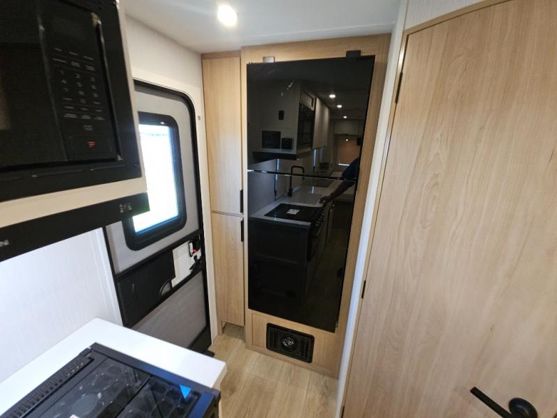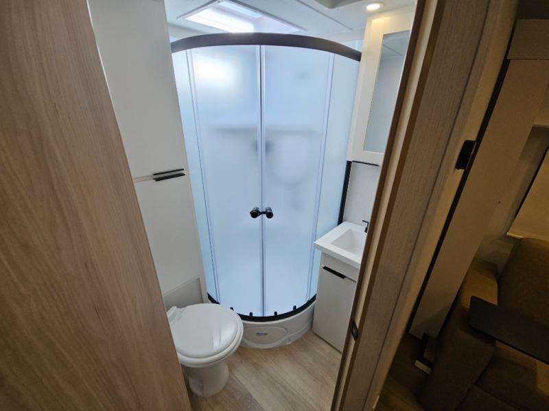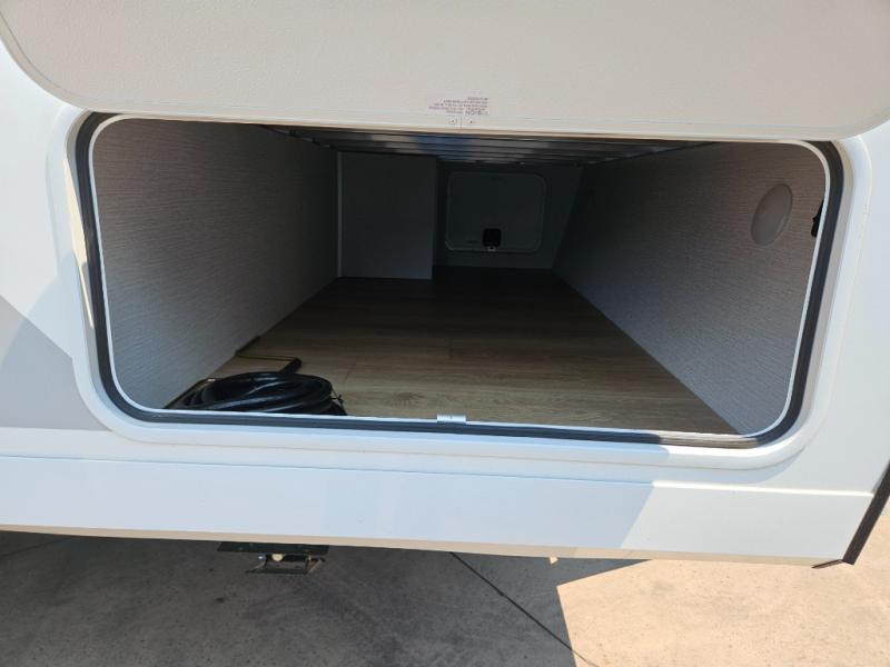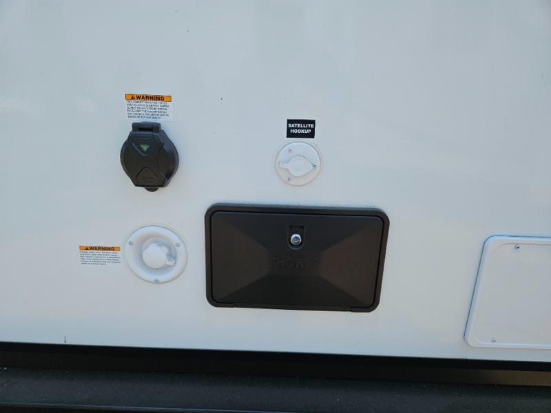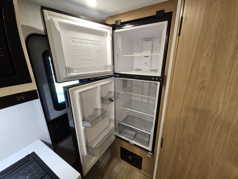 It will be so easy to enjoy camping trips in this compact travel trailer. The jack knife sofa slide provides more floor space plus a place for an overnight guest to sleep. You'll find a king-size bed up front with a privacy curtain and dual bedroom wardrobes to keep your things tidy. A recessed three burner cooktop with an oven will let you make meals each day, and the 10.6 cu. ft. 12V refrigerator will keep your cold items fresh. There is also a pantry with pull-out and removable shelves for added storage space. The full bath includes a power vent fan and a shower skylight that will give you more lighting and extra head room as you get ready each day!