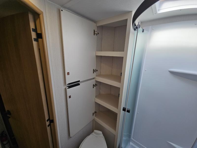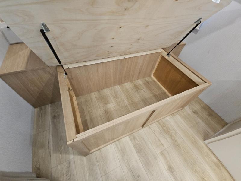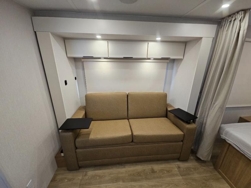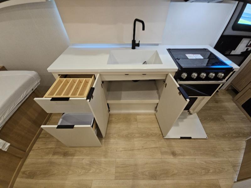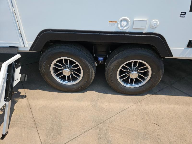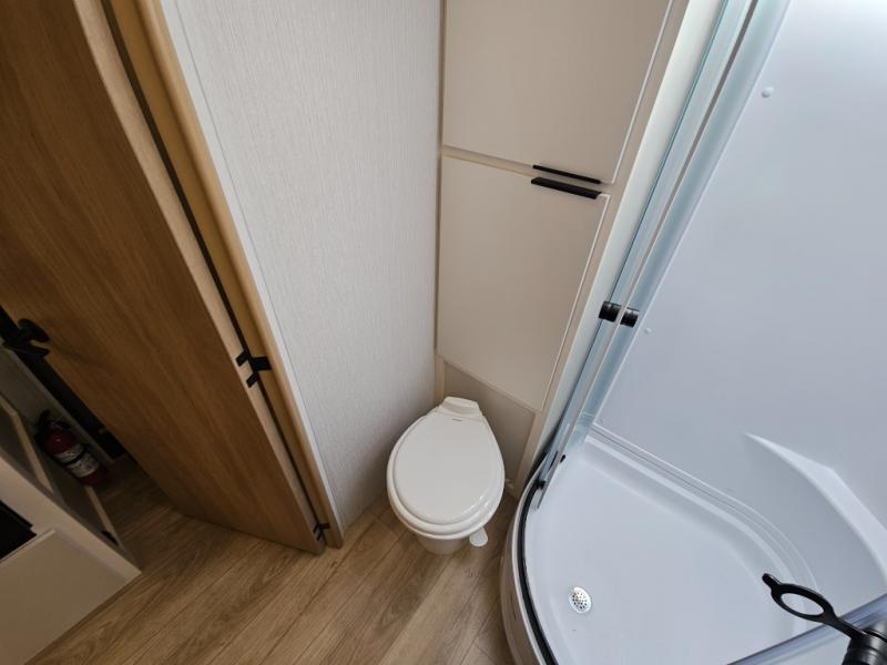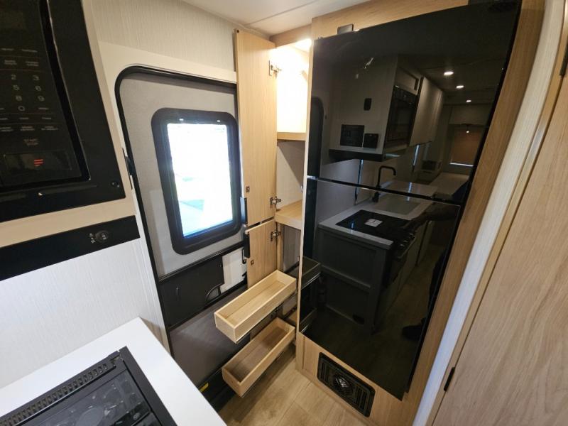 It will be so easy to enjoy camping trips in this compact travel trailer. The jack knife sofa slide provides more floor space plus a place for an overnight guest to sleep. You'll find a king-size bed up front with a privacy curtain and dual bedroom wardrobes to keep your things tidy. A recessed three burner cooktop with an oven will let you make meals each day, and the 10.6 cu. ft. 12V refrigerator will keep your cold items fresh. There is also a pantry with pull-out and removable shelves for added storage space. The full bath includes a power vent fan and a shower skylight that will give you more lighting and extra head room as you get ready each day!