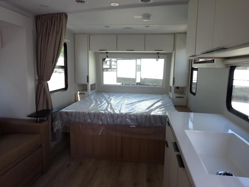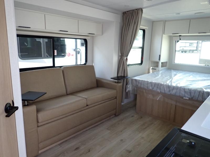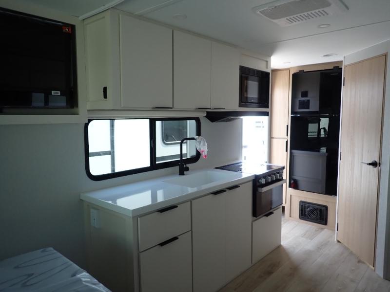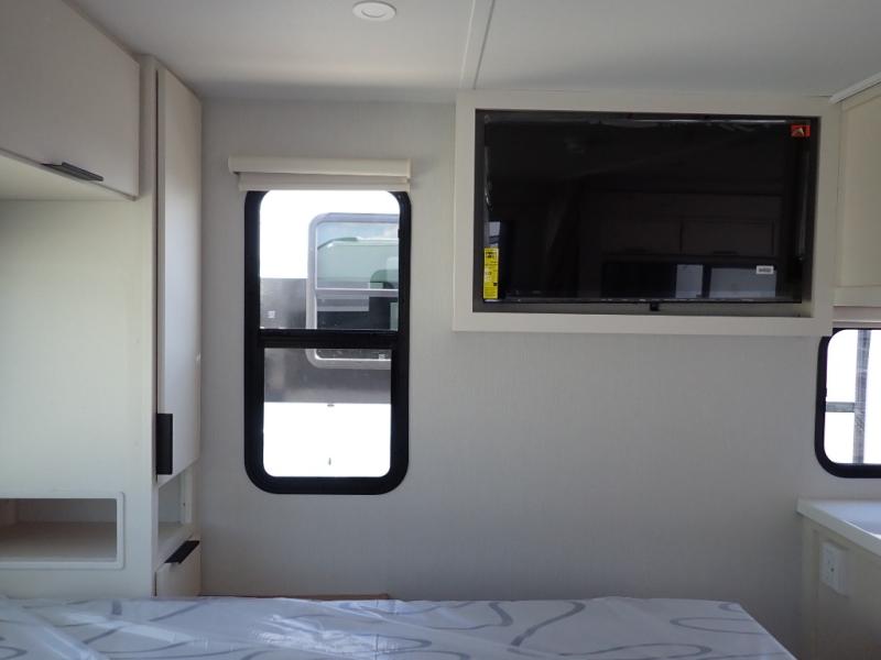 It will be so easy to enjoy camping trips in this compact travel trailer. The jack knife sofa slide provides more floor space plus a place for an overnight guest to sleep. You'll find an Olympic queen bed up front with a privacy curtain and dual bedroom wardrobes to keep your things tidy. A recessed three burner cooktop with an oven will let you make meals each day, and the 10.6 cu. ft. 12V refrigerator will keep your cold items fresh. There is also a pantry with pull-out shelves for added storage space. The full bath includes a power vent fan and a shower skylight that will give you more lighting and extra head room as you get ready each day!
