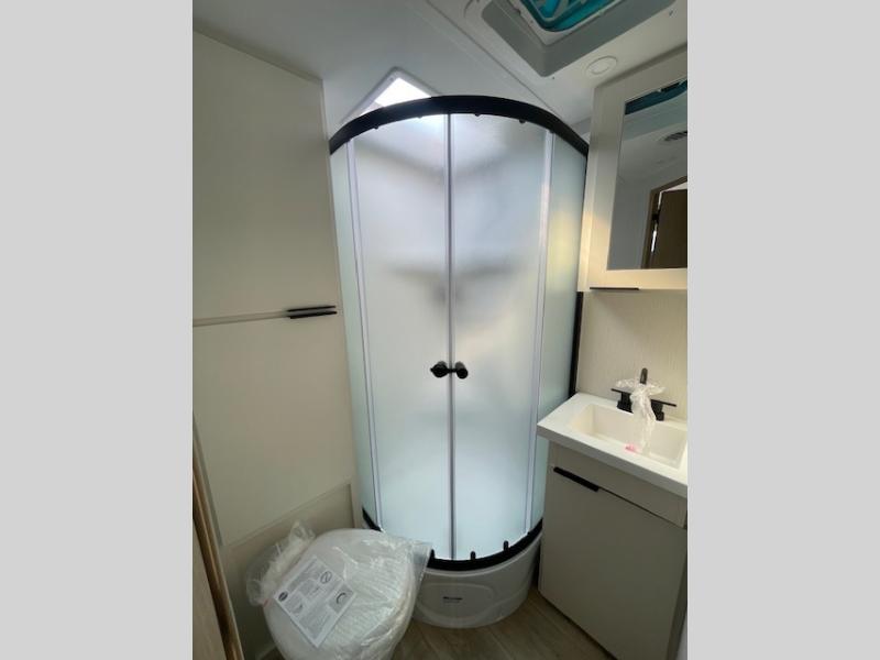 With any Thrive travel trailer by Winnebago, you can camp with functionality, comfort, and convenience! The large front viewing window will be the first thing that catches your eye, and the fiberglass sidewalls with Azdel Onboard provide a durable trailer made to last. There is also an exterior ladder, along with front radius profile lights, power stabilizer jacks, and a powered awning with LED lighting to name a few exterior features. You will stay powered up by the 30-amp power cord and 200-watt solar panel, plus there is a tankless water heater for endless hot showers. Inside, you'll love the custom Winnebago furniture, carpetless side outs, molded fiberglass countertops, and residential recessed ceiling lights to keep your space well lit!
