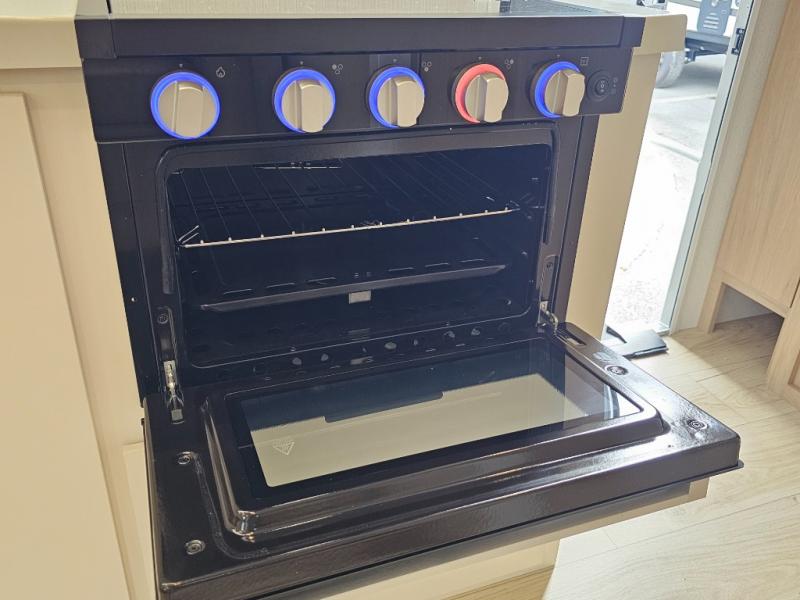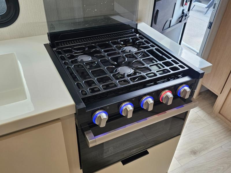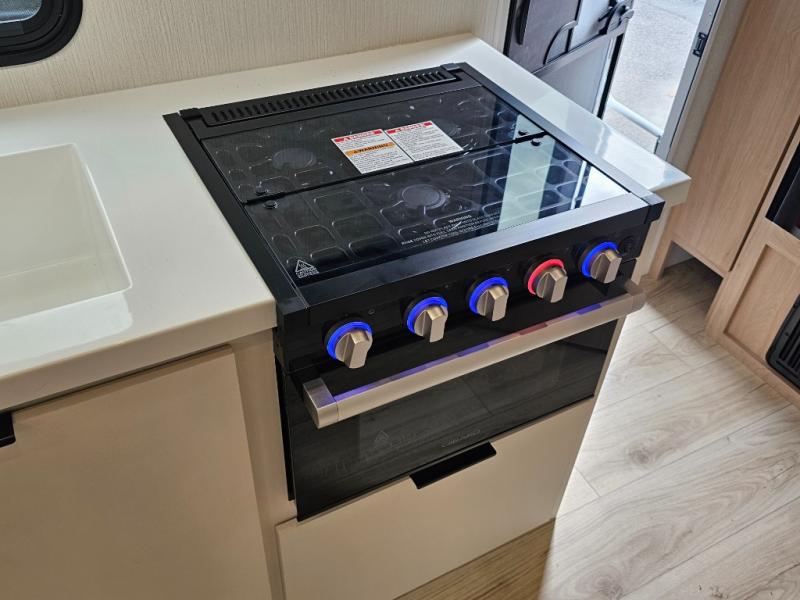 Recessed three-burner cooktop with oven for full meal preparation on the go.