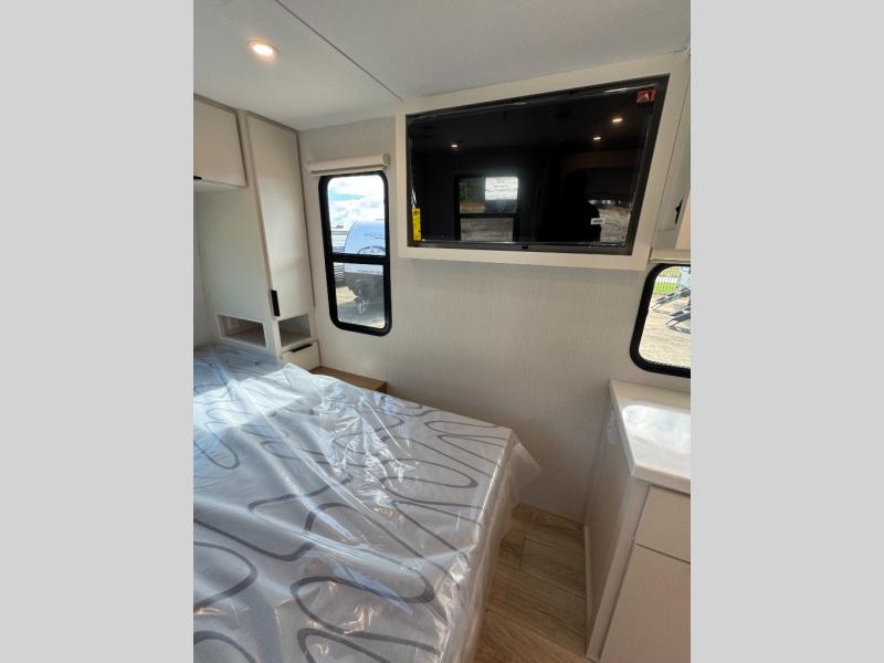 It will be so easy to enjoy camping trips in this compact travel trailer. The jack knife sofa slide provides more floor space plus a place for an overnight guest to sleep. You'll find an Olympic queen bed up front with a privacy curtain and dual bedroom wardrobes to keep your things tidy. A recessed three burner cooktop with an oven will let you make meals each day, and the 10.6 cu. ft. 12V refrigerator will keep your cold items fresh. There is also a pantry with pull-out shelves for added storage space. The full bath includes a power vent fan and a shower skylight that will give you more lighting and extra head room as you get ready each day!